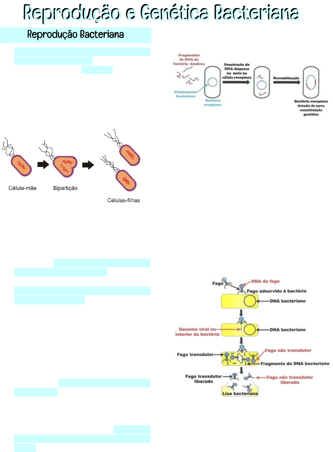 35 @lilyfazvet O tipo de reprodução mais comum nas bactérias é o assexuado, que acontece na forma de uma bipartição, também chamada de cissiparidade ou divisão binária; Durante a bipartição, ocorre a divisão de uma célula em duas por mitose, cada uma com o mesmo genoma da “célula-mãe”; O processo se inicia com a duplicação do DNA bacteriano e, logo em seguida, cada nova cadeia se liga à membrana plasmática e essa se invagina até que ocorra a divisão da célula em duas; Entretanto, as bactérias também podem se reproduzir sexuadamente; Esse processo ocorre quando há transferência de fragmentos de DNA de uma célula para outra; Depois de transferido, o fragmento de DNA da bactéria doadora se recombina com o da receptora, produzindo cromossomos com novas misturas de genes que serão transmitidos para as células-filhas quando a bactéria se dividir; A transferência de fragmentos de DNA de uma bactéria para outra pode ocorrer de três maneiras: transformação, transdução e conjugação. Transformacao Durante a transformação, a bactéria absorve moléculas de DNA dispersas no meio (DNA de bactérias mortas, por exemplo); Esse processo ocorre espontaneamente na natureza. Transducao Durante a transdução, fragmentos de DNA são transferidas de uma bactéria para a outra usando víruscomo vetor (bacteriófagos); Ao se montar dentro das bactérias, os vírus podem incluir pedaços de DNA da bactéria que lhes serviu de hospedeira; Ao infectar outra bactéria, o vírus que leva o DNA bacteriano o transfere junto com o seu e, caso a bactéria sobreviva à infecção viral, pode passar a incluir os genes de outra bactéria em seu genoma. Conjugacao Na conjugação, fragmentos de DNA passam diretamente de uma bactéria doadora (‘macho’) para uma receptora 36 @lilyfazvet (‘fêmea’) através dos pili, que as bactérias ‘macho’ possuem em sua superfície; Dessa forma, o fragmento de DNA transferido se recombina com o cromossomo da bactéria ‘fêmea’, produzindo novas misturas genéticas, que serão transmitidas às células-filhas na próxima divisão celular. O genoma bacteriano consiste nas informações genéticas (cromossomos e plasmídeos) presentes nas células; A informação genética das células está codificada na sequência de nucleotídeos de seu DNA, tanto nuclear quanto mitocondrial; O fluxo dessa informação genética se dá em sua expressão a qual é feita pela transcrição do DNA em RNA e a tradução desse RNA em proteínas; Nos seres eucariontes, a transcrição acontece no núcleo para depois ser sintetizada a proteína pela tradução no citoplasma; Já nos seres procariotos, como há a ausência do núcleo, os dois processos ocorrem no mesmo meio; Plasmideos Os plasmídeos são moléculas de DNA, na maioria das vezes circular, de dupla fita; Eles são menores que os cromossomos e carregam informação genética não essencial a célula, mas mesmo assim podem conferir uma vantagem seletiva, sob determinadas condições; Importância dos plasmídeos: - carreiam genes que exercem profunda influência no fenótipo da célula; - plasmídeo de resistência – ameaça à terapia antimicrobiana. Variabilidade genetica As bactérias podem sofrer variabilidade genética a partir da mutação, que é um processo vertical, que ocorre durante a replicação do cromossomo; e da recombinação genética, que é um processo horizontal, que ocorre durante a transformação, transdução e conjugação. Mutacao Durante a mutação, a alteração genética pode modificar o produto (proteína) codificado pelo gene; As mutações podem ser: – neutras ou silenciosas: código genético degenerado (um mesmo aminoácido pode ser codificado por mais de um códon); Cromossomo Bacteriano O cromossomo bacteriano consiste, na maioria das vezes, em uma molécula de DNA dupla fita circular disperso no citoplasma. Ele possui todas as informações essenciais para a sobrevivência da célula. 37 @lilyfazvet – desvantajosas: a célula perde uma característica fenotípica de que ela necessita; – benéficas: a enzima alterada codificada pelo gene mutante possui atividade nova ou intensificada que beneficia a célula. Além disso, temos as mutações missense, que causam substituições de aminoácidos; As mutações também podem ser divididas em espontâneas e induzidas; As mutações espontâneas ocorrem naturalmente sem a adição de um agente mutagênico específico, geralmente decorrente de erros cometidos pela DNA polimerase; Já as mutações induzidas são resultado da exposição do microrganismo a um agente mutagênico que é capaz de introduzir danos ou alterações no DNA. Recombinacao Genetica A recombinação genética pode ocorrer de diferentes formas em diferentes estágios do fluxo de informações genéticas bacterianas; Durante a transformação há a incorporação de DNA livre, geralmente decorrente de lise celular; Na conjugação ocorre a transferência de uma bactéria para outra que envolve o contato entre as duas células; E na transdução ocorre a transferência de material genético mediada por bacteriófago. Fatores de Virulencia Os fatores de virulência são as estruturas, produtos ou estratégias que contribuem para o aumento da capacidade da bactéria de causar doença; 38 @lilyfazvet As bactérias podem causar doença por dois mecanismos principais: - invasão e inflamação: as bactérias podem aderir às células do hospedeiro, penetrar e se multiplicar no local nos tecidos sadios, induzindo a resposta inflamatória (eritema, edema, calor e dor); - produção de toxinas e/ou enzimas: – exotoxinas: polipeptídeos secretados pelas células; – endotoxinas: LPS presentes na parede celular de Gram negativas. O dano pode ser direto, quando a própria aderência e invasão da bactéria causa danos elise das células hospedeiro (Ex.: Shigella, E. coli, Salmonella e N. gonorrhoeae) ou por meio de adesão (cápsula e fímbr