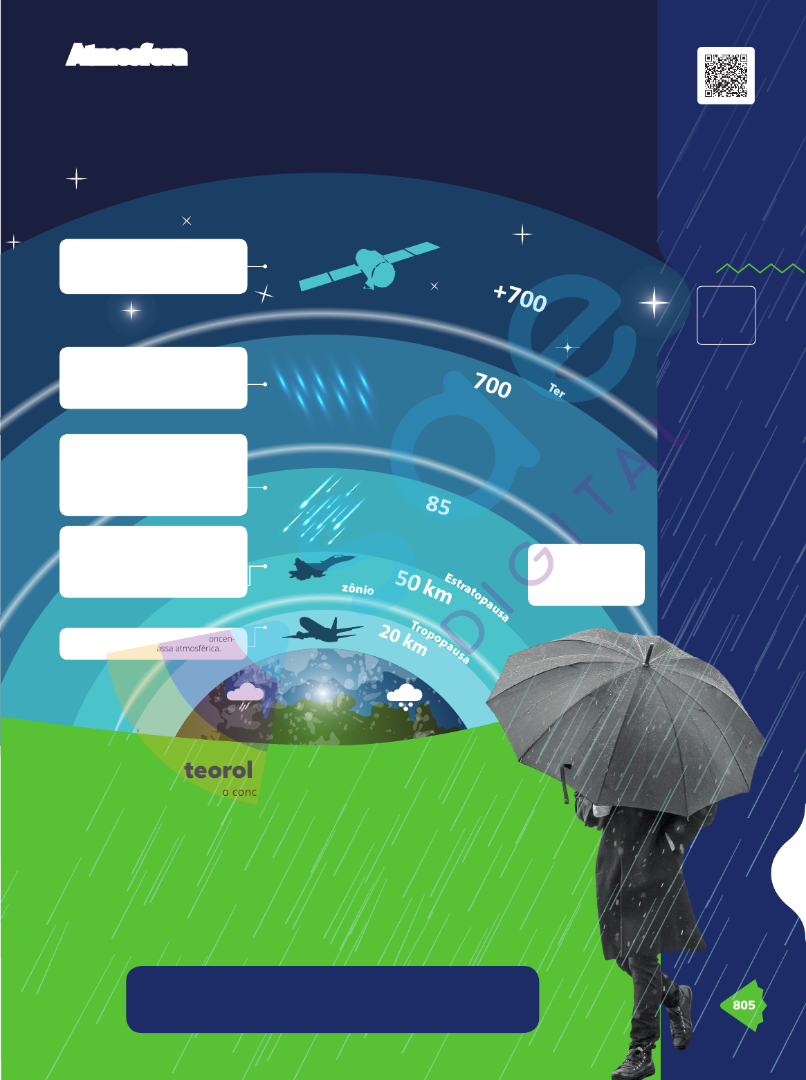 Espaço sideral km km km km km 20 camada de ozônio Termopausa Mesopausa Estratopausa Tropopausa Ellen Bronstayn/Shutterstock Cl im at ol og ia 805 Escola Digital Entre as camadas da atmosfera existem regiões de transição. São elas: tropopausa, estratopausa, mesopausa e termopausa. TROPOSFERA: nessa camada, estão concen- trados 90% de toda a massa atmosférica. ESTRATOSFERA: a estratosfera está situada no espaço entre 20 e 50 km de altitude. Nessa camada, concentra-se grande parte do ozônio (O3), responsável pela absorção dos raios ultravioleta. Essa absorção é responsá- vel pelas temperaturas elevadas da camada. MESOSFERA: a mesosfera está situada no espaço entre 50 e 85 km de altitude. A baixa densidade dessa camada faz com que os ga- ses tenham pequena capacidade de retenção de calor. Por essa razão, as temperaturas são extremamente baixas, chegando a 90 °C negativos. TERMOSFERA: abaixo da exosfera está a termosfera, que se encontra no espaço entre 85 e 700 km da superfície terrestre. Ela apre- senta elevada temperatura devido à absorção intensa de raios X, gama e ultravioleta. EXOSFERA: a exosfera está localizada acima de 700 km de altitude. É composta de hélio e hidrogênio e caracteriza-se por baixa densidade e temperatura elevada. Nº de aulas 02 EX T2 1_ 1_ G EO _A _0 8 G EO mód. 08/32 Frente A 08 Atmosfera A atmosfera é uma estrutura composta de gases que envolve a Terra sendo o nitrogênio, o oxigênio, o argônio, o dióxido de carbono e vapor de água os mais importantes. Sua densidade varia conforme a alti- tude: é mais densa próxima à superfície terrestre, onde está concentrada grande parte do oxigênio, e mais rarefeita com o aumento da altitude. Devido a essa dinâmica dos gases e à atuação do campo gravitacional da Terra, a atmosfera pode ser dividida em camadas, conforme demonstrado na ilustração a seguir. O conteúdo sobre a atmosfera está contemplado na questão 11 da seção Enem e vestibulares. Tempo meteorológico e clima Como na troposfera estão concentrados cerca de 90% da massa atmosférica, o com- portamento da atmosfera se altera diariamente e também ao longo das estações do ano. Essas alterações envolvem a temperatura, a nebulosidade, a precipitação e o vento, afetando o comportamento do tempo meteorológico. O tempo meteorológico é o estado da atmosfera em determinado momento e lugar. Isto é, se está frio, quente, nublado, sem nuvens ou chovendo. Essas condições mudam diariamente. A meteorologia é a ciência responsável pela coleta das condições do tempo meteorológico, além de realizar a sua previsão para os próximos dias. As condições são registradas diária e sistematicamente nas estações meteorológicas e, quando analisadas por um longo período (no mínimo 30 anos), definem o comportamento do clima que predomina em um local. Portanto, clima é a sucessão habitual das características do tempo meteo- rológico e está relacionado às estações do ano. No inverno, a temperatura que predomina é mais baixa (clima). Isso não impede, porém, que, em determinado dia, a temperatura fique mais alta (tempo meteorológico), devido a algumas condições como atuação das massas de ar, localização geográfica, altitude, entre outros. PG21LP411SDG0_MIOLO_EXT21_1_GEO_LP.indb 805 21/09/2020 22:26:07 EX T2 1_ 1_ G EO _A _0 8 EX T2 1_ 1_ G EO _A _0 8 G EO G RA FI A • F R EN TE A Elementos e fatores do clima O clima que predomina em uma região é definido segundo o comportamento dos seus elementos: temperatura, umidade do ar e pressão atmosférica. A grande diversidade geográfica da Terra influencia esses elementos, que se manifestam na forma de precipitação, nebulosidade, vento, entre outros. O comportamento dos diferentes tipos de clima está relacionado diretamente a alguns fatores, como latitude, altitude, relevo, maritimidade, continentalidade, correntes marítimas e massas de ar. Elementos do clima A energia do Sol é a fonte que aquece a atmosfera, mas isso ocorre de forma indireta. Isto é, a radiação solar aquece a su- perfície terrestre, que transfere calor para a atmosfera, carac- terizando a temperatura do ar. A temperatura não é constante em todos os lugares, tampouco ao longo do dia. Ela varia du- rante o dia (variação diária) e durante o ano (variação anual), conforme o tipo de clima que predomina. A umidade do ar refere-se à quantidade de água existente na atmosfera e se diferencia de um lugar para outro, duran- te o dia, mês e ano. A umidade faz parte do ciclo da água e é classificada como absoluta (quantidade de vapor de água na atmosfera em determinado momento, medida em g/m3) e rela- tiva (relação entre a umidade absoluta e o ponto de saturação, medida em porcentagem). A pressão atmosférica é o peso do ar sobre a superfície e está diretamente relacionada com a altitude dos lugares. Observe a ilustração a seguir. Modelo esquemático da pressão atmosférica. El en a Pa le ts ka ya /S hu tt er st oc k São Paulo (750 m de altitude) Santos (no nível do mar) Menor coluna de ar Menor pressão atmosférica Pressão atmosférica Maior colu- na de ar Maior pressão atmosférica Esse conteúdo está contemplado na questão 1 da seção Enem e vestibulares. Manifestações dos elementos do clima À medida que a umidade do ar aumenta, ocorre a formação de nuvens, caracterizando a nebulosidade. O grau de nebulosi- dade é a fração do céu que se encontra com nuvens. Estes são os tipos de nuvens: nuvens baixas (cúmu- lo-nimbo, cúmulo, estrato e estrato-cúmulo), que ocorrem até 2 000 metros de altura; nuvens médias (alto-estrato e alto-cúmulo), que ocorrem de 2 000 até 7 000 metros de altura); e nuvens altas (cirro-cúmulo e cirro), que ocorrem acima de 7 000 metros de altura. Além da nebulosidade, podem ocorrer nevoeiro, neblina ou cerração (condensação junto à superfície terrestre), orvalho (forma-se durante a noite devido ao resfriame
