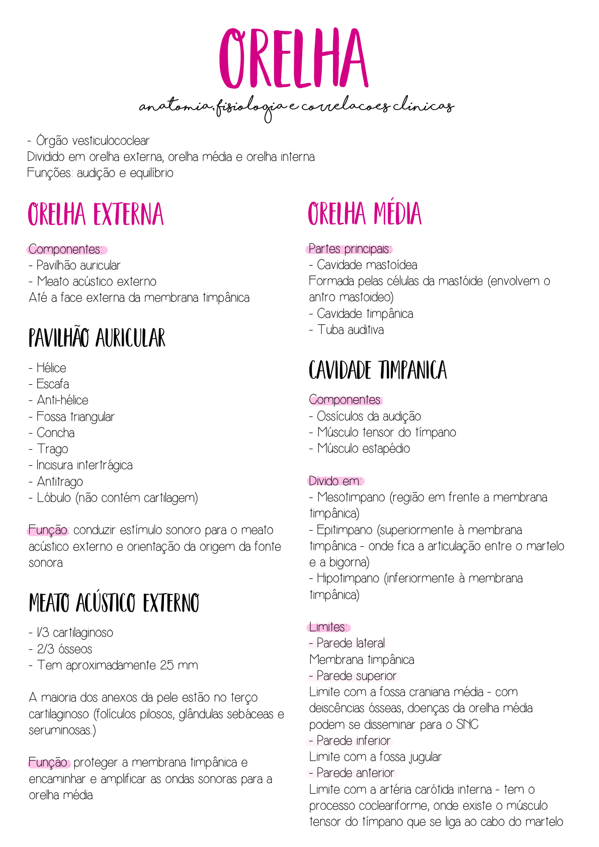 Orelha Anatomia, fisiologia e correlacoes clinicas Orelha externa Componentes: - Pavilhão auricular - Meato acústico externo Até a face externa da membrana timpânica Pavilhão auricular - Hélice - Escafa - Anti-hélice - Fossa triangular - Concha - Trago - Incisura intertrágica - Antitrago - Lóbulo (não contém cartilagem) Função: conduzir estímulo sonoro para o meato acústico externo e orientação da origem da fonte sonora Meato acústico externo - 1/3 cartilaginoso - 2/3 ósseos - Tem aproximadamente 25 mm A maioria dos anexos da pele estão no terço cartilaginoso (folículos pilosos, glândulas sebáceas e seruminosas...) Função: proteger a membrana timpânica e encaminhar e amplificar as ondas sonoras para a orelha média - Órgão vesticulococlear Dividido em orelha externa, orelha média e orelha interna Funções: audição e equilíbrio Orelha média Partes principais: - Cavidade mastoídea Formada pelas células da mastóide (envolvem o antro mastoideo) - Cavidade timpânica - Tuba auditiva Cavidade timpanica Componentes: - Ossículos da audição - Músculo tensor do tímpano - Músculo estapédio Divido em: - Mesotimpano (região em frente a membrana timpânica) - Epitimpano (superiormente à membrana timpânica - onde fica a articulação entre o martelo e a bigorna) - Hipotimpano (inferiormente à membrana timpânica) Limites: - Parede lateral Membrana timpânica - Parede superior Limite com a fossa craniana média - com deiscências ósseas, doenças da orelha média podem se disseminar para o SNC - Parede inferior Limite com a fossa jugular - Parede anterior Limite com a artéria carótida interna - tem o processo cocleariforme, onde existe o músculo tensor do tímpano que se liga ao cabo do martelo - Parede posterior Limite com a mastoide - tem a eminência piramidal, onde existe o músculo estapédioque se liga ao estribo - Parede interna Região do promontório, onde tem o nervo de Jacobson (ramo timpânico do IX craniano), proeminência do VII, fóssula da janela vestibular e fóssula da janela redonda Membrana timpânica - Parte tensa - Parte flácida Umbigo do tímpano: projeção da extremidade do cabo do martelo no tímpano Triângulo luminoso: se forma quando a luz é refletida na membrana timpanica (quadrante ântero-inferior) Ossículos da audição - Martelo - Bigorna - Estribo (a platina se insere na fossa da janela oval) Se articulam entre si Tuba auditiva - 35 a 38 mm - Vai da caixa timpanica à rinofaringe - 1/3 ósseo - 2/3 cartilaginosos Função: ventilar a orelha média e equalizar as pressões entre a orelha média e a orelha externa Viagens e pousos de avião podem gerar um comprometimento da função da tuba auditiva de equalizar as pressões Orelha interna Subdivisão: - Labirinto anterior (cóclea) - Labirinto posterior (vestíbulo - sáculo e utrículo e canais semicirculares) - Labirinto ósseo (perilinfático - revestido pela perilinfa): cóclea, vestíbulo e canais semicirculares - Labirinto membranoso (endolinfático - revestido pela endolinfa): ducto coclear, ductos semicirculares e vestíbulo membranoso Cóclea - Canal ósseo espiralado - Ramos do nervo coclear (ramo coclear do VIII par craniano) Cóclea (internamente) - Rampa vestibular (superior) - Rampa timpânica (inferior) - Rampa média (dúctio coclear) Órgão de Corti (ducto coclear) - Membrana tectória - Membrana basilar - Células ciliadas O ramo coclear do VIII par inerva as células ciliadas Helicotrema: orifício de comunicação entre a rampa vestibular e rampa timpânica Órgão de corti Constituição: - Esteriocilios - Células ciliadas externas e internas (inervada pelo nervo coclear) - Células de sustentação Diferença da célula ciliada interna x externa Células ciliadas internas: - Fileira única - Esterocilios não alcançam à membrana tectória - Recebem mais fibras do nervo coclear (verdadeiras transdutoras do estímulo) Células ciliadas externas: - 3-5 fileiras - Esterocilios mais longos - Recebem menos fibras do nervo coclear Fisiologia da audição Orelha média Protege orelha interna contra sons muito intensos Contração dos músculos tensor do tímpano e estapédio Tensor do tímpano - Ao som muito intenso, puxa o cabo do martelo para dentro da caixa timpânica Estapédio - Puxa o estribo para fora da janela oval Transformador de impedâncias - Permite que o som (onda mecânica) seja transmitido de um meio aéreo para um meio líquido endococlear - Pouca perda de energia Amplificação do som Pelo mecanismo hidráulico da OM - O som é conduzido pelo CAE, chega na MT, passa pela cadeia ossicular, chegando na janela oval - A pressão sonora que atinge a janela oval é muito maior, pois ela é pequena comparada a MT (pressão na platina do estribo) Articulação entre os ossiculos - Também amplifica o som Orelha interna O estímulo sonoro atinge a membrana timpânica, passa pela cadeia ossicular, o estribo passa a vibração para dentro da rampa vestibular, causando movimentação da perilinfa A perilinfa se estende através do helicotrema para a rampa timpanica e ocasiona um abaulamento da janela redonda, com isso, temos a vibração da membrana basilar do órgão de Corti Acontece uma movimentação das células ciliadas externas, tendo abertura dos canais iônicos, ocorrendo uma despolarização das células ciliadas externas Movimentação das células ciliadas internas, tendo abertura dos canais ionicos e consequentemente despolarização das células ciliadas internas O estímulo elétrico passa das células ciliadas internas para o nervo coclear Resumo As ondas sonoras vibram e são conduzidas para o CAE, fazendo vibrar a MT, sendo encaminhada a onda sonora pela cadeia ossicular, fazendo a movimentação dos fluidos intracocleares e no órgão de Corti vai haver a transdução elétrica, fazendo com que o estímulo inicialmente mecânico se torne elétrico, que será transmitido pelo nervo coclear (ramo do VIII) para o cérebro Pro