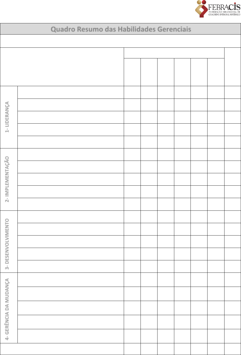 Quadro Resumo das Habilidades Gerenciais Avaliado: Competências Pontuação de Feedback P o n tu aç ão d e A u to A va lia çã o P e ss o a 1 P e ss o a 2 P e ss o a 3 P e ss o a 4 P e ss o a 5 M é d ia d e Fe ed b ac k 1 - LI D ER A N Ç A HG1 - Comunicar a visão HG2 – Esclarecer as expectativas HG3 – Inspirar e motivar HG 4 – Ser um bom exemplo HG5 – Representar a equipe 2 - IM P LE M EN TA Ç Ã O HG6 – Planejar e organizar HG7 – Consultar quanto a decisões HG8 – Solucionar problemas HG 9 - Agir com justiça HG 10 – Concentrar-se nos resultados 3 - D ES EN V O LV IM EN TO HG 11 – Orientar e treinar HG12 – Delegar trabalho HG 13 – Dar feedback HG 14 – Planejar carreira HG 15 – Fomentar a colaboração 4 - G ER ÊN C IA D A M U D A N Ç A HG 16 – Buscar oportunidade de melhoria HG 17 – Assumir riscos HG 18 – Informar aos outros HG19 – Reagir bem ao feedback HG 20 – Obter compromisso com a mudança Média Geral Gráfico das Habilidades Gerenciais Avaliado: Habilidades Nível de Habilidade P re ci sa d e d e se n vo lv im e n to É ad e q u ad o É al to 1 - LI D ER A N Ç A HG1 - Comunicar a visão 2 3 4 5 6 7 8 9 10 HG2 – Esclarecer as expectativas 2 3 4 5 6 7 8 9 10 HG3 – Inspirar e motivar 2 3 4 5 6 7 8 9 10 HG 4 – Ser um bom exemplo 2 3 4 5 6 7 8 9 10 HG5 – Representar a equipe 2 3 4 5 6 7 8 9 10 2 - IM P LE M EN TA Ç Ã O HG6 – Planejar e organizar 2 3 4 5 6 7 8 9 10 HG7 – Consultar quanto a decisões 2 3 4 5 6 7 8 9 10 HG8 – Solucionar problemas 2 3 4 5 6 7 8 9 10 HG 9 - Agir com justiça 2 3 4 5 6 7 8 9 10 HG 10 – Concentrar-se nos resultados 2 3 4 5 6 7 8 9 10 3 - D ES EN V O LV IM EN TO HG 11 – Orientar e treinar 2 3 4 5 6 7 8 9 10 HG12 – Delegar trabalho 2 3 4 5 6 7 8 9 10 HG 13 – Dar feedback 2 3 4 5 6 7 8 9 10 HG 14 – Planejar carreira 2 3 4 5 6 7 8 9 10 HG 15 – Fomentar a colaboração 2 3 4 5 6 7 8 9 10 4 - G ER ÊN C IA D A M U D A N Ç A HG 16 – Buscar oportunidade de melhoria 2 3 4 5 6 7 8 9 10 HG 17 – Assumir riscos 2 3 4 5 6 7 8 9 10 HG 18 – Informar aos outros 2 3 4 5 6 7 8 9 10 HG19 – Reagir bem ao feedback 2 3 4 5 6 7 8 9 10 HG 20 – Obter compromisso com a mudança 2 3 4 5 6 7 8 9 10