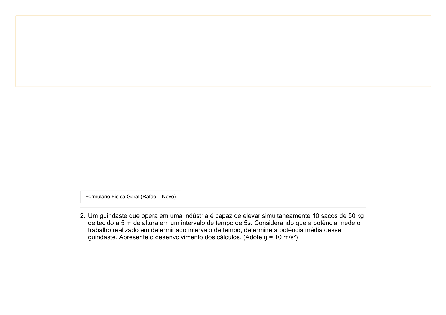 22/03/2021 UNIASSELVI - Centro Universitário Leonardo Da Vinci - Portal do Aluno - Portal do Aluno - Grupo UNIASSELVI https://portaldoalunoead.uniasselvi.com.br/ava/notas/request_gabarito_n2.php 1/2 Acadêmico: Robson Laurindo dos Santos (962416) Disciplina: Física Geral (MAT25) Avaliação: Avaliação Final (Discursiva) - Individual Semipresencial ( Cod.:668774) ( peso.:4,00) Prova: 28959493 Nota da Prova: - 1. Um fio condutor é percorrido por uma corrente elétrica de intensidade 4,5 A. Determine a quantidade de carga elétrica que passa por uma secção transversal desse fio num intervalo de 30 minutos. Apresente o desenvolvimento dos cálculos. Dica: converta o tempo para segundos. Resposta Esperada: q = ? i = 4,5 A t = 30min = 1.800s i = q/t 4,5 = q/1800 q = 4,5 * 1800 q = 8100 C Anexos: Formulário Física Geral (Rafael - Novo) 2. Um guindaste que opera em uma indústria é capaz de elevar simultaneamente 10 sacos de 50 kg de tecido a 5 m de altura em um intervalo de tempo de 5s. Considerando que a potência mede o trabalho realizado em determinado intervalo de tempo, determine a potência média desse guindaste. Apresente o desenvolvimento dos cálculos. (Adote g = 10 m/s²) https://portaldoalunoead.uniasselvi.com.br/extranet/layout/request/imag_prova_ead_anexo_n2.php?action1=Mjg5NTk0OTM=&action2=NzA2MTY0 22/03/2021 UNIASSELVI - Centro Universitário Leonardo Da Vinci - Portal do Aluno - Portal do Aluno - Grupo UNIASSELVI https://portaldoalunoead.uniasselvi.com.br/ava/notas/request_gabarito_n2.php 2/2 Resposta Esperada: m = 10 x 50 = 500 kg W = F . d g = 10 m/s² W = m.g.h h = 5 m W = 500.10.5 t = 5s W = 25 000 J P = ? P = W/t P = 25000/5 P = 5000 W Anexos: Formulário Física Geral (Rafael - Novo) Formulário Física Geral (Rafael - Novo) https://portaldoalunoead.uniasselvi.com.br/extranet/layout/request/imag_prova_ead_anexo_n2.php?action1=Mjg5NTk0OTM=&action2=NzA2MTY0 https://portaldoalunoead.uniasselvi.com.br/extranet/layout/request/imag_prova_ead_anexo_n2.php?action1=Mjg5NTk0OTM=&action2=NzA2MTY0