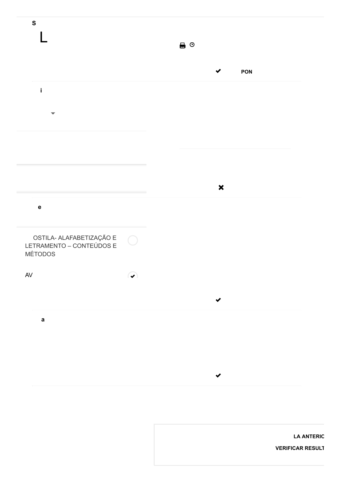 21/08/2020 Course Status – Facuminas https://ava.facuminasead.com.br/course-status/ 1/2 2 HORAS AVALIAÇÃO – ALFABETIZAÇÃO E LETRAMENTO ALFABETIZAÇÃO E LETRAMENTO Tempo Restante : 17 Meses 26.32% PSICOLOGIA DA PERSONALIDADE INFANTIL PSICOLOGIA DA APRENDIZAGEM ALFABETIZAÇÃO E LETRAMENTO: CONTEÚDOS E MÉTODOS APOSTILA- ALAFABETIZAÇÃO E LETRAMENTO – CONTEÚDOS E MÉTODOS AVALIAÇÃO – ALFABETIZAÇÃO E AULA ANTERIO VERIFICAR RESULT PONTUAÇÃO TOTAL: 10PONTUAÇÃO OBTIDA 10 Sobre a alfabetização, marque a opção incorreta: Resposta Marcada : A escolaridade obrigatória e gratuita implica um ensino seletivo, cujo objetivo principal é a formação básica da criança, facilitando-lhe os recursos necessários para desenvolver suas habilidades e capacidades, de modo a intervir de forma racional e ativa na vida social. PONTUAÇÃO TOTAL: 10PONTUAÇÃO OBTIDA 0 Mais tardio, do ponto de vista histórico, é o aparecimento e utilização do método global de contos ou de historietas. Nesse método, a unidade tomada como ponto de partida é o texto. Houve a divulgação dos métodos globais em vários estados brasileiros, como Rio Grande do Sul, São Paulo e Minas Gerais. Em Minas Gerais, por exemplo, sabemos que houve, nas primeiras décadas do século XX, a adesão oficial ao método global de contos ou de historietas. Sobre o método global de contos, marque a alternativa correta: Resposta Marcada : Na apropriação feita pelos professores franceses, o método global sofreu algumas alterações: após discussões livres, os professores encaminhavam com a classe a escrita de uma frase ou texto lidos e copiados no caderno. O texto era transformado em letra script e depois impresso com a escolha dos alunos “tipógrafos do dia. PONTUAÇÃO TOTAL: 10PONTUAÇÃO OBTIDA 10 A educação é um fato cultural, que pode assumir as mais diversas formas e modalidades, dependendo do grau de desenvolvimento da sociedade. Ao longo dos séculos, mundo infantil foi variando e a história revela que as crianças foram alvo de maus tratos, abandono e até mesmo de infanticídio desde os tempos remotos até os nossos dias. Agora os filhos ocupam um lugar central, e sua educação é legalmente obrigatória, em casa e na escola. Sobre a história da alfabetização, marque a opção incorreta: Resposta Marcada : Durante séculos, e até hoje, a escola sempre se caracterizou pela complexidade e pelo dinamismo, tratando-se apenas transmitir conhecimentos. O conteúdo do ensino sempre foi diversificado e os alunos sempre tiveram liberdade para expressar suas inquietações e interesses. PONTUAÇÃO TOTAL: 10PONTUAÇÃO OBTIDA 10 De acordo com os estudos da apostila podemos concluir que a expressão “homófonos” tem o seguinte significado: Resposta Marcada : As Palavras Homófonas são aquelas que têm pronúncia idêntica, mas grafias diferentes. Assim, a palavra é composta pela junção dos termos homo, que significa “mesmo” e fonia, que significa “som”. Se formos analisar cada situação de aprendizagem rememorada por vocês, leitores, vamos perceber coincidências de uso de um mesmo material, numa mesma região ou Estado, e também o uso simultâneo de métodos diferentes, numa mesma época ou numa mesma escola. Encontraremos também práticas de alfabetização constantes, que se repetem para vocês, leitores professores de diferentes idades. Os métodos de alfabetização, considerados historicamente, agrupam-se em métodos sintéticos e métodos analíticos. Sobre estes, marque a alternativa incorreta. Resposta Marcada : Os métodos sintéticos buscam atuar na compreensão por entenderem que a linguagem escrita deve https://ava.facuminasead.com.br/membros/04295516651/course/course-results/?action=249448 21/08/2020 Course Status – Facuminas https://ava.facuminasead.com.br/course-status/ 2/2 ALFABETIZAÇÃO E LETRAMENTO Tempo Restante : 17 Meses 26.32% PSICOLOGIA DA PERSONALIDADE INFANTIL PSICOLOGIA DA APRENDIZAGEM ALFABETIZAÇÃO E LETRAMENTO: CONTEÚDOS E MÉTODOS APOSTILA- ALAFABETIZAÇÃO E LETRAMENTO – CONTEÚDOS E MÉTODOS AVALIAÇÃO – ALFABETIZAÇÃO E AULA ANTERIO VERIFICAR RESULT PONTUAÇÃO TOTAL: 10PONTUAÇÃO OBTIDA 10 Sobre a alfabetização, marque a opção incorreta: Resposta Marcada : A escolaridade obrigatória e gratuita implica um ensino seletivo, cujo objetivo principal é a formação básica da criança, facilitando-lhe os recursos necessários para desenvolver suas habilidades e capacidades, de modo a intervir de forma racional e ativa na vida social. PONTUAÇÃO TOTAL: 10PONTUAÇÃO OBTIDA 0 Mais tardio, do ponto de vista histórico, é o aparecimento e utilização do método global de contos ou de historietas. Nesse método, a unidade tomada como ponto de partida é o texto. Houve a divulgação dos métodos globais em vários estados brasileiros, como Rio Grande do Sul, São Paulo e Minas Gerais. Em Minas Gerais, por exemplo, sabemos que houve, nas primeiras décadas do século XX, a adesão oficial ao método global de contos ou de historietas. Sobre o método global de contos, marque a alternativa correta: Resposta Marcada : Na apropriação feita pelos professores franceses, o método global sofreu algumas alterações: após discussões livres, os professores encaminhavam com a classe a escrita de uma frase ou texto lidos e copiados no caderno. O texto era transformado em letra script e depois impresso com a escolha dos alunos “tipógrafos do dia. PONTUAÇÃO TOTAL: 10PONTUAÇÃO OBTIDA 10 A educação é um fato cultural, que pode assumir as mais diversas formas e modalidades, dependendo do grau de desenvolvimento da sociedade. Ao longo dos séculos, mundo infantil foi variando e a história revela que as crianças foram alvo de maus tratos, abandono e até mesmo de infanticídio desde os tempos remotos até os nossos dias. Agora os filhos ocupam um lugar central, e sua educação é legalmente obrigatória, em casa e na escola. Sobre a his