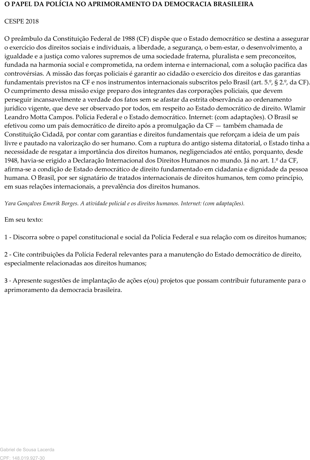 O PAPEL DA POLÍCIA NO APRIMORAMENTO DA DEMOCRACIA BRASILEIRA CESPE 2018 O preâmbulo da Constituição Federal de 1988 (CF) dispõe que o Estado democrático se destina a assegurar o exercício dos direitos sociais e individuais, a liberdade, a segurança, o bem-estar, o desenvolvimento, a igualdade e a justiça como valores supremos de uma sociedade fraterna, pluralista e sem preconceitos, fundada na harmonia social e comprometida, na ordem interna e internacional, com a solução pacífica das controvérsias. A missão das forças policiais é garantir ao cidadão o exercício dos direitos e das garantias fundamentais previstos na CF e nos instrumentos internacionais subscritos pelo Brasil (art. 5.º, § 2.º, da CF). O cumprimento dessa missão exige preparo dos integrantes das corporações policiais, que devem perseguir incansavelmente a verdade dos fatos sem se afastar da estrita observância ao ordenamento jurídico vigente, que deve ser observado por todos, em respeito ao Estado democrático de direito. Wlamir Leandro Motta Campos. Polícia Federal e o Estado democrático. Internet: (com adaptações). O Brasil se efetivou como um país democrático de direito após a promulgação da CF — também chamada de Constituição Cidadã, por contar com garantias e direitos fundamentais que reforçam a ideia de um país livre e pautado na valorização do ser humano. Com a ruptura do antigo sistema ditatorial, o Estado tinha a necessidade de resgatar a importância dos direitos humanos, negligenciados até então, porquanto, desde 1948, havia-se erigido a Declaração Internacional dos Direitos Humanos no mundo. Já no art. 1.º da CF, afirma-se a condição de Estado democrático de direito fundamentado em cidadania e dignidade da pessoa humana. O Brasil, por ser signatário de tratados internacionais de direitos humanos, tem como princípio, em suas relações internacionais, a prevalência dos direitos humanos. Yara Gonçalves Emerik Borges. A atividade policial e os direitos humanos. Internet: (com adaptações). Em seu texto: 1 - Discorra sobre o papel constitucional e social da Polícia Federal e sua relação com os direitos humanos; 2 - Cite contribuições da Polícia Federal relevantes para a manutenção do Estado democrático de direito, especialmente relacionadas aos direitos humanos; 3 - Apresente sugestões de implantação de ações e(ou) projetos que possam contribuir futuramente para o aprimoramento da democracia brasileira. Gabriel de Sousa Lacerda CPF: 148.019.927-30 222029890950