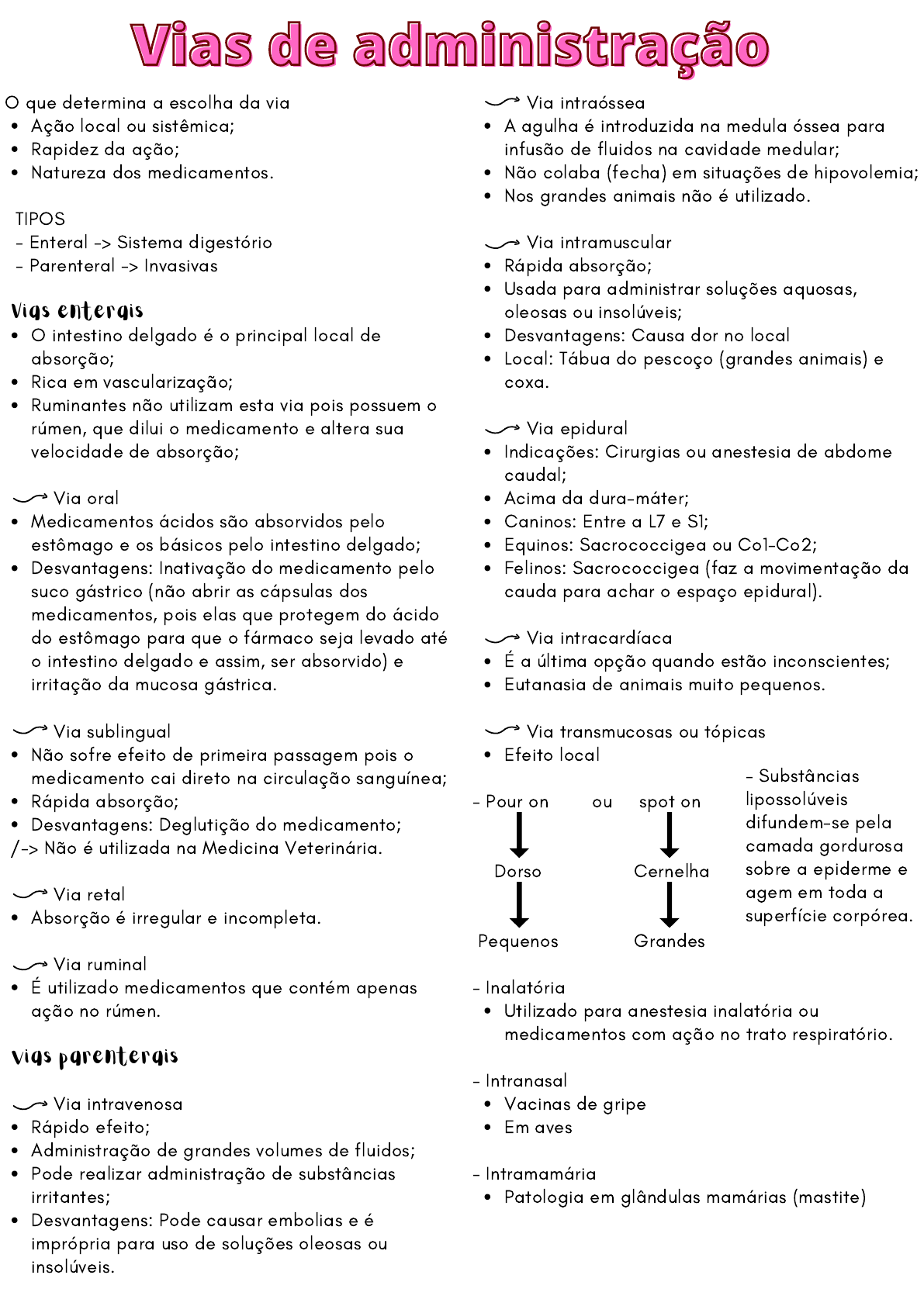 Ação local ou sistêmica; Rapidez da ação; Natureza dos medicamentos. O intestino delgado é o principal local de absorção; Rica em vascularização; Ruminantes não utilizam esta via pois possuem o rúmen, que dilui o medicamento e altera sua velocidade de absorção; Medicamentos ácidos são absorvidos pelo estômago e os básicos pelo intestino delgado; Desvantagens: Inativação do medicamento pelo suco gástrico (não abrir as cápsulas dos medicamentos, pois elas que protegem do ácido do estômago para que o fármaco seja levado até o intestino delgado e assim, ser absorvido) e irritação da mucosa gástrica. Não sofre efeito de primeira passagem pois o medicamento cai direto na circulação sanguínea; Rápida absorção; Desvantagens: Deglutição do medicamento; Absorção é irregular e incompleta. É utilizado medicamentos que contém apenas ação no rúmen. Rápido efeito; Administração de grandes volumes de fluidos; Pode realizar administração de substâncias irritantes; Desvantagens: Pode causar embolias e é imprópria para uso de soluções oleosas ou insolúveis. O que determina a escolha da via TIPOS - Enteral -> Sistema digestório - Parenteral -> Invasivas Vias enterais Via oral Via sublingual /-> Não é utilizada na Medicina Veterinária. Via retal Via ruminal vias parenterais Via intravenosa A agulha é introduzida na medula óssea para infusão de fluidos na cavidade medular; Não colaba (fecha) em situações de hipovolemia; Nos grandes animais não é utilizado. Rápida absorção; Usada para administrar soluções aquosas, oleosas ou insolúveis; Desvantagens: Causa dor no local Local: Tábua do pescoço (grandes animais) e coxa. Indicações: Cirurgias ou anestesia de abdome caudal; Acima da dura-máter; Caninos: Entre a L7 e S1; Equinos: Sacrococcigea ou Co1-Co2; Felinos: Sacrococcigea (faz a movimentação da cauda para achar o espaço epidural). É a última opção quando estão inconscientes; Eutanasia de animais muito pequenos. Efeito local Utilizado para anestesia inalatória ou medicamentos com ação no trato respiratório. Vacinas de gripe Em aves Patologia em glândulas mamárias (mastite) Via intraóssea Via intramuscular Via epidural Via intracardíaca Via transmucosas ou tópicas - Pour on ou spot on Dorso Cernelha Pequenos Grandes - Inalatória - Intranasal - Intramamária - Substâncias lipossolúveis difundem-se pela camada gordurosa sobre a epiderme e agem em toda a superfície corpórea. Vias de administraçãoVias de administraçãoVias de administração