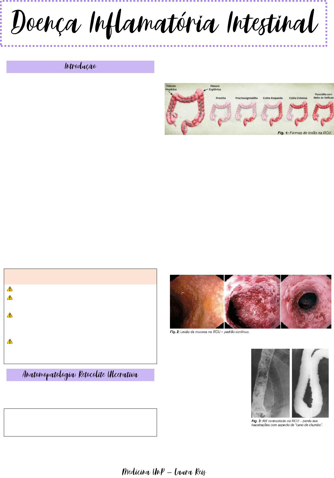A expressão “Doença Intestinal Inflamatória” (DII) aplica-se a duas doenças intestinais crônicas e idiopáticas: a Doença de Crohn (DC) e a Retocolite Ulcerativa (RCU). Essas duas devem ser diferenciadas das demais doenças que também promovem inflamação dos intestinos, como infecções, diverticulite, apendicite, enterite por radiação, medicamentos ou toxinas, e vasculite intestinal. O principal fator de risco comprovado para ambas as DII é uma história familiar positiva (presente em 10-25% dos pacientes). Atualmente, parece haver uma discreta predominância da RCU em homens, ao passo que na DC haveria um maior número de casos em mulheres. Um fato curioso é a existência do chamado gradiente norte-sul, a observação de que as DII são mais frequentes quanto mais para o norte nos deslocamos (maior incidência na América do Norte e Europa, em comparação com o continente Latino-Americano, África e Ásia). A diferenciação entre RCU e DC é feita por critérios clínicos, radiológicos, endoscópicos e histológicos. Contudo, 10-20% dos casos não é possível, pelo menos num primeiro momento, classificar o paciente como DC ou RCU, sendo esses pacientes diagnosticados como “colite indeterminada”. FATORES IMPORTANTES O fumo protege para a RCU, mas está associada à DC. Hormônios Femininos: algumas mulheres apresentam piora dos sintomas durante a menstruação. Uso de Anti-inflamatórios Não Esteroidais (AINEs): estas drogas estão frequentemente associadas com reagudizações das DII e contribuem para o surgimento de doença refratária. Apendicectomia Prévia: parece proteger contra o surgimento de RCU. Já no caso da DC existe uma associação provavelmente “espúria” (não causal). A RCU é uma doença exclusiva do cólon e da mucosa e é tipicamente ascendente e uniforme. A RCU é uma doença intestinal caracterizada pelo surgimento inexplicado (idiopático) de lesões inflamatórias que ascendem de maneira uniforme (homogênea) pela mucosa do cólon. A extensão do comprometimento da mucosa do cólon é variável: O aspecto macroscópico da mucosa colônica varia desde o normal até o completo desnudamento: → Desaparecimento do padrão vascular típico do cólon (precoce); → Hiperemia, edema, mucosa friável, erosões, ulcerações e exsudação de muco, pus ou sangue; → Formação de Pseudopólipos: 15 a 30% dos casos; → Mucosa pálida, atrófica, com aspecto tubular (cronicidade). Em casos raros de RCU grave, estas alterações podem comprometer, por contiguidade (e não por ação direta da doença), a submucosa e a muscular. Nestes casos, a parede torna-se frágil e há risco de megacólon tóxico e perfuração espontânea. Na RCU de longa evolução, são comuns alterações da musculatura colônica, que, ao exame radiológico, se mostram com perda das hautrações e espessamento da musculatura lisa com aspecto de “cano de chumbo”. RCU COM RETO NORMAL Existe na RCU uma situação na qual o reto pode se apresentar intacto, enquanto as regiões mais proximais do cólon mantêm as características lesões contínuas e ascendentes (dificultando, portanto, a diferenciação com DC): é o uso da terapia tópica com enemas de glicocorticoide, o que pode “esfriar” a inflamação mais distal do cólon! A DC pode acometer qualquer parte do tubo digestivo, desde a boca até o ânus (a RCU acomete somente o cólon, principalmente suas porções mais distais). Alterações microscópicas frequentemente são encontradas à distância dos locais onde estão as alterações macroscópicas, ou seja, a DC não acomete o trato intestinal de forma homogênea, contínua. Na DC pode haver acometimento macroscópico em diferentes locais ao mesmo tempo, isto é, separados por trechos de mucosa normal (skip lesions ou “lesões salteadas”). Ao contrário do que ocorre na RCU, a DC se caracteriza por um acometimento descontínuo e focal, tanto macroscópica quanto microscopicamente. Na DC, as alterações patológicas inflamatórias são tipicamente transmurais (na RCU estas alterações estão tipicamente restritas à mucosa). Isso explica o espessamento da parede intestinal, com estreitamento do lúmen (formação de estenoses), e também explica a potencialidade para formação de fístulas para o mesentério e órgãos contíguos. A DC geralmente se inicia com a formação das úlceras aftoides: pequenas ulcerações da mucosa que caracteristicamente se desenvolvem sobre as Placas de Peyer, no intestino delgado, ou sobre aglomerados linfoides no cólon Do ponto de vista macroscópico, a porção distal do íleo e o cólon ascendente são os mais comprometidos (ileocolite, presente em 70- -75% dos casos). Uma das alterações macroscópicas mais características da DC, que há muito já fora percebida por cirurgiões durante laparotomias ou laparoscopias, é invasão da serosa por tecido adiposo (fat wrapping)! Geralmente, se apresenta como episódios de diarreia invasiva (sangue, muco e pus), que variam de intensidade e duração e são intercalados por períodos assintomáticos. Seus principais sintomas são diarreia sanguinolenta + dor abdominal, acompanhada de febre e sintomas gerais nos casos mais graves. Na maioria das vezes, o início dos sintomas é insidioso (o diagnóstico é feito após 9 meses do início do quadro) com (1) crescente urgência para defecar (diminuição da complacência do reto inflamado), (2) leves cólicas abdominais baixas e (3) aparecimento de sangue e muco nas fezes. Menos comumente, a RCU tem início agudo e fulminante, com diarreia violenta e súbita, síndrome febril e toxemia. Se o processo está confinado ao retossigmoide, as fezes estão normais ou endurecidas, podendo haver constipação. Se o processo foi difuso, estendendo-se de forma proximal, as fezes tornam-se amolecidas e sobrevém diarreia, cólicas intensas e tenesmo. Alterações laboratoriais: → Anemia ferropriva: pela perda crônica de sangue. →