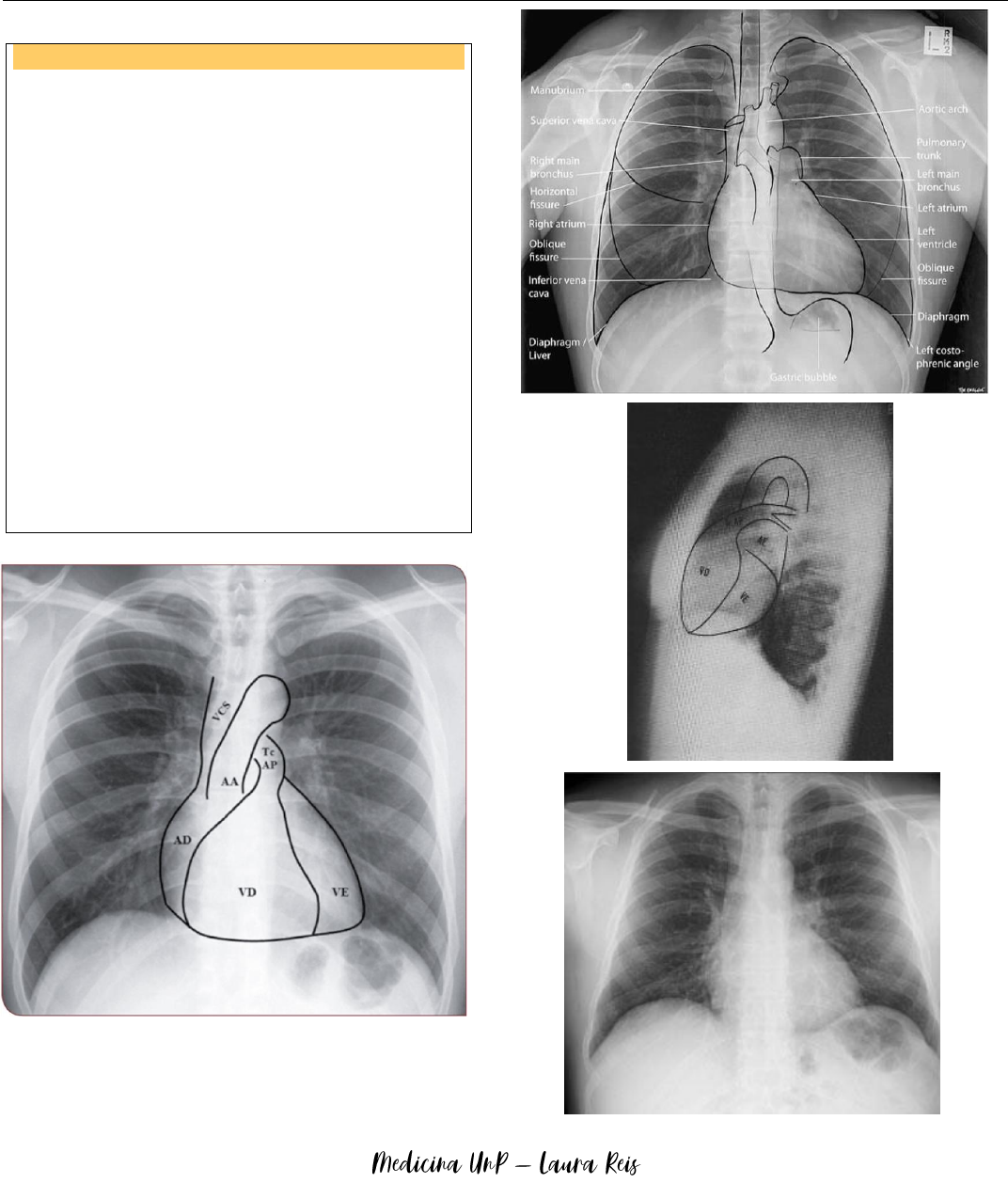 Raio X de torax Fonte: Aula do Prof. Thiago Dantas INCIDÊNCIAS Postero anterior: melhor para ver pulmão. − Posição ortostática, raio incidindo pelas costas, em inspiração, clavícula alinhadas e traqueia centralizada, visualização dos seios costofrênicos. − Diafragma direito mais elevado que o esquerdo (fígado), presença de bulha gástrica no diafragma esquerdo, até 8 arcos costais e até 7 arcos costais em mulheres → ausência de hiperinsuflação. Antero posterior: pode dar falso diagnóstico de hiperinsuflação pulmonar. Perfil: para ver lobos inferiores, que no PA é sobreposto pelos outros. Decúbito lateral (Laurell): melhor para ver derrame pleural. Oblíquoa e Ápico-lordótica: não são mais utilizadas, devido ao uso de TC. CONSOLIDAÇÃO/CONDENSAÇÃO É a presença de secreção, catarro, pus, dentro do saco alveolar. Já nos brônquios mais calibrosos não vão estar com secreção, vão estar cheios de ar (preto) → BRONCOGRAMA AÉREO. Pneumonia, tuberculose, embolia pulmonar. Quando não há borramento da silhueta cardíaca, podemos dizer que está acometendo o lobo inferior direito e quando há borramento da silhueta cardíaca, podemos dizer que há acometimento do lobo médio direito. Já do lado esquerdo, a língula está acometida quando há borramento da silhueta cardíaca e o lobo inferior esquerdo está acometido na ausência de borramento da silhueta cardíaca. ABCESSO PULMONAR Faz diferenciação com a cavitação. É uma massa com presença de nível hidroaéreo. Contudo, a cavitação não faz nível hidroaéreo, pois não há líquido dentro dela. Uma consolidação com nível hidroaéreo. Etilistas crônicos, TCE, idoso, mau estado de conservação oral. Pode ser complicação da pneumonia ou de uma TEP periférica. DERRAME PLEURAL Presença da parábola de Damoiseu. Empurra as estruturas adjacentes para o lado contralateral. Seio costofrênico ocupado. PNUEMOTÓRAX Empurra as estruturas adjacentes para o lado contralateral. ATELECTASIAS É um espaço que está faltando, ou seja, ela puxa as estruturas adjacentes para o seu lado. Um sinal para diferenciar do derrame pleural é que no derrame pleural o líquido vai descer, diferente da atelectasia. Passiva: tenta se acomodar à algo/alguma lesão que está no espaço torácico, não se insuflando, sem troca gasosa, fazendo hipoxemia, diminuindo. Ativa: há uma obstrução brônquica direta. NÓDULOS O seguimento de imagem é necessário, pois tudo pode ser um nódulo pulmonar. Benigno: calcificado, homogêneo, bordas regulares, mais periférico. Maligno: heterogêneo, espiculado, calcificação apenas na periferia ou em corona radiata, tende a ser mais central. Nódulo pulmonar com > 5 cm: massa pulmonar. HIPERINSUFLAÇÃO Pela hiperinsuflação há rebaixamento e retificação das hemicúpulas diafragmáticas, fazendo com que o coração fique “pendurado”, o chamado coração em gota. Maior aparecimento dos arcos costais: > 8 arcos. Presença de oligoemia: falta de circulação pulmonar na periferia. CAVITAÇÃO Na TB pulmonar, acomete os lobos mais aerados, como os lobos superiores. Não faz nível hidroaéreo. EDEMA DE PULMÃO Hilo aumentado, pode ter ou não aumento da área cardíaca (depende se o edema agudo for hipertensivo ou cardiogênico), aumento da trama vascular, presença de infiltrado algodonoso. Pode ter derrame pleural, atelectasia. PNUEMOTÓRAX Ausência de trama vascular, pelo acúmulo de ar, por isso fica preto na imagem. Pneumotórax empurra as estruturas adjacentes para dar espaço ao ar. INFILTRADO INTERSTICIAL São doenças com pior prognóstico. Acometimento extra alveolar. Reticulonodular (presença de nódulos bem pequenos) x Reticular (parede com o edema agudo). Tuberculose, sarcoidose, silicose, fibrose pulmonar.
