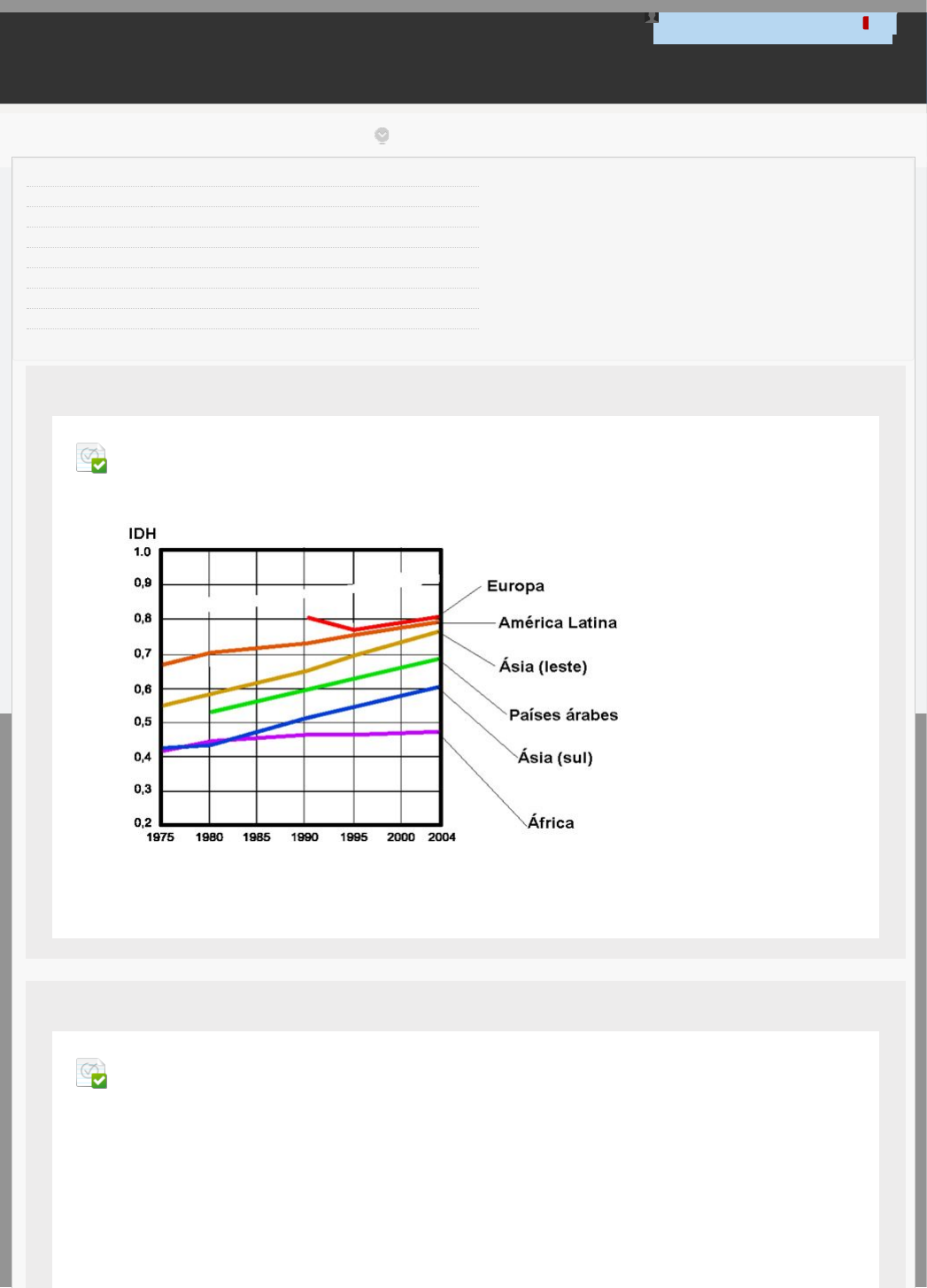 UNIP EAD BIBLIOTECAS MURAL DO ALUNO TUTORIAIS sabrina.santos128 @aluno.unip.br 1 CONTEÚDOS ACADÊMICOS Revisar envio do teste: AVALIAÇÃO IESTUDOS DISCIPLINARES II 6553-15_SEI_GH_0121_R_20211_02 CONTEÚDO Usuário sabrina.santos128 @aluno.unip.br Curso ESTUDOS DISCIPLINARES II Teste AVALIAÇÃO I Iniciado 23/03/21 20:42 Enviado 23/03/21 20:49 Status Completada Resultado da tentativa 10 em 10 pontos Tempo decorrido 7 minutos Resultados exibidos Respostas enviadas, Perguntas respondidas incorretamente Pergunta 1 Resposta Selecionada: d. O Índice de Desenvolvimento Humano (IDH) é uma medida comparativa de pobreza, alfabetização e esperança de vida para os diversos países do mundo. Seu cálculo resulta em valor que vai de 0 (zero) a 1 (um), sendo que, quanto mais próximo da unidade, mais desenvolvido é considerado o país. A escolaridade inclui a alfabetização dos adultos e a educação primária, secundária e terciária da população em geral. O PIB per capita entra no cálculo do IDH como um substituto de uma medida do padrão de vida ou de distribuição de renda. O grá!co abaixo mostra a evolução do IDH de 1975 a 2004 para várias regiões do planeta. Com base nos dados apresentados no grá!co, pode-se concluir que O leste da Ásia é mais desenvolvido que o sul do continente. Pergunta 2 Em relação ao processo de urbanização brasileiro, no período de 1940 a 2000, analise o gráfico abaixo. 1 em 1 pontos 1 em 1 pontos 23/03/2021 20:50 Página 1 de 6 Resposta Selecionada: e. Fonte: IBGE, Censos Demográficos A partir das informações constantes no gráfico, marque V para as afirmativas verdadeiras e F para as falsas. ( ) O censo de 1940 registrou que, aproximadamente, 70% dos brasileiros viviam nas áreas rurais, evidenciando que a economia brasileira assentava-se no campo. ( ) A elevação da concentração populacional urbana, evidenciada pelo censo de 1950, foi resultado, em grande medida, do Plano de Metas, fundado pela ação conjunta entre Estado, capital privado nacional e estrangeiro. ( ) O censo de 1970 revelou que o país havia se tornado majoritariamente urbano, devendo-se esse fato ao chamado Milagre Econômico e às consequentes mudanças no capitalismo internacional. ( ) Nas duas últimas décadas do século XX houve expressiva concentração populacional urbana em decorrência da modernização no campo e da industrialização. Assinale a sequência correta: V, F, V, V Pergunta 3 Resposta Selecionada: a. Os dados estatísticos são referentes ao crescimento do índice de urbanização no Brasil. Urbanização é o aumento proporcional da população urbana em relação à população rural. Fonte: “Estatísticas históricas do Brasil: séries econômicas demográficas e sociais de 1550 a 1988”. 2. ed. Rio de Janeiro: IBGE, 1990, p. 36-7. I. Segundo os dados estatísticos, a urbanização ocorre no país devido à população urbana ser superior ao crescimento da população rural. II. O maior índice de urbanização ocorreu na região Sudeste, em que há os estados mais industrializados: São Paulo e Rio de Janeiro. III. Quanto maior o número do índice de urbanização no Brasil, maior o índice do êxodo rural. Assinale a alternativa correta: I, II e III Pergunta 4 Na avaliação da e!ciência de usinas quanto à produção e aos impactos ambientais, utilizam-se vários critérios, tais como: razão entre produção efetiva anual de energia elétrica e potência instalada ou razão entre potência instalada e área inundada pelo reservatório. No quadro seguinte, esses parâmetros são aplicados às duas maiores hidrelétricas do mundo: Itaipu, no Brasil, e Três Gargantas, na China. 1 em 1 pontos 1 em 1 pontos 23/03/2021 20:50 Página 2 de 6 Resposta Selecionada: e. Com base nessas informações, avalie as a!rmativas que se seguem: I - A energia elétrica gerada anualmente e a capacidade nominal máxima de geração da hidrelétrica de Itaipu são maiores que as da hidrelétrica de Três Gargantas. II - Itaipu é mais e!ciente que Três Gargantas no uso da potência instalada na produção de energia elétrica. III - A razão entre potência instalada e área inundada pelo reservatório é mais favorável na hidrelétrica Três Gargantas do que em Itaipu. É correto apenas o que se a!rma em: II e III Pergunta 5 Resposta Selecionada: d. Leia o texto a seguir. Aquecimento global “Emitimos cerca de 9 bilhões de toneladas de monóxido de carbono (CO) por ano, sendo que menos da metade dessa quantidade permanece na atmosfera. O CO é um dos causadores do efeito estufa, juntamente com o metano (CH4) e os cloro"uorcarbonos (CFC). Medindo a concentração de carbono em rochas, os cientistas determinaram um aumento súbito na concentração de carbono na atmosfera entre as eras paleocena e eocena. Esse evento, seguido de uma queda lenta na concentração de carbono, foi denominado Evento Termal Máximo do Paleoceno-Eoceno (PETM) e estendeu-se por cerca de 150 mil anos, até que todo o carbono em excesso fosse reabsorvido (!gura 1). Figura 1: Acredita-se que o PETM foi desencadeado por um aumento da temperatura global, que teria causado o derretimento dos depósitos de hidrato de metano, liberando metano na atmosfera. Uma molécula de metano contribui cerca de 20 vezes mais para o aquecimento da atmosfera do que uma molécula de CO. Com o tempo, o metano passa por um processo de oxidação, produzindo CO, o que continua provocando elevação na temperatura. O PETM teve como consequência um aumento da acidez dos mares, provocando a extinção de algumas espécies e a migração de outras em direção aos polos, além da diminuição do tamanho dos mamíferos durante o período de concentração alta de carbono na atmosfera. Estamos lançando cada vez mais CO na atmosfera e a temperatura do planeta vem aumentando desde o início da era industrial. É questão de tempo até atingirmos uma temperatura global similar à que antecedeu o PETM, fazendo com 