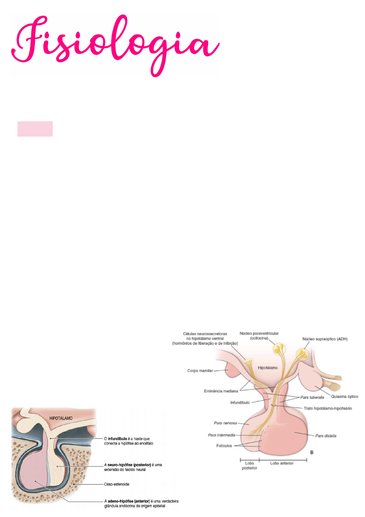 B.M.F 3 Neuro-hipófise Conceitos • Glândula apineal secreta melatonina (mediador químico indutor do sono) • Infundíbulo se forma a partir da eminência mediana • ADH = vasopressina • Núcleo supraóptico produz o ADH • Núcleo paraventricular produz a ocitocina • Porção anterior do hipotálamo coordenada a hipófise posterior (neuro-hipófise) • Porção médio-basal do hipotálamo coordena a hipófise anterior (adeno-hipófise) Hipófise - É um órgão endócrino localizado na sela turcica (cavidade do osso esfenoide) - Se liga ao hipotálamo através do pedículo infundibular ou infundíbulo - É revestida por uma cápsula de tecido conjuntivo que é contínua com a rede de fibras reticulares - Possui origem embriológica dupla - Se localiza na base do cérebro, no diencéfalo - Está interligada ao terceiro ventrículo Neuro-hipófise - Não produz homônimo, apenas armazena e secreta os hormônios produzidos pelo hipotálamo - É um tecido nervoso, composto por neurônios e células de suporte (tecido neural) - Recebe o hormônio produzido pelo hipotálamo através de capilares, o armazena e o secreta na corrente sanguínea - A secreção dos hormônios é controlada por sinais neurais que tem origem no hipotálamo - Possui núcleos magnocelulares (de corpo longo) - Os hormônios são inicialmente sintetizados nos corpos celulares dos núcleos supra- ópticos e para-ventriculares, e então são transportados em associação as proteínas transportadoras (chamadas neurofisina) para as terminações nervosas na hipófise posterior B.M.F 3 Hipotálamo -> neuro-hipófise - Os hormônios que chegam na neuro-hipófise são sintetizados por corpos celulares no hipotálamo (os corpos das células que secretam os hormônios da hipófise posterior estão localizados em neurônios grandes, chamados de neurônios magnocelulares, localizados nos núcleos supraópticos e paraventriculares do hipotálamo) - Os hormônios são então transportados no axoplasma das fibras nervosas dos neurônios que seguem do hipotálamo para a hipófise posterior - Fibras nervosas contendo grânulos secretores dos núcleos supraópticos e paraventriculares chegam na neuro-hipófise através do pedúnculo hipofisário e lá secretam ADH e ocitocina - Vesículas com neuro-homonios são sintetizadas nos corpos celulares hipotalâmicos, cujos axônios amielinicos terminam na pars nervosa da neuro- hipófise, a qual contém botões terminais (responsáveis pelo armazenamento dos hormônios) Eixo hipotálamo-hipófise 1- Estímulos (luz, frio, fome) chegam á áreas superiores do sistema nervoso e sinalizam o hipotálamo lateral (onde ocorre a seleção de qual hipófise deve ser ativada, neuro-hipófise ou adeno-hipófise) 2- Hipotálamo lateral emite aferência para o hipotálamo anterior ativando a neuro-hipófise 3- Impulsos nervosos são transmitidos ao longo das fibras dos núcleos supra-ópticos e B.M.F 3 para-ventriculares (estes produzem e empacotam o hormônio em vesículas sintetizadas nos corpos celulares hipotalâmicos) 4- As vesículas contendo o hormônio são armazenadas na neuro-hipófise (botões terminais) 5- Ocorre uma despolarização e o hormônio é imediatamente liberado por exocitose dos grânulos secretores nas terminações nervosas 6- O hormônio é captado pelos capilares adjacentes e segue para onde deve agir ADH 1- Ocorre um aumento na osmolaridade do LEC 2- Ocorre o murchamento dos osmorreceptores hipotalamicos 3- Ocorre a ativação desses osmorreceptores 4- Ocorre uma sinalização nervosa para o núcleo supra-óptico 5- Ocorre secreção adicional de ADH 6- O ADH age nas células do ducto coletor (sinalizando para a inserção de poros de aquaporina) 7- Ocorre reabsorção renal (aumento da captação de água) Ocitocina - É responsável pela contração do útero gravídico e auxilia na ejeção do leite pelas glândulas mamarias B.M.F 3 Eixo hipotalâmico-hipofisário