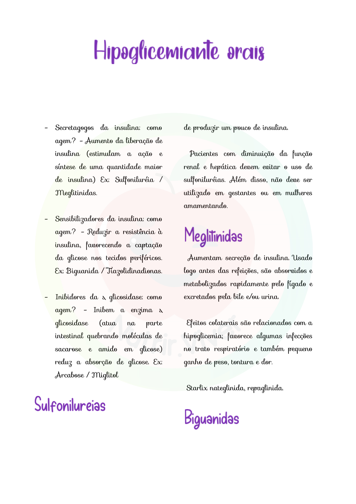 Trabalha para reduzir a glicemia do paciente (diabetes) - Secretagogos da insulina: como agem? - Aumento da liberação de insulina (estimulam a ação e síntese de uma quantidade maior de insulina) Ex: Sulfoniluréia / Meglitinidas. - Sensibilizadores da insulina: como agem? - Reduzir a resistência à insulina, favorecendo a captação da glicose nos tecidos periféricos. Ex: Biguanida / Tiazolidinadionas. - Inibidores da ⲁ glicosidase: como agem? - Inibem a enzima ⲁ glicosidase (atua na parte intestinal quebrando moléculas de sacarose e amido em glicose) reduz a absorção de glicose. Ex: Arcabose / Miglitol Cloropropamida, glibenclamida, glimepirida. O mecanismo básico de ação é estimular diretamente a liberação de insulina em pacientes que possuem células betas viáveis, ou seja, que ainda são capazes de produzir um pouco de insulina. Pacientes com diminuição da função renal e hepática devem evitar o uso de sulfoniluréias. Além disso, não deve ser utilizado em gestantes ou em mulheres amamentando. Aumentam secreção de insulina. Usado logo antes das refeições, são absorvidos e metabolizados rapidamente pelo fígado e excretados pela bile e/ou urina. Efeitos colaterais são relacionados com a hipoglicemia; favorece algumas infecções no trato respiratório e também pequeno ganho de peso, tontura e dor. Starlix nateglinida, repaglinida. Cloridrato de metformina. Modifica o metabolismo das gorduras. Causam um aumento da sensibilidade à insulina, ou seja, diminui a resistência periférica a insulina, e reduzem a produção hepática de glicose por diminuição da glicogenólise (glicogênio - glicose) e da gliconeogênese (formação de glicose). É droga de 1° opção para pacientes obesos. Os efeitos colaterais mais comuns são diarréia, náuseas e cólica intestinal que normalmente desaparecem nas primeiras semanas. Pioglitazona, rosiglitazone. - Aumentam sensibilidade periférica à insulina. Efeitos colaterais: infecção do trato respiratório superior e dor de cabeça, tontura e fraqueza. Não utilizar pessoas com disfunção hepática e insuficiência cardíaca. Mulheres em uso de contraceptivos orais devem adicionar outros cuidados anticoncepcionais, o nível plasmático do contraceptivo pode ser reduzido. Redução na digestão e absorção dos CHO complexos, no intestino delgado, levando a uma queda no pico de glicose pós- prandial (após uma refeição). Devem ser administrados obrigatoriamente durante as refeições. Os efeitos colaterais são gastrointestinais (flatulência, diarréia e dor abdominal) Estão contra - indicados em pacientes com doença inflamatória intestinal crônica e evitados em pessoas com doença renal. - Glyset; glucobay 100.