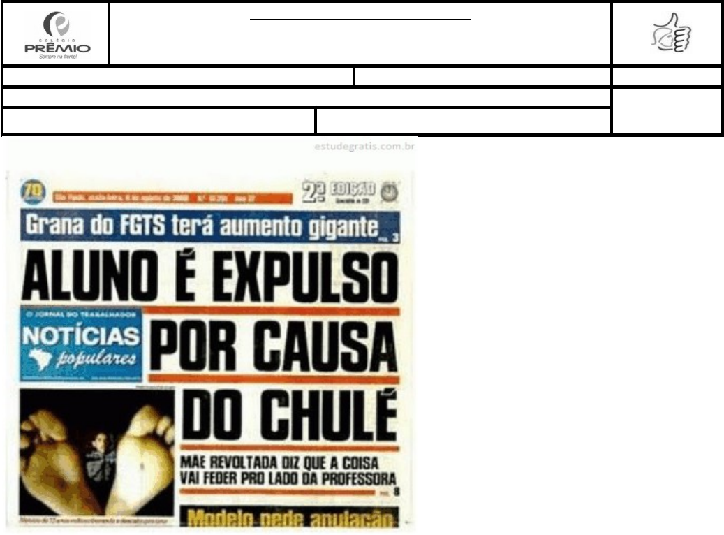 AVALIAÇÃO RECUPERAÇÃO Disciplina: Literatura Sistema Positivo de Ensino Professor: Luizinho Soares Nível: Fundamental II ANO: 8º Aluno (a): Nota: Data: / /2020 Valor: 1)Considere a primeira página do extinto jornal Notícias Populares, do grupo Folha, e as afirmações que seguem. I. O jornal utilizava o nível popular de linguagem de forma a atingir determinado público-alvo. II. Os assuntos selecionados para a primeira página seguem o critério de noticiabilidade, que depende exclusivamente do fato do si e não se altera de acordo com o veículo. III. A diagramação é um aspecto gráfico que não interfere na construção do sentido do discurso jornalístico e na percepção do leitor. Está correto o que se afirma somente em A) I B) II C) III D) I e II 2) Sobre os meios de comunicação de massa avalie as afirmações abaixo. I. Os meios de comunicação de massa são canais de comunicação usados para transmitir mensagens a um grande número de receptores. II. Diz-se que os detentores destes meios têm o poder de fazer com que o grande público “consuma” assuntos e notícias que, nem sempre são de seus interesses mas, muitas vezes, são de conveniência de seus detentores. III. Entre os principais meios de comunicação de massa podemos citar o jornal impresso, o rádio e a TV. Está correto o que se afirma em A) I, somente B) II, somente C) I e III, somente D) I, II e III 3) A função da linha-fina da primeira página de um jornal é A) completar o sentido do título ou dar outras informações. B) antecipar o assunto da notícia e convidar à leitura do texto. C) conter as informações essenciais da notícia. D) informar quem fez o quê, a quem, quando, onde, como e por quê. 4) Nas primeiras páginas de alguns jornais, é possível encontrar títulos e manchetes sensacionalistas. Marque a opção que NÃO apresenta características da postura editorial sensacionalista. A) Neutralidade na descrição da notícia. B) Exagero na apresentação do fato. C) Considerável apelo emotivo. D) Uso de imagens fortes na cobertura de um fato jornalístico. 5) As estratégias argumentativas, como dados estatísticos, pesquisas, fatos históricos ou depoimentos de especialistas, são características de um texto A) narrativo. B) dramático. C) dissertativo. D) poético. 6) O que caracteriza o texto argumentativo é a presença de A) passagens descritivas. B) narrador, personagem, enredo, tempo e espaço. C) travessão para introduzir a fala no discurso direto. D) ponto de vista do autor sobre determinado tema. 7) De modo geral, a finalidade de um artigo de opinião é A) apresentar ao leitor informações sobre um determinado tema. B) criar uma narrativa a respeito de um determinado tema. C) expor um ensinamento de vida. D) por meio da argumentação, levar o leitor a concordar com o posicionamento do autor a respeito do tema tratado no texto. 8) Sobre os tipos de argumento de uma dissertação escolar, marque a alternativa incorreta: a) O argumento de autoridade traz citações de especialistas no tema do texto. b) Informações vinculadas a instituições consistem em argumento por raciocínio lógico. c) Na frase “Para o filósofo Platão, a realidade é apenas uma convenção”, estamos diante de um argumento de autoridade. d) A apresentação de causa e consequência de determinado fato é um recurso de argumentação por raciocínio lógico. 9) O que configura a tese de uma dissertação escolar? a) Retomada da ideia apresentada no decorrer do texto. b) Apresentação da situação-problema do texto. c) Posicionamento defendido pelo autor do texto. d) Inserção de elementos argumentativos no texto. 10) O desenvolvimento de uma dissertação escolar consiste em a) apresentar o tema a ser discutido no texto. b) construir o ponto de vista do produtor do texto sobre o tema. c) propor uma ideia para resolver o problema apresentado no texto. d) concluir as ideias com base nas argumentações expostas.