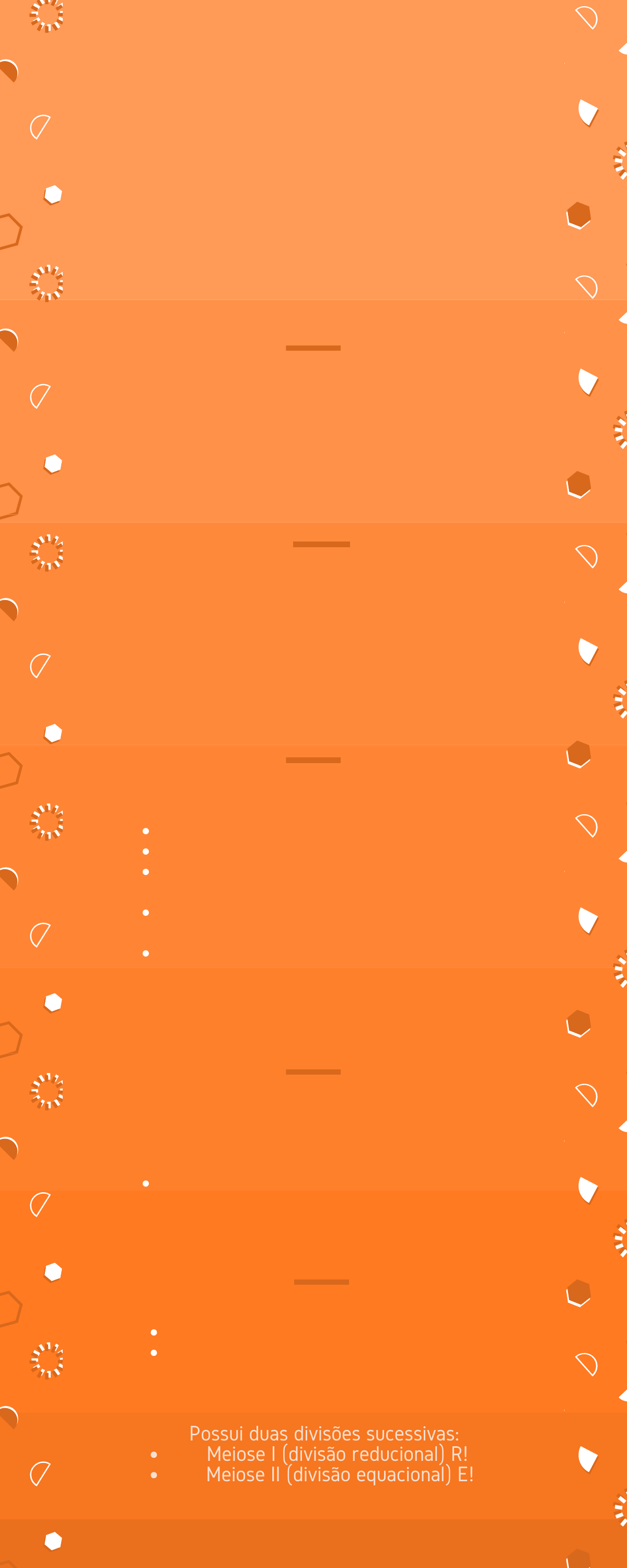 Os dois processos fazem parte do nosso corpo, embora ocorram em situações diferentes. A mitose pode ocorrer em células haploides e diploides, enquanto que a meiose ocorre apenas em células diploides. Espermatozóides Óvulos Meiose I (divisão reducional) R! Meiose II (divisão equacional) E! Formação dos gametas: Reduz o nº cromossômico à metade Possui duas divisões sucessivas: MEIOSE Produzir combinações diferentes de cromossomos nos gametas (em humanos: 223). Considerando os “crossings” essas combinações são altíssimas, promovendo variabilidade. Ocorre em organismos com reprodução sexuada. Função da meiose: MITOSE Organismos multicelulares Crescimento Reparo de tecidos Alguns protistas, fungos, plantas e animais Reprodução assexuada Funções da mitose: DIVISÃO CELULAR Mitose e Meiose O QUE É: Mitose é o processo de divisão celular que dá origem a duas células iguais à inicial, ou seja, com o mesmo número de cromossomos. Já na meiose, ocorrem duas divisões celulares, formando quatro células com metade do material genético da célula- mãe. MATHEUS LOPES 200024990