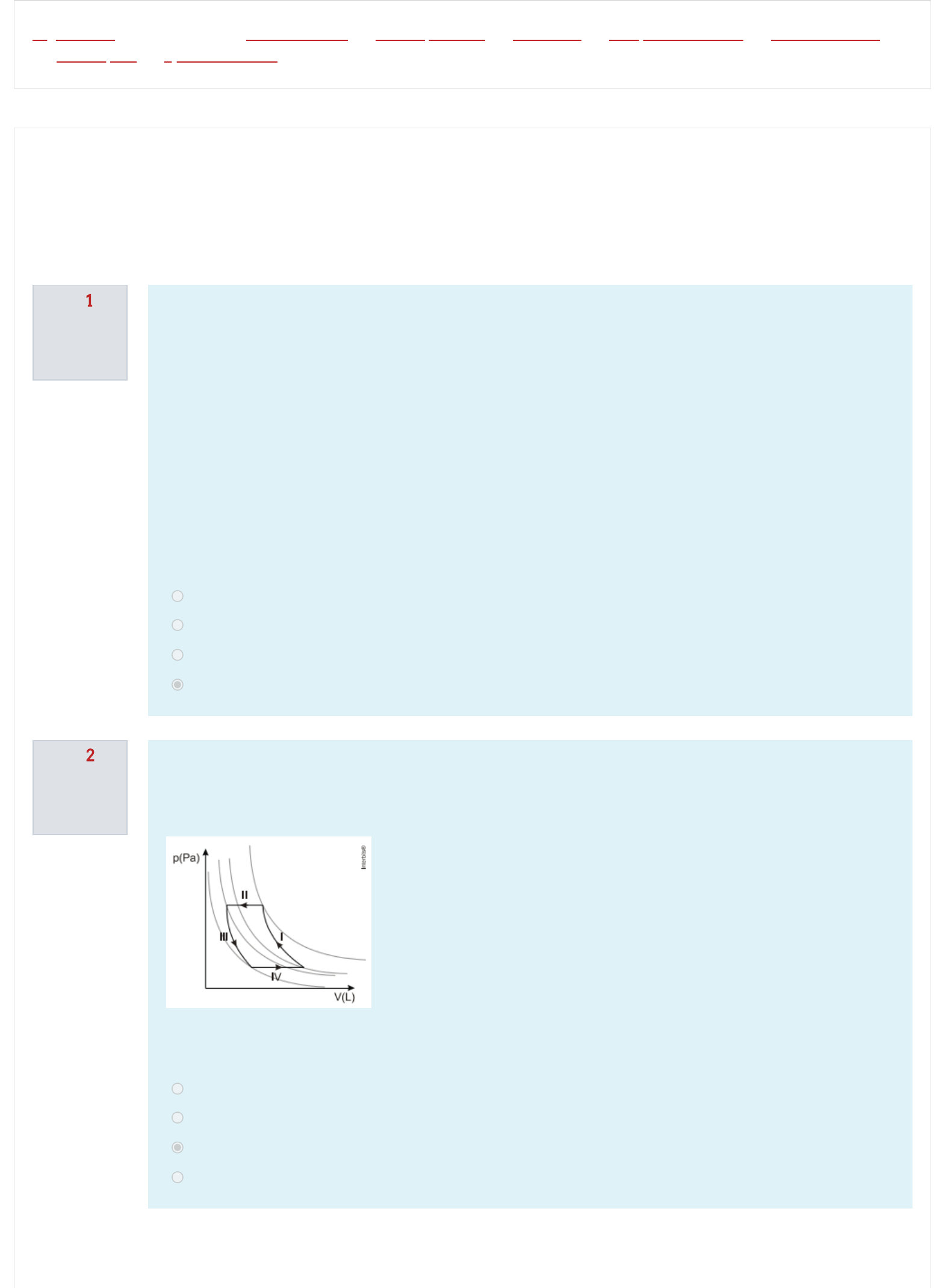 Página inicial / Meus cursos / CURSOS FUNEC / Graduação - EAD / Aluno EAD / JUNÇÕES DE TURMA / Termodinâmica II / AVALIAÇÕES / QUESTIONÁRIO 2 Questão 1 Completo Atingiu 2,00 de 2,00 Questão 2 Completo Atingiu 2,00 de 2,00 Iniciado em Thursday, 25 Mar 2021, 01:44 Estado Finalizada Concluída em Thursday, 25 Mar 2021, 01:46 Tempo empregado 2 minutos 23 segundos Avaliar 16,00 de um máximo de 20,00(80%) (UFPB 2011) Todos os anos, diversos pedidos de patentes de novas máquinas são rejeitados por violarem as Leis da Termodinâmica. Em particular, o conceito de entropia é frequentemente o ponto central da falha dos projetos dessas máquinas, o que demonstra a importância da entropia. Considerando o conceito de entropia, identifique as afirmativas corretas abaixo: i. A reversibilidade de um processo termodinâmico é uma consequência do aumento da entropia. ii. Alguns processos termodinâmicos, mesmo quando há conservação da energia, não são possíveis, pois fazem a entropia do universo diminuir. iii. A entropia é uma medida da desordem do sistema. iv. Quanto maior o número de estados acessíveis a um sistema, maior será a entropia desse sistema. v. De acordo com a segunda Lei da Termodinâmica, a entropia de um sistema fechado nunca decresce Escolha uma opção: a. VFFFF b. VFVFF c. FVFVV d. FVVVV (G1 - IFSC 2012) Você já se perguntou como funciona a geladeira? De que maneira ela consegue diminuir a temperatura dos alimentos? Pelo menos sabe, do ponto de vista físico, explicar o que acontece? A geladeira é uma máquina térmica fria, que transforma trabalho em calor. Como máquina térmica, ela respeita um ciclo de transformações (duas isobáricas e duas adiabáticas), como mostra a figura abaixo. Identifique em qual transformação a temperatura do gás atinge o seu menor valor. Assinale a alternativa CORRETA. Escolha uma opção: a. Transformação I – compressão adiabática. b. Transformação IV – expansão isobárica. c. Transformação III – expansão adiabática. d. Transformação II – compressão isobárica. https://ava.funec.br/ https://ava.funec.br/course/index.php?categoryid=10 https://ava.funec.br/course/index.php?categoryid=17 https://ava.funec.br/course/index.php?categoryid=19 https://ava.funec.br/course/index.php?categoryid=77 https://ava.funec.br/course/view.php?id=495 https://ava.funec.br/course/view.php?id=495#section-6 https://ava.funec.br/mod/quiz/view.php?id=5585 Questão 3 Completo Atingiu 2,00 de 2,00 Questão 4 Completo Atingiu 2,00 de 2,00 Questão 5 Completo Atingiu 2,00 de 2,00 Questão 6 Completo Atingiu 2,00 de 2,00 Questão 7 Completo Atingiu 2,00 de 2,00 (UFPF - RS) Um ciclo de Carnot trabalha entre duas fontes térmicas: uma quente em temperatura de 227°C e uma fria em temperatura -73°C. O rendimento desta máquina, em percentual, é de: Escolha uma opção: a. 25 b. 50 c. 60 d. 35 (UNIVALI - SC) Uma máquina térmica opera segundo o ciclo de Carnot entre as temperaturas de 500K e 300K, recebendo 2 000J de calor da fonte quente. o calor rejeitado para a fonte fria e o trabalho realizado pela máquina, em joules, são, respectivamente: Escolha uma opção: a. 700 e 1 300 b. 500 e 1 500 c. 1 200 e 800 d. 1 000 e 1 000 Tem-se uma máquina térmica frigorífica que realiza, durante um ciclo completo, um trabalho de 4. 10 J e cede, à fonte fria, 12. 10 J. Com essas informações, calcule a eficiência da máquina térmica e marque a opção correta. Escolha uma opção: a. 3,5 b. 2,4 c. 1 d. 3 4 4 (PUCMG 2004) A respeito do que faz um refrigerador, pode-se dizer que: Escolha uma opção: a. converte calor em frio. b. produz frio. c. remove calor de uma região e o transfere a outra. d. anula o calor. (ENEM 2012) Aumentar a eficiência na queima de combustível dos motores à combustão e reduzir suas emissões de poluentes são a meta de qualquer fabricante de motores. É também o foco de uma pesquisa brasileira que envolve experimentos com plasma, o quarto estado da matéria e que está presente no processo de ignição. A interação da faísca emitida pela vela de ignição com as moléculas de combustível gera o plasma que provoca a explosão liberadora de energia que, por sua vez, faz o motor funcionar. Disponível em: www.inovacaotecnologica.com.br. Acesso em: 22 jul. 2010 (adaptado). No entanto, a busca da eficiência referenciada no texto apresenta como fator limitante Escolha uma opção: a. o funcionamento cíclico de todo os motores. A repetição contínua dos movimentos exige que parte da energia seja transferida ao próximo ciclo. b. um dos princípios da termodinâmica, segundo o qual o rendimento de uma máquina térmica nunca atinge o ideal. c. as forças de atrito inevitável entre as peças. Tais forças provocam desgastes contínuos que com o tempo levam qualquer material à fadiga e ruptura. Questão 8 Completo Atingiu 2,00 de 2,00 Questão 9 Completo Atingiu 0,00 de 2,00 Questão 10 Completo Atingiu 0,00 de 2,00 d. o tipo de combustível, fóssil, que utilizam. Sendo um insumo não renovável, em algum momento estará esgotado. (Ufpr 2008) Os estudos científicos desenvolvidos pelo engenheiro francês Nicolas Sadi Carnot (1796-1832) na tentativa de melhorar o rendimento de máquinas térmicas serviram de base para a formulação da segunda lei da termodinâmica. Acerca do tema, considere as seguintes afirmativas: 1) O rendimento de uma máquina térmica é a razão entre o trabalho realizado pela máquina num ciclo e o calor retirado do reservatório quente nesse ciclo. 2) Os refrigeradores são máquinas térmicas que transferem calor de um sistema de menor temperatura para outro a uma temperatura mais elevada. 3) É possível construir uma máquina, que opera em ciclos, cujo único efeito seja retirar calor de uma fonte e transformá-lo integralmente em trabalho. Assinale a alternativa correta. Escolha uma opção: a. Somente a afirmativa 2 é verdadeira. b. Somente as afirmativas 1 e 2 são verdade
