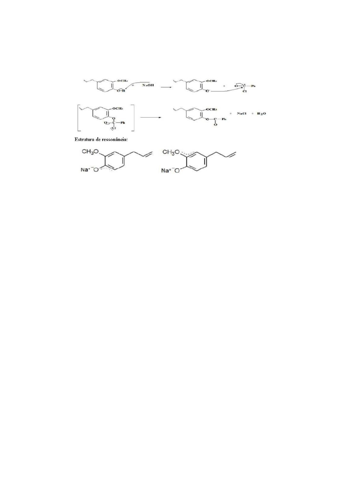 4- QUESTIONÁRIOaO 1- Apresente a reação entre o eugenol e NH e escreva estruturas de ressonância que mostrem como o ânion do eugenol é estabilizado: 2- Qual a função dos agentes dessecantes? Cite exemplos São substâncias quimicas capazes de absorver ou adsorver a água. O alcool é um exemplo muito comum, usado na sua forma liquida ou gasosa na secagem de fluidos. São exemplos de agentes dessecantes: Silica gel; Sulfato de calcio; Cloreto de calcio; argila de montmorillonita e peneiras moleculares. 3- Quais métodos poderiam ser utilizados para uma purificação do eugenol, a partir do óleo de cravo? (eugenol: P.F. = -11o C; P.E. = 254o C)? Os metodos que podem ser utilizados para purificação do eugenol são o arraste a vapor; pressão reduzida; cristalização por cromatografia e destilação fracionada. 4- Qual o produto formado na reação de um cloreto de ácido (RCOCl) com: a) H2O: RCOOH + HCl (formação de acido carboxilico) b) NH3 : RCONH2 + HCl (formação de uma amida) c) R’COOH: d) R’OH : RCOOCH3 + HCl ( formação de um ester) 5- Apresente o mecanismo de reação entre o eugenol e cloreto de benzoíla: 6- Que outro reagente poderia ser utilizado no lugar do cloreto de benzoíla, visando a preparação do benzoato de eugenol? O Fluoreto de benzoila poderia ser utilizado. 7- Como pode ser realizada a caracterização do eugenol? Como suas características físicas são desfavoráveis para possíveis estudos, poderia ser transformado em um derivado. Após ser transformado ele poderia facilmente ser estudado para elucidação de características como ponto de fusão e entre outras. 8- Discuta a pureza do derivado (benzoato de eugenol), a partir da medida de seu ponto de fusão. Como este composto poderia ser melhor purificado? Através do processo de cromatografia poderia ser melhor purificado, pois as substancias isoladas de um processo extrativo não atingem desejado grau de pureza. 9- Além do eugenol (1), o óleo do cravo contém o carofileno (3) e outros terpenos, em pequenas quantidades. Explique o que acontece com estes compostos quando o eugenol é isolado do cravo pelo seu procedimento experimental: Por possuir maior massa molecular, o cariofileno (3) possui maior ponto de ebulição que o eugenol, dificultando sua destilação por arraste a vapor. Os outros terpenos presentes no óleo de cravo também são separados do eugenol no processo de extração por apresentarem maior afinidade com a água do que com o solvente orgânico. O que acontece com estes compostos é que são separados da solução antes do eugenol ser isolado pelo procedimento. 10- Cite outros exemplos de compostos orgânicos (aromáticos ou não) que podem ser extraídos de fontes naturais, tais como: anis estrelado, noz moscada, pimenta, hortelã, guaraná e sassafrás: anis estrelado: anetol hortelã: mentol sassafrás: safrol pimenta: capsaicinoides guaraná: cafeína 11- Cite um método de extração e de dosagem para óleos essenciais. Explique: Enfloração: é uma técnica de extração a frio utilizada para extrair óleos essenciais de flores delicadas e sensíveis ao calor, que possuem baixo teor de óleos. O procedimento consiste em colocar camadas das pétalas de flores frescas sobre cera em uma placa de vidro. Todos os dias as camadas de flores são trocadas e, lentamente, a cera extrai os componentes aromáticos. Posteriormente, é filtrada e destilada em baixa temperatura. O líquido oleoso obtido é misturado com álcool e novamente destilado. 12- Em caso de incêndio em um laboratório de Química, quais os procedimentos básicos? - Combater o fogo com extintor de incêndio de gás carbônico - Caso o fogo fuja do controle, evacuar o local imediatamente - Acionar o alarme de incêndio - Desligar a chave central de eletricidade -Evacuar o prédio - Ligar para os bombeiros e relatar a localização do fogo e que se trata de um laboratório químico onde não deve ser utilizada a água para combater o fogo.