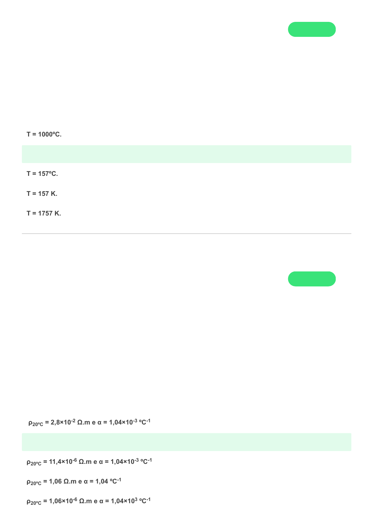 20/02/2021 Comentários https://sereduc.blackboard.com/ultra/courses/_43610_1/outline/assessment/_3159009_1/overview/attempt/_10456496_1/review/inline-feedback?… 1/7 Ocultar opções de resposta Ocultar opções de resposta Pergunta 1 -- /1 Uma lanterna possui as seguintes especificações com relação à sua lâmpada: corrente elétrica de 0,30 V e diferença de potencial de 2,9 V, que são os valores obtidos quando a lâmpada está acesa. Na temperatura de 20ºC, a resistência do filamento de tungstênio é de 1,1 Ω. Considerando essas informações e o conteúdo estudado sobre resistência e temperatura, pode-se afirmar que a temperatura do filamento quando a lâmpada está acesa é de: T = 1000ºC. Resposta corretaT = 1757ºC. T = 157ºC. T = 157 K. T = 1757 K. Pergunta 2 -- /1 Um bastão cilíndrico de 1,5 m de comprimento e 0,5 cm de diâmetro está conectado a uma fonte de energia que mantém uma tensão constante de 15 V através de suas extremidades, enquanto um amperímetro mede a corrente que passa por ele. Observa-se que em temperatura ambiente (20ºC), a corrente é de 18,5 A, enquanto que na temperatura de 92ºC a corrente é de 17,2 A. Considerando essas informações e o conteúdo estudado sobre resistência e temperatura, pode-se afirmar que a resistividade deste material e o coeficiente de temperatura da resistividade a 20ºC são, respectivamente: ρ = 2,8×10 Ω.m e α = 1,04×10 ºC 20ºC -2 -3 -1 Resposta corretaρ = 10,6×10 Ω.m e α = 1,04×10 ºC20ºC -6 -3 -1 ρ = 11,4×10 Ω.m e α = 1,04×10 ºC20ºC -6 -3 -1 ρ = 1,06 Ω.m e α = 1,04 ºC20ºC -1 ρ = 1,06×10 Ω.m e α = 1,04×10 ºC20ºC -6 3 -1 20/02/2021 Comentários https://sereduc.blackboard.com/ultra/courses/_43610_1/outline/assessment/_3159009_1/overview/attempt/_10456496_1/review/inline-feedback?… 2/7 Ocultar opções de resposta Pergunta 3 -- /1 Observe a tabela a seguir: Material Resistividade – ρ (Ω.m) Condutores Prata 1,62×10 Cobre 1,69×10 Ouro 2,35×10 Alumínio 2,75×10 Manganina 4,82×10 Tungstênio 5,25×10 Ferro 9,68×10 Platina 10,6×10 Chumbo 22×10 Mercúrio 96×10 Agora, considere que um circuito será montado, sabendo que o fio deve ter 4,0 m de comprimento e diâmetro de 6 mm. A diferença de potencial a ser aplicada nas extremidades será de 25 V, de modo que a resistência prevista é de 15 mΩ (15×10-3 Ω). Considerando essas informações e o conteúdo estudado sobre resistividade, pode-se afirmar que a corrente elétrica obtida e o material que deve ser escolhido para este circuito são, respectivamente: -8 -8 -8 -8 -8 -8 -8 -8 -8 -8 i = 0,65 A e o material deve ser a manganina. i = 1533 A e o material deve ser a prata. i = 1,5 A e o material deve ser a prata. 20/02/2021 Comentários https://sereduc.blackboard.com/ultra/courses/_43610_1/outline/assessment/_3159009_1/overview/attempt/_10456496_1/review/inline-feedback?… 3/7 Ocultar opções de resposta i = 1,5×10 A e o material deve ser o alumínio.-3 Resposta corretai = 1533 A e o material deve ser a platina. Pergunta 4 -- /1 O físico alemão Georg Simon Ohm, através de experimentos laboratoriais, observou a relação entre diferença de potencial, corrente elétrica e resistência elétrica dos componentes. O enunciado da Lei de Ohm diz que um componente a obedece quando a corrente elétrica que passa por ele aumenta linearmente de acordo com o aumento da diferença de potencial. Considerando essas informações e o conteúdo estudado sobre a Lei de Ohm, analise as asserções a seguir e a relação proposta entre elas. I. A Lei de Ohm é válida para materiais homogêneos condutores e semicondutores. Porque II. Para alguns materiais a variação da corrente elétrica com a diferença de potencial ocorre de forma exponencial. A seguir, assinale a alternativa correta: Resposta correta As asserções I e II são proposições verdadeiras, mas II não é uma justificativa correta da I. A asserção I é uma proposição falsa e a asserção II é uma proposição verdadeira. A asserção I é uma proposição verdadeira e a asserção II é uma proposição falsa. As asserções I e II são proposições falsas. As asserções I e II são proposições verdadeiras, e a II é uma justificativa correta da I. Pergunta 5 -- /1 20/02/2021 Comentários https://sereduc.blackboard.com/ultra/courses/_43610_1/outline/assessment/_3159009_1/overview/attempt/_10456496_1/review/inline-feedback?… 4/7 Ocultar opções de resposta Ocultar opções de resposta Resistor é um componente com determinada capacidade de resistência em suas extremidades que não depende da diferença de potencial a ele aplicada. Um resistor submetido a uma diferença de potencial de 15 V através de seus terminais desenvolve uma energia térmica com uma taxa igual a P = 327 W. Considerando essas informações e o conteúdo estudado sobre potência e energia, pode-se afirmar que o valor da resistência desse resistor e a corrente que passa por ele são, respectivamente: R = 1,4 Ω e i = 21,4 A. R = 1,4 Ω e i = 10,5 A. Resposta corretaR = 0,7 Ω e i = 21,4 A. R = 0,7 Ω e i = 10,5 A. R = 21,4 Ω e i = 0,7 A. Pergunta 6 -- /1 Um receptor do sistema de posicionamento global (GPS) opera com uma bateria de 9,0 V e, para seu funcionamento, é consumida uma corrente elétrica de 0,13 A. Uma pessoa liga o GPS do seu celular no momento em que sai do seu local de origem e o mantém ligado até chegar ao seu destino, levando um tempo total de 1 hora e 30 minutos. Considerando essas informações e o conteúdo estudado sobre potência e energia, pode-se afirmar que a quantidade de energia que foi consumida durante este trajeto é de: Resposta corretaU = 6318 J. U = 6,3 mJ. U = 105,3 J. U = 6318 kJ. U = 1,75 J. 20/02/2021 Comentários https://sereduc.blackboard.com/ultra/courses/_43610_1/outline/assessment/_3159009_1/overview/attempt/_10456496_1/review/inline-feedback?… 5/7 Ocultar opções de resposta Ocultar opções de resposta Pergunta 7 -- /1 Um fio de Nic