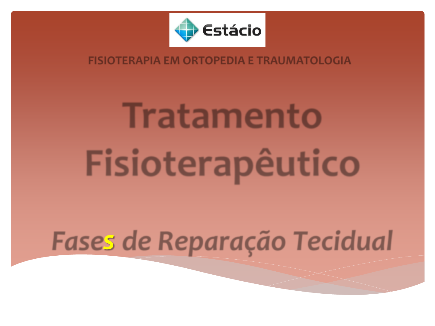 Tratamento Fisioterapêutico Fases de Reparação Tecidual FISIOTERAPIA EM ORTOPEDIA E TRAUMATOLOGIA TRATAMENTO De acordo com a Fase de Reparação Tecidual Tratamento FASE I - INFLAMATÓRIA = Do momento da lesão até 3 a 5/7 dias FASE II – PROLIFERATIVA = 48hs após a lesão até 21 dias, podendo chegar a até 8 semanas FASE DE III – REMODELAÇÃO = Dos primeiros dias após a lesão até vários meses ou anos Reparo Tecidual Reparo Tecidual Estágios da resposta dos tecidos moles à lesão – Fisioterapia Ortopédica, página 135. TRATAMENTO FASE I - inflamatória • PRICE • TENS / LASER / USP (20%) • Dispositivos auxiliares • Terapia Manual •Alongamento e Exercícios isométricos* * Nos tecidos ao redor da lesão TRATAMENTO FASE II – proliferativa •Modalidades terapêuticas: Laser, USP (50%) •Terapia Manual e Alongamento •Fortalecimento (CCA – concêntrico) TRATAMENTO FASE III - remodelagem •Progressão dos exercícios de fortalecimento •Atividades funcionais (principalmente envolvendo atividades excêntricas) •Treino Estabilização Articular INDEPENDENTE DA GRAVIDADE OU DO TIPO DE TECIDO LESIONADO (Músculos, Tendões, Ligamentos...), TODAS AS LESÕES PASSAM PELAS 3 FASES DE REPARAÇÃO TECIDUAL! O tempo de recuperação será diferente! Importante: