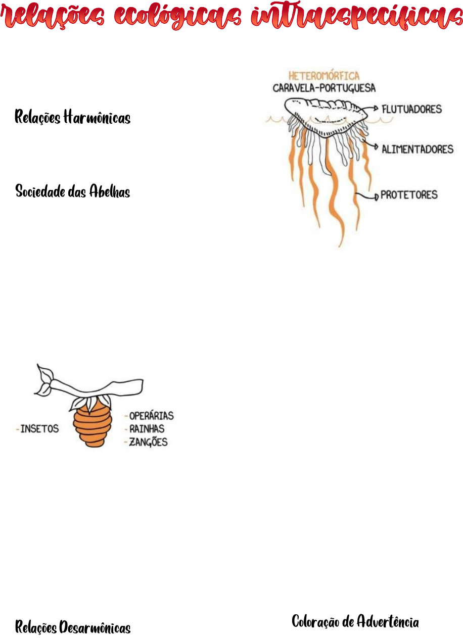 • Ocorre com indivíduos da mesma espécie • Também chamadas de relações de alelobiose • Positivas para ambos os seres vivos ▪ Sociedade: Seres da mesma espécie divide tarefas o Operárias: cuidam da colmeia, produzem o mel, alimentam a prole, limpam a colmeia, defesa da colmeia e são estéreis o Rainha: única fêmea fértil, única capaz de gerar prole, dura muitos anos o Rainhas conseguem formar um zigoto sem que exista fecundação chamado partenogênese formando um zangão o Rainha + Zangão = Formam uma operaria o Geleia real transforma uma operária em uma rainha. ▪ Colônia: união anatômica (grudados pelo corpo) entre indivíduos da mesma espécie, podendo ou não ter divisão de tarefas ▪ Com divisão de tarefas: Heteromorfa (caravelas) ▪ Sem divisão de tarefas: Isomorfa (bactérias e corais) Gregarismo: ▪ Aglomeração de indivíduos da mesma espécie ▪ Estratégia de proteção ▪ Não existe divisão social ou tarefas (indivíduos da mesma espécie) ▪ Competição desarmônica ▪ Motivo: alimento, espaço, parceiro sexual ▪ Prejudicial a ambos os indivíduos, pois pode perder: energia e tempo. ▪ Canibalismo ▪ Se alimenta de um individuo da mesma espécie ▪ EX: Louva-a-Deus ▪ Fêmeas matam o macho e o usa como energia para produzir os ovos ▪ EX²²²²²² 2: Aranha de costas vermelhas e aranha caranguejeira ▪ Mecanismos de adaptação o Camuflagem: individuo ou organismo se assemelha ao ambiente (local onde ele vive) o Homocromia: coloração críptica, cor do indivíduo parece com a cor do ambiente o Homotipia: possui o formato semelhante ao meio Mimetismo: quando um ser vivo imita outro ser vivo com objetivo de proteção contra predadores, podem ser: o Batesiano: organismo inofensivo imita um perigoso (Mariposa-Coruja) o Mulleriano: organismo perigoso que imita outro perigoso (borboleta licoria e heliconium reforça o padrão de advertência) o Peckhamiano: predador fica parecido com a presa (aranha formiga) o Aposematismo o Indivíduos com cores muito vibrantes que são perigosos ou impalataveis o Predadores sabem que estes animais são perigosos, portanto, não ousam a chegar perto