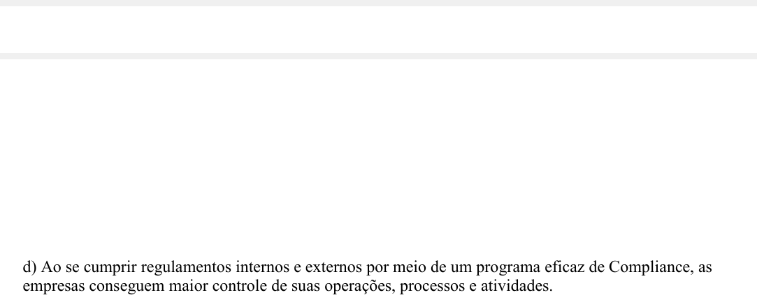 ATIVIDADES 1. Conforme os autores Coimbra e Manzi (2010), Compliance: “Vem do verbo em inglês ‘To Comply’, que traduzido significa ‘cumprir’, ‘executar’, ‘satisfazer’, ‘realizar o que lhe foi imposto’. Sobre o Compliance é CORRETO o que se afirma em: a) Compliance significa somente o dever de cumprir com a legislação das corporações. b) Um programa eficaz de Compliance restringe-se somente ao cumprimento do código de ética da empresa. c) A origem do termo Compliance nas empresas data-se do ano de 1913 com a criação do Banco Central Americano que tinha como finalidade a criação de um sistema financeiro mais robusto. d) Ao se cumprir regulamentos internos e externos por meio de um programa eficaz de Compliance, as empresas conseguem maior controle de suas operações, processos e atividades. e) O Compliance não estabelece deveres e obrigações que devem ser obedecidos pelas Corporações. 2. Os programas modernos de Compliance surgiram posteriormente ao escândalo antitruste na indústria de energia elétrica no início de 1960. Assim, em decorrência de preços altos e uma manipulação geral envolvendo fabricantes de equipamentos elétricos, como a General Eletric e a Westinghouse, pessoas físicas e jurídicas foram condenadas por violações antitruste. Sobre o surgimento do Compliance é INCORRETO o que se afirma em: a) A repercussão do caso e publicidade das primeiras penas de prisão na história de 1970 anos de Sherman Antitrust Act estimulou o desenvolvimento de códigos de conduta de cumprimento antitruste. b) No ano de 1977 foi aprovado pelo Congresso o Foreign Corrupt Practices Act (FCPA), que instituiu como crime a prática de subornos que facilitava negócios em países estrangeiros. c) Os escândalos relacionados aos subornos, desaceleraram a implementação de códigos de ética e conduta por parte das empresas. d) Os programas de compliance foram marcados pelas Diretrizes Federais de Condenação para o Crime Organizacional nos Estados Unidos em 1991. e) As diretrizes da Condenação para a Organização proporcionou às empresas um impulso para implementação de programa efetivo de cumprimento de Compliance. 3. O Compliance é responsável por operacionalizar suas atividades de forma rotineira e permanente, monitorando as diversas áreas e unidades da organização. Sobre o Compliance, analise as proposições a seguir: I) Uma das funções do Compliance é o registro e controle das informações, com a finalidade de tornar mais nítidos os processos internos e externos das empresas. II) “Estar em Compliance” é implementar técnicas com a finalidade de inibir fraudes ou estabelecer ações para evitar que as fraudes possam acontecer III) Em um programa de Compliance, nenhum recurso deixa de ser registrado, e são toleradas condutas provenientes de situações obscuras. IV) Estar em Compliance proporciona que as operações das instituições obtenham informações obsoletas das transações efetuadas. Estão INCORRETAS as questões: a) I e III. b) II e III. c) II e IV. Corbolin Realce d) I e IV. e) III e IV. 4. É importante você entender que o principal intuito dos controles internos de um programa eficaz de Compliance é prevenir ações irregulares nas empresas, tornando-se assim uma das principais ferramentas de proteção para empresa. Sobre o Compliance é CORRETO o que se afirma em: a) Estar em Compliance, permite que a administração tenha mais clareza nas informações, bem como nos dados gerados no sistema. b) “Ser compliance” é impulsionar procedimentos e práticas obscuras nas organizações. c) “Ser e Estar em compliance” não envolve os deveres de cada colaborador das empresas. d) Compliance não implica na obrigação por parte das instituições de cumprir os regulamentos internos e externos inerentes às atividades da organização. d) Compliance não implica na obrigação por parte das instituições de cumprir os regulamentos internos e externos inerentes às atividades da organização. e) Em um programa eficaz de Compliance não é necessário investimento em pessoas, processos e práticas de conscientização. 5. Compliance abrange as barreiras legais e regulamentares, e incorpora princípios de integridade e conduta ética. Dessa forma, uma das funções do Compliance é estabelecer um controle associado à diminuição da incerteza em relação a eventos futuros. Partindo desse pressuposto, é INCORRETO o que se afirma em: a) Quanto melhor o controle, menor o risco. O controle proporciona o aumento da eficácia, pois pode reduzir custos ou ainda reduzir o tempo dos processos. b) Os controles internos podem alcançar eficiência e eficácia quando a Alta Administração e Diretoria se certificarem de que os objetivos das operações da Entidade estão sendo alcançados (objetivos das operações). c) Um outro ponto a ser observado é verificar se a estrutura de controle adotada pela entidade está em conformidade com a sua respectiva missão. d) É importante que, em programa de Compliance, todos os colaboradores apresentem um alto grau de conhecimento sobre as atividades inerentes a sua função, estando atentos ao cumprimento das normas. e) Em um programa de Compliance não é necessário observar se as leis e regulamentos aplicáveis estão sendo cumpridos. 6. A dimensão “controle como função de Compliance” apresenta cinco focos diretamente integrados às funções, processos e atividades executados que são: ambiente de controle, identificação e avaliação de riscos, atividades de controle, monitoramento, informação e comunicação. Sobre esse cinco pontos, aponte a alternativa CORRETA: a) Identificação e Avaliação de Riscos: relaciona-se diretamente à consciência de controle dos funcionários, pois reflete o comprometimento de todos. b) Atividades de Controle: envolve o ato de avaliar as tarefas analisando a probabilidade de os riscos ocorrerem, bem como o impacto que eles