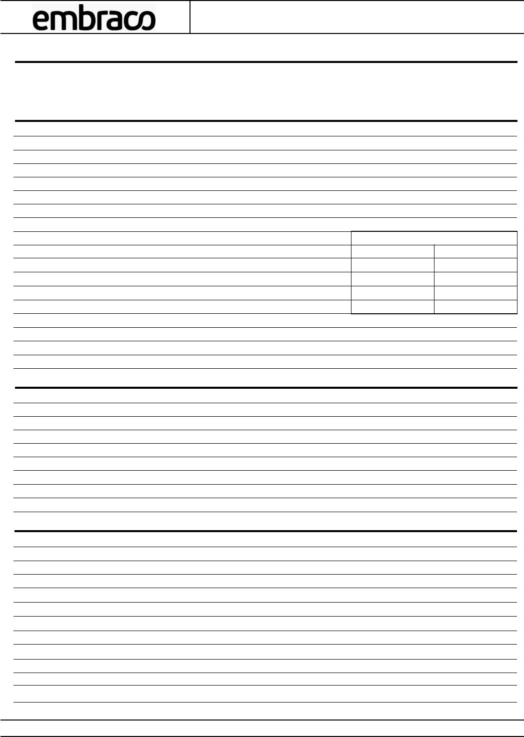 COMPRESSOR TECHNICAL DATA UPDATE: 14MAY2013 513306556 COMPRESSOR DEFINITION Designation EM U60CLP Nominal Voltage/Frequency 220 V 60 Hz Engineering Number 513306556 Hermetic reciprocating compressor -35°C to -10°C R-600a A - APPLICATION / LIMIT WORKING CONDITIONS 1 Type 4.1 Evaporating temperature range 2 Refrigerant 8 Compressor cooling 8.1 LBP (32ºC Ambient temperature) 8.2 LBP (43ºC Ambient temperature) 8.3 HBP (32ºC Ambient temperature) 8.4 HBP (43ºC Ambient temperature) 9 Maximum condensing temperature 9.1 Operating (gauge) 9.2 Peak (gauge) Static Static - - 6.9 7.8 (-31°F to 14°F) (98 psig) (111 psig) [kgf/cm²] [kgf/cm²] 220 / 603 Nominal voltage and frequency Low Back Pressure4 Application type RSIR5 Motor type LST - Low Starting Torque6 Starting torque Capillary tube7 Expantion device / ºC - ºF / ºC - ºF 10 Maximum winding temperature 130 [ °C ] [ V / Hz ] B - MECHANICAL DATA 2 Displacement [cm³] (0.552 cu.in) 9.04 1/61 Commercial designation [hp] 3 Lubricant charge 3.2 Lubricants type/viscosity 4 Weight (with oil charge) 5 Nitrogen charge - [ml] (6.09 fl.oz.) [kg] (18.96 lb.) [kgf/cm²] 180 ALQUILB / ISO5 8.6 2.1 Bore [mm] 2.2 Stroke [mm] 24.000 20.000 3.1 Lubricants approved C - ELETRICAL DATA 1 Nominal Voltage/Frequency/Number of Phases 220 V 60 Hz 1 ~ (Single phase) 11 Approval boards certification TUV 2 Starting device type 5 Motor protection 7 Run winding resistance 8 LRA - Locked rotor amperage (60 Hz) 9 FLA - Full load amperage L/MBP (60 Hz) 19.40 12.10 7.45 2.79 4TM283NFBYY-53 at 25ºC (77ºF)] +/- 8% [A] - Measured according to UL 984 [A] - Measured according to UL 984 6 Start winding resistance 10 FLA - Full Load Amperage HBP (60 Hz) 3.21 [A] - Measured according to UL 984 PTC 2.1 Starting device [W at 25ºC (77ºF)] +/- 8% [W -4 Run capacitor [µF(VAC minimum)] -3 Start capacitor [µF(VAC minimum)] - 198 to 242 V - 198 to 242 V - - - - Operating voltage range 50 Hz 60 Hz 7M220MC1/8EA17C1/QPS2-A22MG1 COMPRESSOR TECHNICAL DATA UPDATE: 14MAY2013 513306556 D - PERFORMANCE - CHECK POINT DATA TEST CONDITIONS: -23.3°C (-9.94°F) (Condensing temperature 597 150 175 124 1.01 1.87 4.81 1.21 1.41 Cooling capacity +/- 5% [Btu/h] [kcal/h] [W] [W] Current consumption +/- 5% [A] EFFICIENCY RATE [kg/h] [Btu/Wh] [kcal/Wh] [W/W] +/- 7% @220V60Hz Evaporating temperatureASHRAELBP32 Static 54.4°C (129.92°F)) Gas flow rate +/- 5% Power consumption +/- 5% E - PERFORMANCE - CURVES 35ºC (+95ºF) ) @220V60Hz ASHRAE32 (Condensing temperatureTEST CONDITIONS: Static Evaporating temperature °C (°F) [Btu/h] [kcal/h] [W] [W] Current consumption +/- 5% [A] [kg/h] 1247 314 365 150 1.09 3.93 794 200 233 125 1.02 2.49 623 157 183 114 0.99 1.96 481 121 141 103 0.97 1.51 -30 (-22) -25 (-13) -20 (- 4) -10 (+14) [Btu/Wh] [kcal/Wh] [W/W] 8.29 2.09 2.43 6.35 1.60 1.86 5.46 1.38 1.60 4.63 1.17 1.36 -15 (+ 5) 1000 252 293 137 1.05 3.15 7.30 1.84 2.14 1.13 -35 (-31) 360 91 105 92 0.95 3.87 0.97 1.13 EFFICIENCY RATE +/- 7% Gas flow rate +/- 5%+/- 5% Power consumption +/- 5% Cooling capacity 45ºC (+113ºF) ) @220V60Hz ASHRAE32 (Condensing temperatureTEST CONDITIONS: Static Evaporating temperature °C (°F) [Btu/h] [kcal/h] [W] [W] Current consumption +/- 5% [A] [kg/h] 1179 297 346 160 1.12 3.72 737 186 216 130 1.04 2.32 572 144 168 117 1.01 1.80 436 110 128 105 0.98 1.37 -30 (-22) -25 (-13) -20 (- 4) -10 (+14) [Btu/Wh] [kcal/Wh] [W/W] 7.37 1.86 2.16 5.65 1.42 1.66 4.88 1.23 1.43 4.16 1.05 1.22 -15 (+ 5) 937 236 275 144 1.07 2.95 6.49 1.63 1.90 1.01 -35 (-31) 322 81 94 93 0.96 3.50 0.88 1.03 EFFICIENCY RATE +/- 7% Gas flow rate +/- 5%+/- 5% Power consumption +/- 5% Cooling capacity 55ºC (+131ºF) ) @220V60Hz ASHRAE32 (Condensing temperatureTEST CONDITIONS: Static Evaporating temperature °C (°F) [Btu/h] [kcal/h] [W] [W] Current consumption +/- 5% [A] [kg/h] 1125 283 330 169 1.14 3.55 695 175 204 135 1.05 2.18 537 135 157 121 1.01 1.69 409 103 120 107 0.98 1.28 -30 (-22) -25 (-13) -20 (- 4) -10 (+14) [Btu/Wh] [kcal/Wh] [W/W] 6.66 1.68 1.95 5.14 1.29 1.50 4.45 1.12 1.30 3.82 0.96 1.12 -15 (+ 5) 889 224 260 151 1.09 2.80 5.88 1.48 1.72 0.95 -35 (-31) 304 77 89 94 0.96 3.26 0.82 0.96 EFFICIENCY RATE +/- 7% Gas flow rate +/- 5%+/- 5% Power consumption +/- 5% Cooling capacity COMPRESSOR TECHNICAL DATA UPDATE: 14MAY2013 513306556 E - PERFORMANCE - CURVES 65ºC (+149ºF) ) @220V60Hz ASHRAE32 (Condensing temperatureTEST CONDITIONS: Static Evaporating temperature °C (°F) [Btu/h] [kcal/h] [W] [W] Current consumption +/- 5% [A] [kg/h] 1058 267 310 177 1.17 3.34 643 162 189 140 1.06 2.02 494 125 145 124 1.02 1.55 375 94 110 109 0.98 1.18 -30 (-22) -25 (-13) -20 (- 4) -10 (+14) [Btu/Wh] [kcal/Wh] [W/W] 5.99 1.51 1.75 4.60 1.16 1.35 3.99 1.01 1.17 3.43 0.87 1.01 -15 (+ 5) 829 209 243 157 1.11 2.61 5.27 1.33 1.54 0.87 -35 (-31) 279 70 82 94 0.95 2.94 0.74 0.86 EFFICIENCY RATE +/- 7% Gas flow rate +/- 5%+/- 5% Power consumption +/- 5% Cooling capacity COMPRESSOR TECHNICAL DATA UPDATE: 14MAY2013 513306556 New Base Plate EUEM No F - EXTERNAL CHARACTERISTICS 1 Base plate 2 Tray holder 3 Connectors 3.1 SUCTION 6.5 +0.12/-0.08 3.1.1 Material Copper 3.1.2 Shape Slanted 42º up + 45° to Back 3.2 DISCHARGE 3.2.1 Material 4.94 +0.08/-0.08 Copper 3.2.2 Shape Slanted 42° up + 24° to Back 3.4 Oil cooler (Copper) 3.3 PROCESS 6.5 +0.12/-0.08 3.3.1 Material 3.3.2 Shape Copper Slanted 45° up + 45° to Back No 3.5 Connector sealing Rubber Plugs [mm] (0.256" +0.005"/-0.003") [mm] (0.194" +0.003"/-0.003") [mm] (0.256" +0.005"/-0.003") [mm]