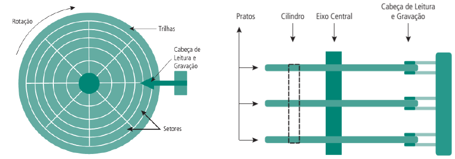 5 Memória Secundaria Os discos magné cos são ainda os componentes mais importantes da memória externa. Esses pos de discos são usados desde computadores pessoais simples até supercomputadores. O principal atra vo é a sua ampla capacidade de armazenamento. Outros disposi vos largamente u lizados como memória de armazenamento secundário e como armazenamento de segurança (backup) são os discos óp cos CDs e DVDs. Nas sessões seguintes serão explorados os conceitos de ambas as tecnologias. 5.1 Organização e funcionamento dos discos magné�cos Um disco rígido (Hard Disk ou HD) é formado por uma ou mais super*cies, chamadas de pratos. Essa super*cie é circular, fina e coberta por uma camada de material magne zável. Atualmente, as duas super*cies (as duas faces) do prato são cobertas por este material magné co. Cada face do prato de um disco é organizada em áreas circulares concêntricas, denominadas de trilhas. Em geral, como cada trilha possui grande capacidade de armazenamento em bytes, elas são divididas em partes menores, chamadas de setores. Figura 16 Vista superior de um prato do HD Figura 17 Vista lateral dos pratos montados Mesmo que haja diferença no tamanho *sico dos setores, eles armazenam sempre a mesma quan dade de informação, ou seja, 512 bytes. Isso se deve à densidade magné ca de cada setor e pela não existência de trilhas próximas das bordas do prato e nem próximas ao centro. O disco completo (ou seja, todos os pratos) gira numa velocidade constante em torno do seu eixo, podendo variar de 4.200 RPM a 7.200 RPM nas unidades u lizadas em computadores desktop. Em computadores servidores, essa rotação pode chegar a 15.000 RPM. Assim como nas trilhas, os setores do disco são iden ficados por um endereço, de S0 a S-1, que são definidas todas no momento da formatação do disco. Sobre cada prato, que tem duas super*cies u lizadas para leitura e gravação, o braço transporta a cabeça de leitura e gravação, realizando um movimento transversal sobre as trilhas. O mecanismo do disco que executa o movimento do braço chama-se atuador. Uma das caracterís cas do funcionamento dos discos rígidos relaciona-se ao tempo gasto nas etapas para leitura e escrita. O tempo gasto entre o instante de início da leitura ou escrita e seu término é chamado de tempo de acesso, e é formado pelos tempos mostrados no Quadro abaixo. Organização e Arquitetura de Computadores 31 Um dos módulos do sistema operacional chama-se Sistema de Arquivos, que faz o controle sobre as leituras e gravações no disco. Os sistemas de arquivos mais comuns são o FAT32 e NTFS (existem outros como Ext2, Ext3, RaiserFS, do Linux). O conjunto de vários setores do disco forma os clusters, que são referenciados por um único endereço pelo sistema operacional. A quan dade de setores usados para cada cluster depende do po de sistema de arquivos escolhido. Por exemplo, no sistema NTFS, os clusters variam de 512 bytes a 4 Kbytes. Já no FAT32, variam entre 2 e 32Kbytes, sempre dependendo do tamanho do disco. Figura 18 Exemplo de sistema de arquivos do HD (FAT) Organização e Arquitetura de Computadores 32 5.2 Armazenamento com discos óp�cos A memória óp ca é um dos mais bens sucedidos produtos comerciais de todos os tempos. Criado inicialmente para um sistema de áudio digital de disco compacto, o CD é um disco que não pode ser apagado e tem capacidade para armazenar mais de 60 minutos de informação. Com a evolução dos armazenamentos óp cos, como o CD-R e o DVD, uma variedade de novos sistemas foram introduzidos. Devido à alta capacidade de armazenamento (entre 650 e 750 MB) e à alta confiabilidade, surgiram três pos de CDs no mercado: CD-ROM, CD-R e CD-RW. CD-ROM (Compact Disc – Read Only Memory) - Foi o primeiro po u lizado pela indústria. U liza um sistema óp co para marcação dos bits (0s e 1s), diferente dos discos rígidos, que u lizam meios magné cos. Esse disco é composto, em geral, por policarbonato, fabricado sob forma circular e têm espessura de 1,2 mm e diâmetro de 12 cm. O processo de gravação é feita uma só vez na origem (como por exemplo, uma empresa fonográfica ou um fabricante de soNware), em que são marcados os elementos da informação e logo depois essa matriz é reproduzida em diversos outros discos, que é determinado pelo lote do fabricante. Empresas de soNware (como a MicrosoN) ou empresas fonográficas (como a Sony) u lizam esses pos de CDs para distribuir seus grandes volumes de programas ou músicas, por serem mais econômicos. Diferentemente dos discos rígidos, que possuem várias trilhas concêntricas, os CDs possuem apenas uma trilha, criada em espiral a par r de um ponto próximo ao centro do disco (observe a Figura 8.4). Com o propósito de aumentar a capacidade do disco, foi criada apenas uma trilha, onde contém todos os blocos com a mesma capacidade de armazenamento, do início ao final. O processo usado para gravar dados no disco é, em linhas gerais, simples. Ele ocorre a par r do uso de um feixe de alta intensidade para criar no disco as valas (pits), separadas por regiões planas (lands). O valor do bit 1 é definido pela passagem de uma vala para uma super*cie plana, e dessa para uma vala. O valor do bit 0 é representado pelo espaço entre as valas. CD-R (Compact Disc Recorded) - No caso de obtenção de poucas cópias (baixos volumes) de CDs, o processo de gravação de CD-ROMs torna-se caro. A solução encontrada foi fabricar CDs virgens (bem mais baratos) e um gravador especial de CD para uso público. Dessa forma, o processo de gravação passou a ser individual (por CD) e não por matriz e prensagem, como é o caso dos CD-ROMs. Surgiu então um novo po de CD, chamado de CD-R. Um CD-R tem caracterís ca diferente do CD-ROM com relação à existência de uma camada refletora de alumínio, que é plana e possui uma camada adicional, a va, cons tuída de um corante fotossensível. Durante o processo de gr