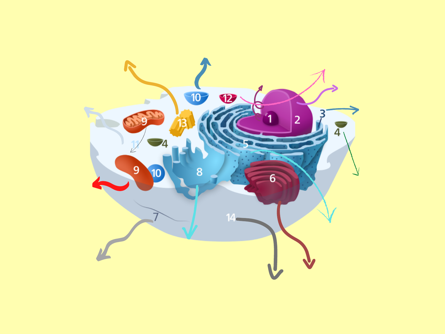 10. Os vacúolos são estruturas celulares envolvidas por membrana plasmática, muito comuns em plantas e presentes também em protozoários e animais. Tem diferentes funções como: regular pH, controlar a entrada e saída de água por osmorregulação, armazenar substâncias, fazer a digestão e excretar os resíduos. 11. O Citoplasma responsável por armazenar substâncias químicas fundamentais para a manutenção da vida. Delimitado pela membrana plasmática e pelo núcleo, o citoplasma preenche todo o interior das células eucariontes 8. Retículo Endoplasmático Liso (REL) dentre as várias funções deste retículo, destaca-se a síntese de lipídeos como fosfolipídeos, óleos e esteroides (incluindo os hormônios sexuais estrogênio e testosterona). 9. A função da mitocôndria é de gerar energia, ocorre através do processo conhecido como respiração celular. Além de oxidar moléculas derivadas da glicose, as mitocôndrias também são responsáveis pela oxidação de ácidos graxos, também com intuito de gerar ATP. 12. Lisossomos originários do aparelho de golgi, os lisossomos são bolsas membranosas que contêm enzimas capazes de digerir substâncias orgânicas. estas organelas são as responsáveis pela digestão intracelular e a sua produção excessiva pode destruir uma célula por autodigestão. 7. O citoesqueleto é uma rede de fibras proteicas localizada no citoplasma das células, é uma estrutura dinâmica que se reorganiza ao longo do ciclo celular. Isto possibilita que a célula mude sua forma, se for necessário, e que sofra contração para permitir o deslizamento e movimentação. 13.Centrossomo ou centro celular é o local onde partem os microtúbulos do citoesqueleto, é o centro organizador próximo do núcleo. Ele consiste de duas estruturas cilíndricas compactas que são conhecidas como centríolos e o material que o circunda, nas células animais. 14. Uma das principais funções da membrana plasmática é controlar o que entra e o que sai do interior da célula, uma propriedade conhecida como permeabilidade seletiva. Por ser formada por uma bicamada lipídica, ela é impermeável à maior parte das moléculas solúveis em água. 5.Retículo endoplasmático rugoso é formado por membranas que se assemelham a "sacos achatados" e possui ribossomos aderidos a sua superfície, também é responsável pela síntese proteica. 4.Vesícula é uma pequena estrutura, que consiste num fluído incluso por uma bicapa lipídica. As vesículas transportam ou digerem produtos celulares ou resíduos. 6.Complexo de Golgi localiza-se próximo ao núcleo celular e é formado por sáculos achatados e vesículas. É a organela responsável pela secreção celular. 3. Os Ribossomos são pequenas estruturas em forma de grânulo. São encontrados tanto em indivíduos eucariontes quanto procariontes e não possuem carioteca. 1. Nucléolo é uma estrutura celular que está presente no núcleo das células eucariontes, é onde são produzidos os RNA’s ribossômicos. 2. O Núcleo é responsável por guardar o material genético, o DNA do ser vivo e comandar tudo o que acontece dentro da célula.