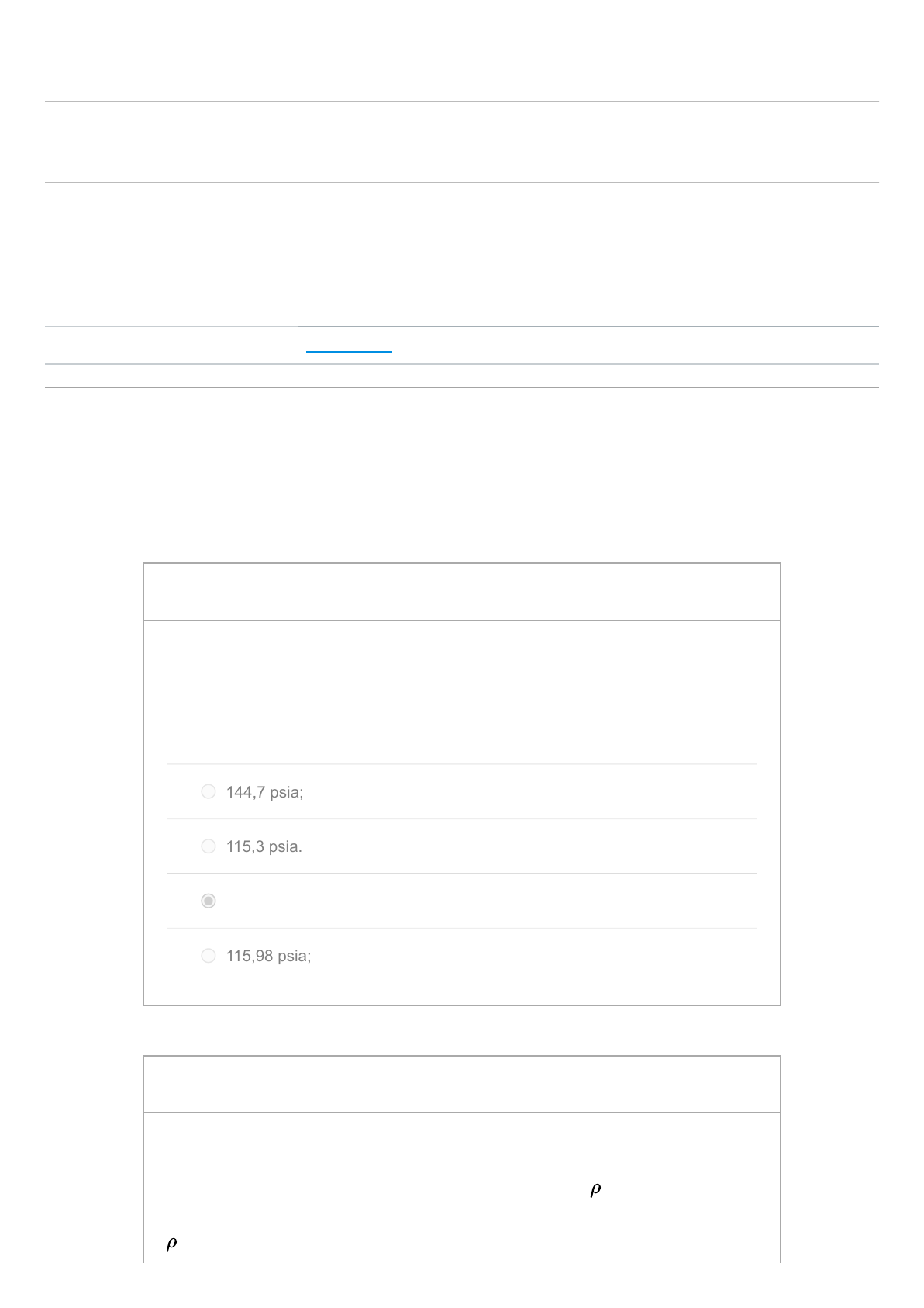 21/03/2021 UNIDADE II_TEORIA_1_2021: Fenômenos de Transportes - Engenharia de Produção - Campus Poços de Caldas - PPC - Manhã … https://pucminas.instructure.com/courses/63739/quizzes/172848 1/6 UNIDADE II_TEORIA_1_2021 Entrega 21 mar em 23:59 Pontos 3 Perguntas 10 Disponível 15 mar em 14:00 - 21 mar em 23:59 6 dias Limite de tempo Nenhum Histórico de tentativas Tentativa Tempo Pontuação MAIS RECENTE Tentativa 1 121 minutos 2,4 de 3 As respostas corretas estarão disponíveis em 22 mar em 0:00. Pontuação deste teste: 2,4 de 3 Enviado 21 mar em 23:06 Esta tentativa levou 121 minutos. 0,3 / 0,3 ptsPergunta 1 Uma indústria está localizada em uma área cuja pressão atmosférica é de 725 mmHg. Um manômetro instalado em uma linha de alta pressão indica 130 psig. Determinar a pressão absoluta do vapor em (psia) . 144,7 psia; 115,3 psia. 144,02 psia; 115,98 psia; 0,3 / 0,3 ptsPergunta 2 Considere dois veículos iguais parados, e assumindo que o tanque de combustível de um esteja abastecido com gasolina ( = 680 kg/m³) e que o tanque do outro esteja abastecido com mesmo volume de etanol ( = 789 kg/m³) , é correto afirmar que: ρ ρ https://pucminas.instructure.com/courses/63739/quizzes/172848/history?version=1 21/03/2021 UNIDADE II_TEORIA_1_2021: Fenômenos de Transportes - Engenharia de Produção - Campus Poços de Caldas - PPC - Manhã … https://pucminas.instructure.com/courses/63739/quizzes/172848 2/6 A pressão no fundo dos dois tanques é a mesma, pois o tipo de combustível não influencia na pressão. A pressão no fundo do tanque com gasolina é menor que a pressão no mesmo ponto no tanque com etanol. A pressão no fundo do tanque com etanol é menor que a pressão no mesmo ponto no tanque com gasolina. Em qualquer ponto que seja medida a pressão dentro dos tanques o valor seria o mesmo. 0,3 / 0,3 ptsPergunta 3 Dois reatores são conectados por um tubo em U com mercúrio em seu interior. Sabendo que a pressão no reator 2 é maior que no reator 1 e que a pressão no reator 1 é de 98280 Pa, determinar as pressões relativa e absoluta no reator 2, em (Pa). O desnível do mercúrio é de 550 mm e a densidade do mercúrio 13600 kg/m . Dado: aceleração da gravidade, g= 9,81 m/s 3 2 1,70 e 0,73 atm 73300 e 171580 Pa 0,73 e 1,70 atm 173080 e 74800 Pa 74800 e 74800 Pa 21/03/2021 UNIDADE II_TEORIA_1_2021: Fenômenos de Transportes - Engenharia de Produção - Campus Poços de Caldas - PPC - Manhã … https://pucminas.instructure.com/courses/63739/quizzes/172848 3/6 0 / 0,3 ptsPergunta 4IncorretaIncorreta A Estática dos Fluidos é uma área importante da Mecânica dos Fluidos. Marque a opção que melhor define a área de aplicação da Estática dos Fluidos. Aplica-se à análise de fluidos incompressíveis; Aplica-se à análise de fluidos em movimento; Aplica-se à análise de fluidos viscosos; Aplica-se à análise de fluidos em repouso. 0,3 / 0,3 ptsPergunta 5 O piezômetro é um dispositivo usado para: medir a pressão através de uma membrana elástica; medir a pressão através de uma coluna de fluido; medir a pressão através de um manômetro diferencial; medir a pressão através de um mostrador com ponteiro. 0 / 0,3 ptsPergunta 6IncorretaIncorreta CANO (2018) Determinar a pressão absoluta, em (kPa), nos ouvidos de um mergulhador a 200 m de profundidade em água (massa específica 998kg/m ) e a quantidade de vezes que esta pressão é maior do que a pressão atmosférica. 3 21/03/2021 UNIDADE II_TEORIA_1_2021: Fenômenos de Transportes - Engenharia de Produção - Campus Poços de Caldas - PPC - Manhã … https://pucminas.instructure.com/courses/63739/quizzes/172848 4/6 1957,4 kPa e 19,3 vezes 2058,7 kPa e 20,3 vezes 101,3 kPa e 20 vezes 1957,4 kPa e 20,3 vezes 0,3 / 0,3 ptsPergunta 7 Um tanque aberto para a atmosfera armazena glicerina. Determinar a pressão de um elemento fluido a uma profundidade de 20 cm e a pressão manométrica neste mesmo ponto, em (kPa). Massa específica da glicerina = 1260 Kg/m .3 103,78 e 2,48 kPa 2,479 e 2,48 kPa 103,78 e 248 kPa 2,48 e 103,78 kPa 0,3 / 0,3 ptsPergunta 8 Ao nível do mar, uma atmosfera normal equivale a: a) 760 mmHg; b) 14, 7 psia; c) 1,033 Kgf/cm ; d) 0,968 atm; e) 10,332 mca; f) 101,3 kPa. 2 21/03/2021 UNIDADE II_TEORIA_1_2021: Fenômenos de Transportes - Engenharia de Produção - Campus Poços de Caldas - PPC - Manhã … https://pucminas.instructure.com/courses/63739/quizzes/172848 5/6 a,b,c,f. a,b,c,e,f; a,c,e,f; a,b,e,f; 0,3 / 0,3 ptsPergunta 9 Assinalar a (s) frase (s) corretas: A pressão em um fluido homogêneo em equilíbrio estático varia linearmente com a profundidade; A pressão que um fluido exerce no fundo de um vaso é sempre igual ao quociente do peso do fluido pela área do fundo; Superfície de nível é uma superfície de cota nula. A pressão exercida por um fluido em equilíbrio é proporcional à sua viscosidade; 0,3 / 0,3 ptsPergunta 10 Um recipiente contém 500 litros de hidrogênio à pressão absoluta de 2,0 kgf/cm . A seguir, é comprimido, reduzindo seu volume para 160 litros. Determinar a nova pressão absoluta em (Pa), o módulo de elasticidade volumétrica em (Pa) e o coeficiente de compressibilidade em condições isotérmicas (temperatura constante) e assumindo comportamento de gás ideal. 2 21/03/2021 UNIDADE II_TEORIA_1_2021: Fenômenos de Transportes - Engenharia de Produção - Campus Poços de Caldas - PPC - Manhã … https://pucminas.instructure.com/courses/63739/quizzes/172848 6/6 196200Pa; 613125Pa; 1,63.10 ;-6 2038,74Pa; 6371,05Pa; 1,5696.10 ;-4 196200Pa; 6371,05Pa; 1,5696.10 .-4 20000Pa; 6250Pa; 1,63.10 ;-4 Pontuação do teste: 2,4 de 3