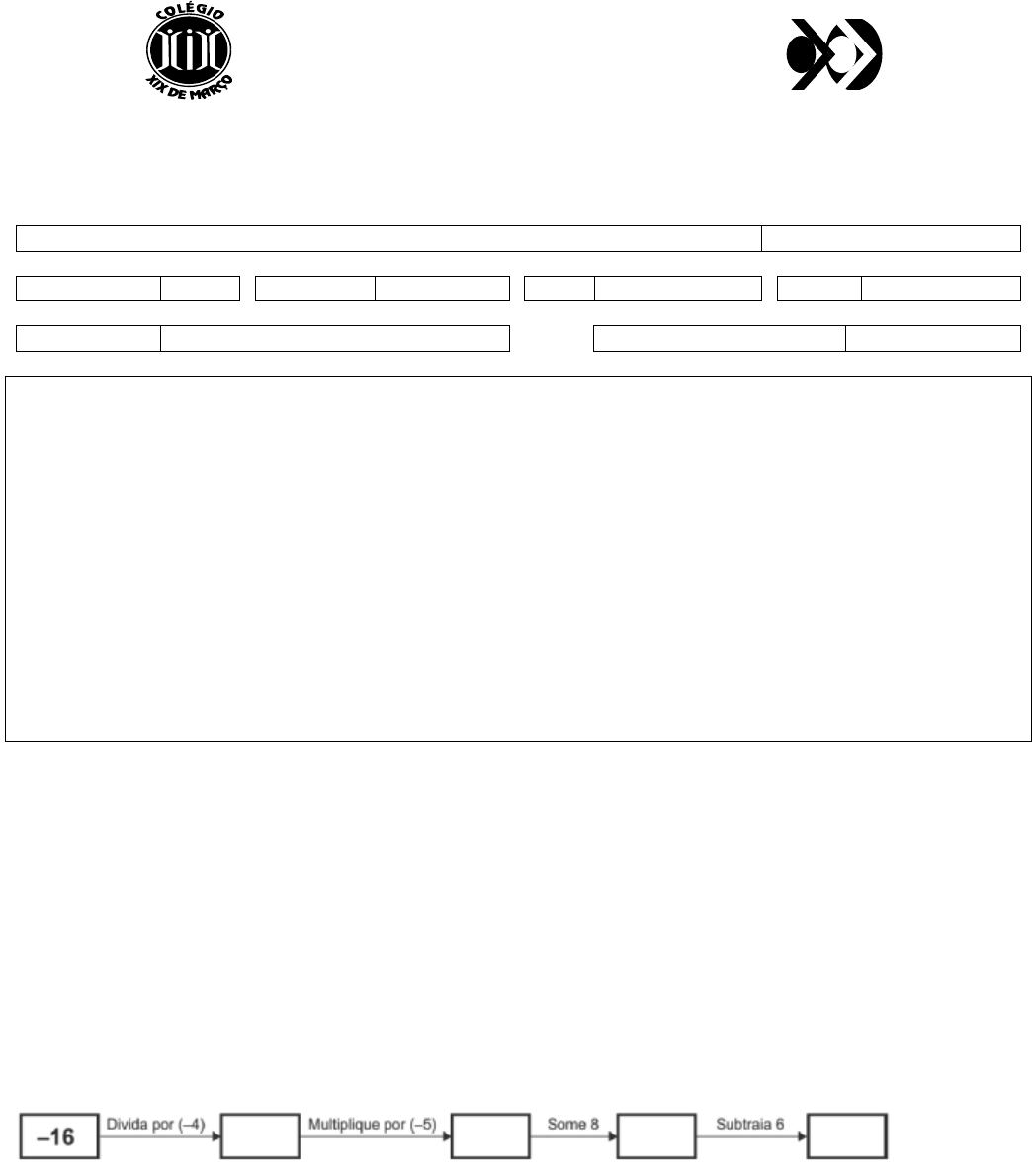 1ª PP de Matemática / 7º ano /Cláudia / Pág. 1 2016 1ª PROVA PARCIAL DE MATEMÁTICA Aluno(a): Nº Ano: 7º Turma: Data: 09/04/2016 Nota: Professor(a): Cláudia Meazzini Sepulvene Valor da Prova: 40 Pontos Orientações gerais: 1) Número de questões desta prova: 15 2) Valor das questões: Abertas (5): 4,0 pontos cada. Fechadas (10): 2,0 pontos cada. 3) Provas feitas a lápis ou com uso de corretivo não têm direito à revisão. 4) Aluno que usar de meio ilícito na realização desta prova terá nota zerada e conceituação comprometida. 5) Tópicos desta prova: -Números inteiros relativos -Oposto, reta numérica, comparação. -Operações: adição, subtração, multiplicação , divisão e potenciação. -Adição algébrica de números inteiros -Propriedades da potenciação -Expressões numéricas 1ª Questão: Em um jogo, o valor de cada ponto perdido é – 4 , e o valor de cada ponto ganho é +3. Ana perdeu 13 pontos e ganhou 15 pontos. Fazendo os cálculos, pode-se verificar que o total de pontos de Ana é: a) -10 b) -7 c) 3 d) 11 e) 14 2ª Questão: O resultado final da operação abaixo é: a) – 6 b) –20 c) –18 d) 18 e) 34 COLÉGIO XIX DE MARÇO Educação do jeito que deve ser http://matematicazup.com.br/wp-content/uploads/2014/12/saresp-prova-matematica-7-ano-2011-27.png 1ª PP de Matemática / 7º ano /Cláudia / Pág. 2 3ª Questão: Vilma viajou de São Paulo para Londres. Quando saiu de São Paulo, o termômetro do lado de fora do aeroporto marcava 21o C . Chegando a Londres, a temperatura era de – 3o C . Qual foi a variação de temperatura que ela sentiu? a) 24o C b) – 18o C c) 18o C d) – 24o C e) – 21o C 4ª Questão: Dados os números: X = – 5 + 5 – 5 Y = – 1000 + 100 – 10 + 1 Z = – 5 – ( + 8 ) + ( - 3 ) – (– 9 ) a) Qual é o menor? b) Qual é o maior? c) Coloque em ordem crescente. d) Qual o sucessor do valor de x? 5ª Questão: Qual das operações abaixo tem o menor resultado? a) +126 – 200 b) ( +12).(- 6 ) c) ( - 100 ) : ( - 2 ) d) ( + 20 ) – ( + 89) e) ( - 150) : ( + 2) 6ª Questão: Assinale a sentença verdadeira: a) A soma de dois números negativos é sempre um número positivo. b) O produto de dois números de sinais diferentes pode ser positivo ou negativo. c) A soma de um número positivo com um número negativo pode ser um número positivo. d) A soma de dois números de sinais diferentes é sempre negativa. e) A soma de dois números inteiros opostos é um número negativo. 1ª PP de Matemática / 7º ano /Cláudia / Pág. 3 7ª Questão: Complete com V ou F e, a seguir, corrija as sentenças falsas: a) ( ) 5)3(:)15( ____________________________________________________ b) ( ) – 18 + 12 + 20 – 34 + 51 = + ________________________________________________ c) ( ) ( - 8 ) . ( - 3 ) . ( - 1 ) . (- 2) . ( + 1 ) .( + 2 ) = + 96_____________________________ d) ( ) A soma de + 10 com o antecessor de – 15 é igual a – 4 _________________________ e) ( ) – 5 2 = + 25 __________________________________________________________ f) ( ) A diferença entre – 15 e – 12 é igual a + 3 ___________________________ g) ( ) 20155 ________________________________________________________ h) ( ) 605.0.4.3 _________________________________________________ i) ( ) ( - 4 )3 = + 64 _________________________________________________________ j) ( ) ( - 3 )4 = + 81 _____________________________________________________________ 8ª Questão: Se x = 1 – [ 6 + ( 4 – 3– 5 ) – (– 9+ 6)] e y = (12 + 13) : (+ 5 – 30) – 4 : (+3 – 7) – (– 4 – 8), calcule: a) o valor de x b) o valor de y c) o valor x – y 9ª Questão: Resolva as expressões numéricas: a) (- 8 – 3). (- 11+ 4) – ( - 63 +3):(-5- 5) +( – 10 – 5 +9)= 1ª PP de Matemática / 7º ano /Cláudia / Pág. 4 b) (–12 – 2) – 3. (– 6 + 2) – 30: ( 3 – 13) = 10ª Questão: Sabe-se que x = - ( - 2 )3 – ( - 4 )3 e y = ( - 1 )3 – ( - 2 )2 – ( - 7 )0 + ( - 2 )4. Nessas condições, calcule o valor de x – y a) – 46 b) – 56 c) – 66 d) + 46 e) + 60 11ª Questão: Cada letra equivale à soma dos números dos dois blocos imediatamente abaixo. Determine o número que está no alto da pilha. a) + 97 b) - 63 c) - 63 d) - 97 e) + 17 12ª Questão: Classifique os itens abaixo em verdadeiros ( V ) ou falsos ( F ), a seguir, assinale a alternativa correta: - 33 = - 27 ( ) 24 ( ) 100 = - 10 ( ) 4643 ( ) ( - 1 )9 = + 1 ( ) a) F, V, F, V, F b) V, V, F, F, F c) V, F, V, V, F d) V, F, F, V, F e) V, V, F, V, F 13ª Questão: A diferença entre o maior e o menor resultado das expressões abaixo é: -3 + 4. (- 2) – 3. (- 5 ) e (- 1440): (+ 12) + 80 a) – 36 b) + 36 c) – 44 d) + 44 e) – 14 1ª PP de Matemática / 7º ano /Cláudia / Pág. 5 14ª Questão: Um submarino navega a uma profundidade de – 220 metros. Ele é acompanhado por um avião de treinamento da marinha, que voa a 900 m de altitude. O avião está quantos metros acima do submarino? a) 220 m. b) 680 m. c) 830 m. d) 900 m. e) 1 120 m. 15ª Questão: Transforme em uma única potência, aplicando as propriedades da potência: a) 27 22 ______________________ b) 25 3:3 ______________________ c) 324 _________________________ d) 5:55 32 __________________________ e) 3224 ])6[(:)]6.()6.()6[( = ______________________ f) ( x )7 . ( x )4 : ( x )8 = _________________________________