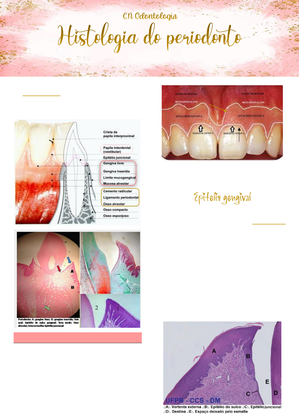 ⟹Histologia= aspectos microscópicos do periodonto (proteção e sustentação). PERIODONTO DE PROTEÇÃO ⟹Proteção externa; »Gengiva marginal (1), gengiva inserida (2), mucosa alveolar (3), linha mucogengival (4); ⟹Compostas por células de tecido conjuntivo revestidos por tecido epitelial. ⟹Do ponto de vista morfológico e funcional pode-se definir em três áreas: Epitélio externo ou oral: epitélio pavimentoso, estratificado, queratinizado, podendo ser ortoqueratinizado (núcleos das células ausentes) ou paraqueratinizado (núcleos das células presentes); Epitélio Sucular: epitélio do sulco; Epitélio Juncional: aderindo a gengiva ao dente, bem delicado, em doença periodontal, solta do dente; @c.n.odontologia (1) ) (2) (3) (4) Funções e características epitélio gengival: barreira mecânica e química contra microorganismos. Exibe alta taxa de renovação celular; »Possui adesão célula a célula (mantem integridade arquitetural) e hemidesmossomos na camada da lâmina basal (hemidesmossomos aderem o epitélio ao dente); »Principal célula Queratinócito, podendo ser encontrados Melanócitos e Células de Langerhans; |Melanoplastia: remoção da camada mais externa de epitélio para retirar a pigmentação melânica e trazer conforto estético para o paciente; Camadas do epitélio Epitélio escamoso estratificado »Estrato basal ou germinativo: capacidade de divisão celular, presença de lâmina basal em contato com o tecido conjuntivo (importante que a membrana basal tenha permeabilidade para passar os nutrientes). »Estrato espinhoso: diversas camadas celulares; |Grande quantidade de desmossomos; |Desenvolvimento de organelas ligadas a síntese proteica. »Estrato granuloso: células se tornam achatadas; |Grande acumulo de grânulos de querato-hialina no citoplasma. »Estrato córneo: perda das estruturas citoplasmáticas, perda de desmossomos, deposição de queratina, descamam, turnover celular (renovação celular); ⟹Epitélio oral: paraqueratinizado; ⟹ Epitélio do sulco e juncional: não queratinizado; Epitélio oral fornece desta forma proteção as diferentes formas de agressão. Epitélio Juncional »Mais frágil; »Comparadas às células do epitélio oral, apresentam espaços celulares mais amplos; »Menor número de desmossomos; »Ausência de queratinização; Função principal: adesão da gengiva ao dente, se faz através da lâmina basal com a presença de hemidesmossomos; »Extensão de 0,9 a 1,3 mm; »União firme ao dente; »União intercelular frágil; »Descamação celular, defesa, de apical para coronal; »Todas as células se divide, maior rapidez de renovação; »Permite penetração da sonda até início da inserção conjuntiva. »Mais fino que o gengival; »Não é queratinizado; »É translucido, vasos sanguíneos cor avermelhada. Recheando o epitélio temos: »Rico em fibras colágenas, proporciona o tônus gengival, principal célula fibroblastos; @c.n.odontologia Inserção conjuntiva: »Extensão de 1,0 a 1,5mm; »Fibras gengivais; »Pontilhado gengival, fibras inseridas no cemento supra-alveolar e no osso; »Integridade (saúde periodontal). Importância clínica: »Em um periodonto saudável, a sonda não chega até a inserção conjuntiva, para no epitélio juncional; »Respeitar a distância biológica. |O epitélio juncional migra apicalmente na doença periodontal. »Região proximal; »Depressão entre a papilas, formato de cela; »Não tem queratina, propicia o acúmulo de biofilme; Pergunta de prova: Por que essa região tem propensão a doença periodontal? Anatomia favorece acúmulo de biofilme, por não ser queratinizado as bactérias penetram facilmente e pela falta de higiene do paciente nessa região. PERIODONTO DE SUSTENTAÇÃO OU INSERÇÃO »É um tecido avascular; »Recobre a superfície radicular; »Semelhante composição com tecido ósseo (65% de porção inorgânica); »Sofre continua aposição durante a vida; »Degenera-se em contato com o meio bucal. Composição em Volume Matriz orgânica Matriz inorgânica Agua Esmalte 02 86 12 Dentina 18 70 12 Cemento 23 65 12 Osso 25 60 15 Funções: ⟹Insere as fibras do ligamento periodontal na raiz dentária, provendo um meio de ancoragem entre o dente e o osso alveolar; »Proteção (protege a dentina); »Contribui para o processo de reparação. @c.n.odontologia Tipos de cemento: »Celular: terço apical; »Acelular: terço cervical e terço médio da raiz. Fibras intrínsecas: produzidas por cementoblastos; Fibras extrínsecas: produzidas por fibroblastos do ligamento periodontal. Relação cemento-esmalte: 1- Cemento e esmalte se tocam sem sobreposição- 30%; 2- Raro, esmalte sobrepõe cemento; 3- Cemento recobre ligeriramente o esmalte- 60%; 4- Não ocorre contato entre eles (exposição dentinária)- 10%. ⟹É um tecido conjuntivo frouxo, ricamente vascularizado e celular, que circunda as raízes dos dentes e une o cemento radicular à lâmina ou ao osso alveolar propriamente dito. Fibras do ligamento: »Cristo-alveolares (ACF); »Horizontais (HF); »Obliquas (OF); »Apicais (APF); »Inter-radiculares. ⟹Aproximadamente 65% de matriz inorgânica; »Processo alveolar: osso compacto (cortical óssea); »Osso esponjoso; »Osso alveolar propriamente dito (onde se inserem as fibras do ligamento periodontal; Células presentes: »Osteoblastos: são as células provenientes das células @c.n.odontologia L. Periodontal osteoprogenitoras, são responsáveis pela síntese dos componentes orgânicos da matriz óssea; »Osteócitos: são células maduras derivadas dos osteoblastos, residentes em lacunas da matriz óssea; »Osteoclastos: bastante grande em comparação à outras células, multinucleada, e que está envolvida na reabsorção e remodelagem do tecido ósseo. Defeitos anatômicos: »Deiscências e Fenestrações: são defeitos do osso alveolar que favorecem a progressão de algumas patologias que envolvam reabsorção óssea alveolar, como a doen