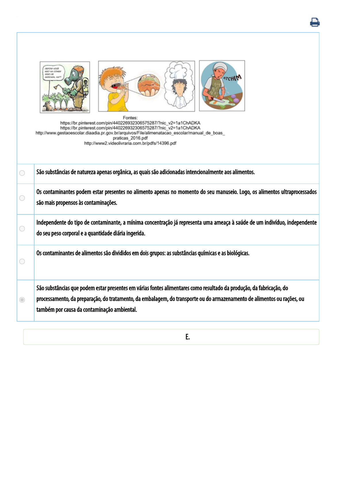 16/03/2021 Universidade Paulista - UNIP : Disciplina On-line. https://www.unip.br/aluno/central/sistemas/acesso/138 1/1 Observe as �guras a seguir e assinale a alternativa correta sobre os contaminantes em alimentos: A São substâncias de natureza apenas orgânica, as quais são adicionadas intencionalmente aos alimentos. B Os contaminantes podem estar presentes no alimento apenas no momento do seu manuseio. Logo, os alimentos ultraprocessados são mais propensos às contaminações. C Independente do tipo de contaminante, a mínima concentração já representa uma ameaça à saúde de um indivíduo, independente do seu peso corporal e a quantidade diária ingerida. D Os contaminantes de alimentos são divididos em dois grupos: as substâncias químicas e as biológicas. E São substâncias que podem estar presentes em várias fontes alimentares como resultado da produção, da fabricação, do processamento, da preparação, do tratamento, da embalagem, do transporte ou do armazenamento de alimentos ou rações, ou também por causa da contaminação ambiental. Você já respondeu e acertou esse exercício. A resposta correta é: E.