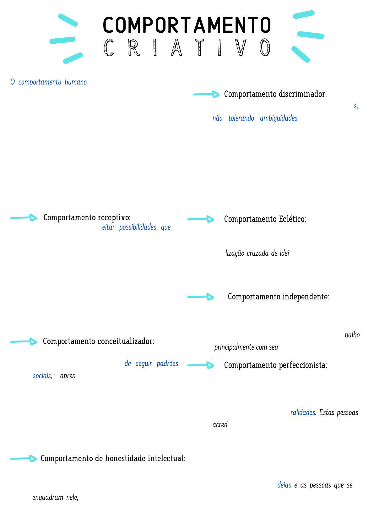 Comportamento C r i a t i v o O comportamento humano é complexo e multidimensional, resulta da inter-relação de variáveis internas e externas, sendo que nenhuma delas, isoladamente, determina a causa de uma conduta. É a designação genética da conduta do indivíduo. Nosso comportamento é modelado, em grande parte, por esses fatores e, em especial, pelas expectativas alheias. Nesse sentido, o comportamento criativo de uma pessoa também é fruto de sua personalidade, e portanto, de se esperar diferentes comportamentos em um grupo de trabalho, podendo-se destacar os seguintes (COMELLA, 1975): Comportamento receptivo: Significa perceber e aceitar possibilidades que a maioria das pessoas ignora ou rejeita prematuramente. Pode ser de natureza sensorial ou psicológica. No primeiro caso a pessoa se caracteriza por estar atento ao que acontece a sua volta enquanto que no segundo a característica é de pessoa de mente aberta e sem preconceitos à novas ideias. a curiosidade é inerente do comportamento receptivo. Comportamento discriminador: Pessoas criativas geralmente são discriminadoras, não tolerando ambiguidades e desordens. Este comportamento caracteriza-se por ser questionador, sendo que as pessoas não permitem que qualquer opinião seja tomada como verdadeira ou autoritariamente mascarada como racional. Pessoas criativas com este comportamento asseguram informações de alta qualidade para seus pensamentos. Comportamento conceitualizador: Caracterizado por pessoas com a mente muito bem organizada e despreocupadas de seguir padrões sociais; apresentam excepcional facilidade de entender, integrar e correlacionar ideias complexas. Pessoas com este comportamento conseguem ver algo extraordinário onde tudo parece comum e conseguem deduzir relações simples onde para outros tudo é complexo. Comportamento Eclético: Pessoas criativas invariavelmente têm interesse em um amplo campo interdisciplinar que possibilita uma fertilização cruzada de ideias de forma que a mente entende a similaridade dos problemas em vários campos de possíveis soluções. Comportamento independente: Caracterizado por pessoas criativas com forte independência em seus pensamentos, causando difícil relacionamento no ambiente de trabalho principalmente com seus superiores. Comportamento perfeccionista: Este comportamento é próprio daquelas pessoas criativas que consideram os assuntos em profundidade e com detalhamento, protegendo-se constantemente contra generalidades. Estas pessoas acreditam que o detalhe, mesmo sutil, faz a diferença. Comportamento de honestidade intelectual: Pessoas criativas com este comportamento caracterizam-se por defender seus pontos de vista até as últimas consequências. Este comportamento teimoso é inadequado para a geração de novas ideias e as pessoas que se enquadram nele, sabendo disso, usualmente se preservam de opinar, porém quando o fazem existe uma grande chance de ter-se uma boa ideia nova. Barreiras Criatividade da Há muitos fatores que sufocam ou reduzem a capacidade de criar de indivíduos, e este pode ser chamado de barreiras. São antecedentes, hábitos, ambientes, preconceitos que formam o bloqueio e que devem ser reconhecidos e dispersados. Todas as pessoas são diferentes umas das outras, portanto, as barreiras que cada uma possui também serão diferentes em modo e grau de intensidade dependendo do ambiente onde se encontra. Todas as pessoas tem capacidade para ser criativa, porém, o que diferencia entre elas é o grau de desenvolvimento do processo criativo. A maioria das barreiras podem ser classificadas como psicológicas, pois vem de dentro do indivíduo, como por exemplo pode-se citar (CSILLAG, 1983): Medo da crítica; Medo da apreensão; Medo de desaprovação; Medo de possíveis críticas; Medo de desapontamentos; Podem acautelar a pessoa de ter boas ideias; A fixação funcional, é um tipo de barreira que impede o indivíduo de visualizar outros usos para um produto, além de sua função principal; Dependência excessiva dos outros, o indivíduo impressiona em demasia pelo conhecimento e julgamento dos outros e falha em exercitar sua própria criatividade; Outros tipos de barreiras poderiam ser classificadas como “problemas de engenheiros”, ou seja, definição incorreta da necessidade dos clientes, a pessoa nunca chegará a um resultado esperados pelos clientes, mesmo que seja criativa, pois desde o início o problema já está formulado errado; Superespecialização, o único problema deste tipo de barreira, é que o indivíduo perde a visão ampla do sistema onde se integra, para um problema particular de sua área de conhecimento, chega-se rapidamente a uma solução; etc. Há barreiras que acontece por um dado período de tempo: estagnação por exemplo, pode acontecer quando as pessoas estão excessivamente cansadas e não conseguem produzir mais, é necessário uma relaxação para estimular a mente e proporcionar um período de incubação de novas ideias; Há barreiras que são inerentes da própria pessoa: são os hábitos, estes podem ser bons ou ruins dependendo do contexto onde se encontra. O homem pode tentar resolver problemas com soluções que eram boas no passado, mas que não são necessariamente as melhores nos tempos atuais. Existe muitos outros tipos de barreiras e todas devem ser identificadas e eliminadas. TÉCNICAS de Criatividade O desenvolvimento de características pessoais não é a única forma de maximizar a capacidade de criação. O desenvolvimento de características pessoais não é a única forma de maximizar a capacidade de criação. As pessoas de comportamento receptivo, por natureza têm afinidade para trabalho em grupo, sendo que no uso de técnicas de criatividade, somente as do tipo grupais possibilitará explorar seu maior potencial. O fato da aceitação de muitas ideias, amplia demasiadamente o horizonte de atuação, fazendo-se necessário o uso de técnicas de criatividade (de categoria