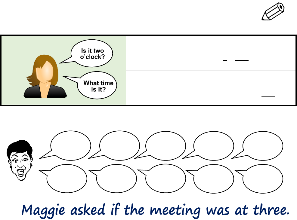 NAME: ________________________ DATE: ________________________ GRAMMAR WORKSHEET REPORTED SPEECH 2 Present Simple Questions Yes/No Qs direct reported Cathy asked, “Is it two o’clock?” Cathy asked if it was two o’clock. W/H Qs direct reported Cathy asked, “What time is it?” Cathy asked what time it was. Write the questions using reported speech. 1. ____________________________________________________________________ 2. ____________________________________________________________________ 3. ____________________________________________________________________ 4. ____________________________________________________________________ 5. ____________________________________________________________________ 6. ____________________________________________________________________ 7. ____________________________________________________________________ 8. ____________________________________________________________________ 9. ____________________________________________________________________ 10. ____________________________________________________________________ Permission granted to reproduce for classroom use. © www.allthingsgrammar.com 1. Is the meeting at three? 2. Are they here? 3. Who is she? 4. What’s his name? 5. Are you okay? 6. Can you drive? 7. Where is Tom? 8. Does Mary work? 9. Am I late? 10. Do they like Toronto? GRAMMAR WORKSHEET ALL Things Grammar Grammar Focus Reported Speech (change from present simple questions) Level Intermediate ANSWER KEY 1. Maggie asked (me) if the meeting was at three. 2. Maggie asked (me) if they were here / there. 3. Maggie asked (me) who she was. 4. Maggie asked (me) what his name was. 5. Maggie asked (me) if I was okay. 6. Maggie asked (me) if I could drive. 7. Maggie asked (me) where Tom was. 8. Maggie asked (me) where Mary worked. 9. Maggie asked (me) if she was late. 10. Maggie asked (me) if they liked Toronto. GRAMMAR NOTE It’s not always necessary to change the verb in reported speech. If the situation is still the same, you do not need to change the verb to past. For example: Maggie asked where Mary works. (The situation is still the same and Mary still works at the same place.) Permission granted to reproduce for classroom use. © www.allthingsgrammar.com