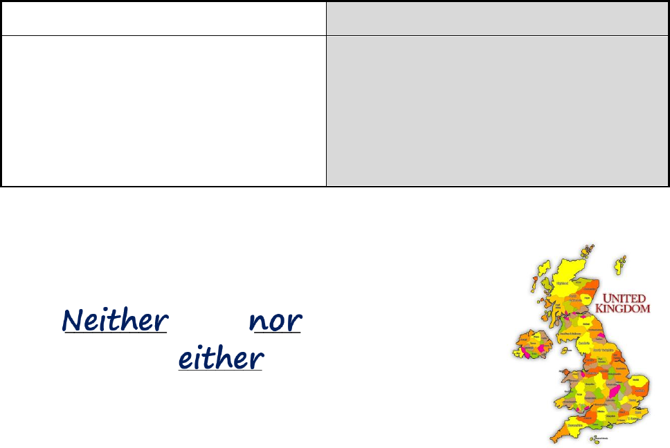 NAME: ________________________ DATE: ________________________ GRAMMAR WORKSHEET EITHER … (OR) / NEITHER … (NOR) Either … (or) Neither … (nor) Use either when you talk about two things or people. Examples: (1) “I would like either cookies or popcorn. I can’t decide.” (2) “I would like either (of the snacks).” (3) “I don’t want to eat either snack.” Use neither (for negative sentences) when you talk about two things or people. Examples: (1) “Jack has been to neither Canada nor the United States.” (2) “Jack has been to neither (of the countries).” (3) There is no negative for neither. NOTE: Either and neither can also come at the beginning of a sentence. Examples: Either we will go out, or we will stay at home. Neither of the restaurants is open today. Complete the sentences. Use: either, or, neither, nor 1. _______________ the UK _______ Spain are in Asia. 2. Let’s meet on _______________ Monday or Tuesday. 3. They weren’t at _______________ of the stores. 4. Neither Maria _______ Eduardo was at home. 5. _______________ of the answers is correct. Try again. 6. Either it will rain tomorrow, _______ it won’t rain. 7. The hat was _______________ too large, _______ too small. I was the right size. 8. _______________ of the movies were interesting. They were both boring. 9. _______________ of my classmates could come to the party. They were both sick. 10. I don’t like _______________ of those two coffee shops. 11. _______________ cats _______ dogs are allowed in the restaurant. 12. We can take a flight at _______________ one o’clock _______ three-thirty. 13. _______________ Vancouver nor Toronto is the capital city of Canada. 14. Either tomorrow _______ the day after tomorrow is a good day to meet. 15. I can’t find _______________ of my pencils. Permission granted to reproduce for classroom use. © www.allthingsgrammar.com GRAMMAR WORKSHEET ALL Things Grammar Grammar Focus Either … (or) / Neither … (nor) Level Intermediate (CEFR B1) ANSWER KEY My Notes 1. Neither / nor 2. either 3. either 4. nor 5. Neither 6. or 7. neither / nor 8. Neither 9. Neither 10. either 11. Neither / nor 12. either / or 13. Neither 14. or 15. either Grammar Note: (From the American Copy Editors Society) A tricky agreement problem: Neither-nor When two subjects are joined by neither-nor or either-or, choosing the right number for the verb can be tricky for writers. Focus your attention on the noun closest to the verb. If it is singular, as in the sentence above, choose the singular verb. If the noun is plural, choose the plural form of the verb. For more information: http://grammarguide.copydesk.org/2012/01/10/a-tricky-agreement-problem-neither-nor/ Permission granted to reproduce for classroom use. © www.allthingsgrammar.com http://grammarguide.copydesk.org/2012/01/10/a-tricky-agreement-problem-neither-nor/