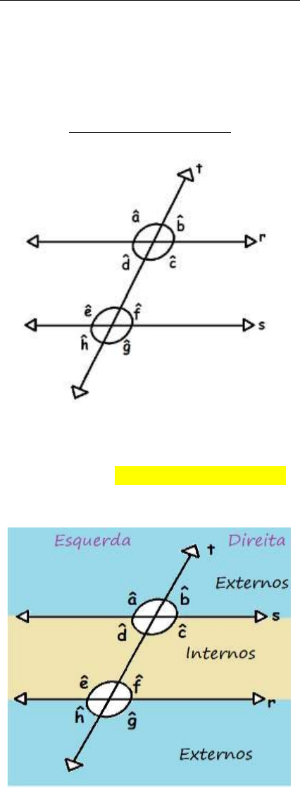 Neste material vamos revisar: • Retas paralelas cortadas por uma transversal; • Ângulos alternos, que podem ser internos e externos; • Ângulos colaterais, que podem ser internos e externos também; • Ângulos correspondentes. Retas paralelas cortadas por uma transversal Relembrando alguns conceitos: Retas paralelas são retas que não interceptam em nenhum ponto e é representada matemáticamente como r//s Veja o esquema abaixo: Note que a reta s é paralela a reta r e ambas estão sendo cortadas por uma transversal Quando isso acontece caro alunos, temos uma relação importante entre os ângulos que são formados e esses ângulos podem ser externos ou internos, veja o esquema logo a seguir: Todos os ângulos que estão entre as retas paralelas, eles são ângulos que ficam na parte interna e são chamados carinhosamente de ângulos internos, dessa forma, parecida, todos os ângulos que ficam fora das retas paralelas, são chamados de ângulos externos. Veja na figura que existe o lado esquerdo e direito da reta transversal, olhe isso com mais carinho e atenção, pois ajudará muito na hora de resolver as questões. Esses ângulos bacanas que foram formados são chamados: • Ângulos alternos, que podem ser internos e externos • Ângulos colaterais, que podem ser internos e externos também • Ângulos correspondentes. Vamos começar falando dos ângulos alternos: Ângulos alternos, são ângulos que estão em lados alternados, ou seja, um tem que estar à direita e o outro à esquerda e ainda, tem que ou estar na parte interna, ou na parte externa. Os que estão na parte interna se chamam, alternos internos e os que estão na parte de fora se chamam, alternos externos. Veja a ilustração abaixo: Ângulos alternos internos: Percebam que os ângulos de cor roxo escuro, um está do lado esquerdo da reta transversal e o outro está do lado direto e na parte interna, o mesmo acontece com os ângulos de cor rosa, portando, os ângulos d e f, e os ângulos c e ê são ângulos alternos internos. Ângulos alternos externos: Percebam que os ângulos de cor verde, um está do lado esquerdo da reta transversal e o outro está do lado direto e na parte externa, o mesmo acontece com os ângulos de cor laranja, portando, os ângulos â e g; e b e h, são ângulos alternos externos. Observação importante: os ângulos alternos internos ou externos, são iguais. Ângulos colaterais: são ângulos que estão do mesmo lado e podem ser internos ou externos, veja: Veja que os ângulos c e f são colaterais internos (angulos vermelhos) (estão do mesmo lado) Os ângulos d e ê também são colaterais internos (ângulos azuis) (estão do mesmo lado) Os ângulos b e g são colatareis externos (ângulos morrom claro) (estão do mesmo lado e exterior a reta paralela) Os ângulos â e h são colatareis externos (ângulos morrom escuro) (estão do mesmo lado e exterior a reta paralela) Lembrem-se, a soma dos ângulos colaterais internos ou externos, são iguais a 180º Ângulos correspondentes: são ângulos que estão na mesma posição: Veja o exemplo abaixo: Você percebe que o ângulo “2x” está acima da reta paralela e do lado direito da reta transversal? Você percebe também que o ângulo “3x – 20º” está acima de uma reta paralela e do lado direito da reta transversal. É isso mesmo, eles são correspondentes, ou seja, são iguais. Então se eu quiser achar os valores desses ângulos, basta eu fazer 2x = 3x – 20º que será x =20º Como eu só achei o valor de x, vou substituir em algum dos dois monômios. Para otimizar seu cálculo, substituía no mais fácil: → 2x → 2.20 = 40º Espero ter ajudado: Professora: Anne Borges Instagram: @anneborgesc