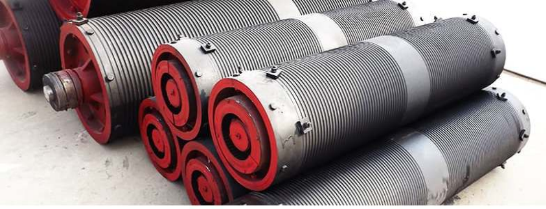 TAMBORES PARA CABLES DE ACERO Visión de conjunto El tambor para cables de una máquina de elevación de cargas es uno de los componentes más importantes del mecanismo. Su función es enrollar cables de acero del mecanismo de elevación y remolque y de esa forma, convierte el movimiento giratorio de la unidad de conducción en movimiento lineal del cable. El tambor (4) gira libremente sobre el eje (6) fijo y soportado por el bastidor también fijo (2), sobre las ranuras (5) talladas sobre la generatriz del tambor se enrolla el cable (10) de esta manera el movimiento giratorio de enrollamiento del cable se convierte en uno rectilíneo. Ventajas y características 1. - Gracias a una estructura simple, los ajustes del tambor en él montaje y la instalación con los otros mecanismos de la máquina de elevación son bastante prácticos. 2.- Cuando el tambor está en funcionamiento, los cables de acero se enrollan por sí mismos en las ranuras en espiral dispuestas alrededor de la circunferencia del tambor de cable. 3.- Garantiza un nivel adecuado de tensión que actúa de forma uniforme en los cables de acero. 4.- el tambor está construido para que tenga alta resistencia, peso ligero y gran rigidez. 5- . El tambor de gran diámetro con un ancho de tambor pequeño proporciona un ángulo de desviación seguro, lo que prolonga la vida útil del cable. TIPOS DE ENROLLAMIENTO. Podemos clasificar los tambores en dos grandes grupos de acuerdo a la forma de enrollar el cable sobre su generatriz De varias capas de cable El cable se enrolla en capas sucesivas sobrepuestas una sobre la otra, son generalmente tambores lisos. Solo se usan en cabrestantes en tambores para máquinas de obras públicas, en las cucharas mecánicas y en los tambores de almacenamiento que se encuentran detrás de las poleas de fricción, almacenando grandes longitudes de cables con tensión reducida. De una sola capa de cable Normalmente poseen ranuras sobre sobre su generatriz dispuestas en forma helicoidal permitiendo el enrollamiento del cable en una sola capa de, acuerdo a lo establecido por las normas alemanas y las normas UNE 528 para la seguridad de las máquinas de elevación. Instalación del cable Al transferir un cable de un carrete a otro o al tambor de una máquina o equipo, el cable debe pasar de la parte superior del carrete a la parte superior del otro, o de inferior a inferior tal como indica la figura. Deben evitarse las flexiones opuestas, que introduzcan esfuerzos adicionales al cable y hagan difícil su manejo. Los carretes deben estar sobre ejes paralelos y se debe siempre aplicar al cable cierta tensión al cable de manera de asegurar su correcto enrollado. La tensión reviste todavía mayor importancia en el caso de tambores lisos PARTES FUNDAMENTALES Generatriz (color rojo): sobre ella van construidas las espiras o rosca maquinada en forma helicoidal sobre las cuales se aloja o enrolla el cable. Cuando se tiene que envolver dos ramales de cable la generatriz consta de dos sectores construidos u no a derechas y otro a izquierdas a partir del centro de la generatriz. Eje (color lila): el eje es generalmente fijo girando el tambor libremente sobre él, esta pieza se asegura firmemente sobre un bastidor robusto (color amarillo). Entre el eje y la generatriz existen tres piezas, el cubo (color verde) que sirve de apoyo al tambor sobre el eje y las tapas o espejos (color azul) que conectan el cubo con la generatriz. Entre el cubo y el eje se montan cojinetes de rodadura o de fricción. Para el giro del tambor es necesario un engranaje de gran diámetro o corona (color café) con dientes exteriores, ella va montada sobre el tambor mediante elementos roscados (pernos y tuercas), ver detalle a que permiten un rápido reemplazo de alguna de las dos partes cuando sufre algún deterioro pudiendo reutilizarse la restante si no posee daños. Los tambores de cables deben estar provistos de dos pestañas en cada extremo de una altura una vez y media el diámetro del cable. Se puede suprimir esta pestaña (color naranja) a condición de evitar, por otros medios de que el cable caiga sobre los engranajes. DIMENSIONES El diámetro de arrollamiento de un tambor se calcula según la norma DIN 4130 según la formula y tabla que a continuación reproducimos En la formula tenemos: S: tracción máxima sobre un ramal del cable d: diámetro del cable D: diámetro primitivo del tambor o polea K y C : son coeficientes de la tabla siguiente Si llamamos L, la longitud del cable a enrollar, el número n de espiras necesarias se calcula mediante: Es necesario dejar preferentemente 2 a 3 espiras muertas, que refuerzan la fijación del cable y que impiden que se desenrolle por completo, aun en el caso de que el gancho alcance la posición más baja. Para la elección del paso y demás dimensiones de las gargantas se pueden elegir según la figura 2 y la tabla siguiente, o mediante el criterio h: espesor de la generatriz del tambor ( se toma el sector más desfavorable de la generatriz o el de menor alma metálica ESPERSOR DE LOS TAMBORES La solicitación del tambor se compone de. Una torsión Una flexión Una compresión causada por el apriete del cable Los esfuerzos de torsión son despreciables pues el tambor gira libre sobre su eje. Normalmente los esfuerzos de flexión son despreciables, excepto para los tambores de longitud excesiva. Resultan, por lo tanto, que el espesor de un tambor debe elegirse de acuerdo con la solicitación del arrollamiento (figura 3) El arrollamiento solicita al tambor a compresión y a flexión. El tipo de solicitación se pone en evidencia imaginando un tambor que soporta una única espira de cable (ver figura anterior). Bajo la influencia de la tracción del cable el tambor se comprime con la máxima deformación debido al arrollamiento A medida que nos alejamos de la espira, la deformación y consecuentemente el esfuerzo debido a la compresión, disminuye. El perfil del tambor deformado es el que pres