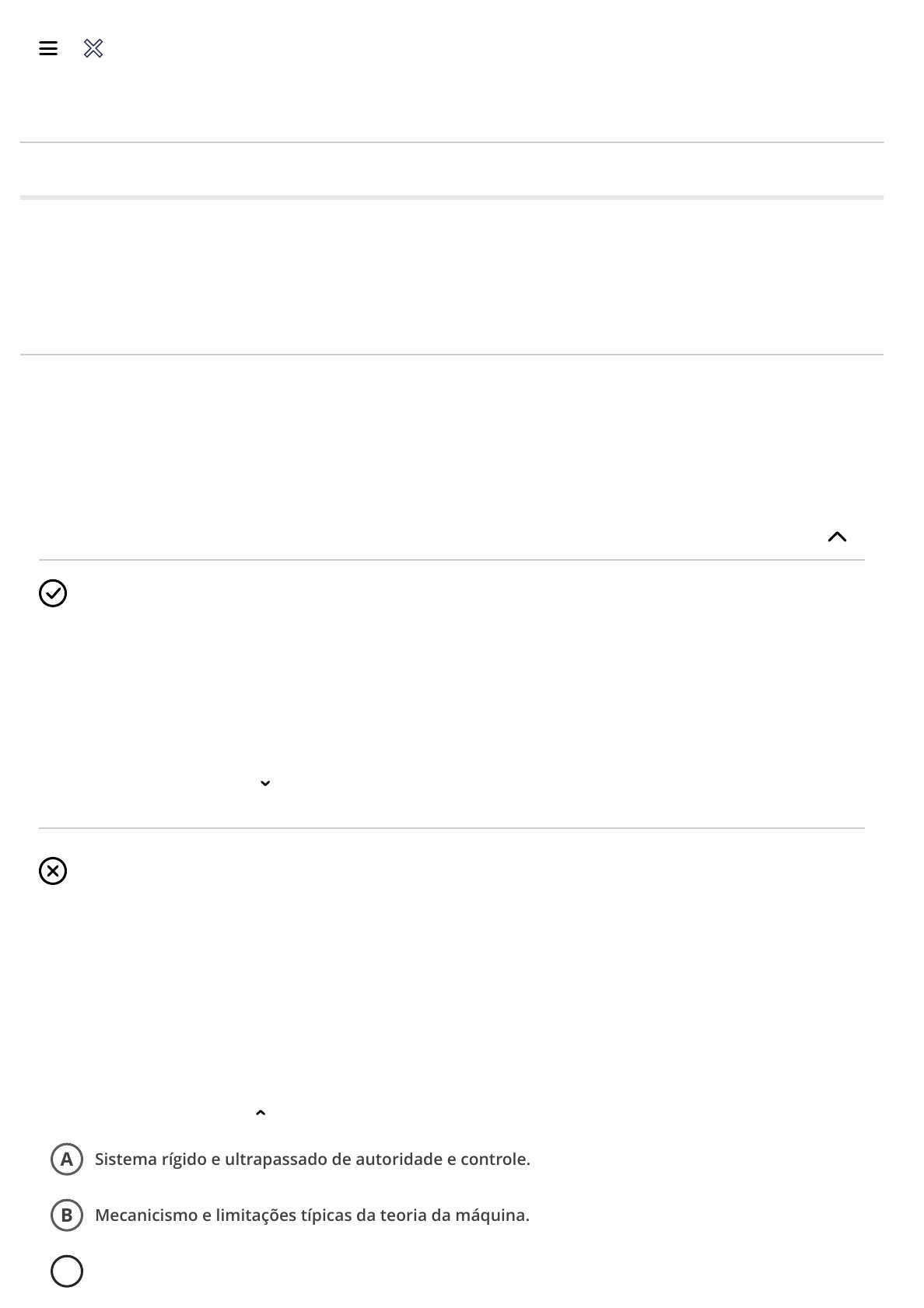 AV2 - 1A Assignment Content Mostrar opções de resposta Ocultar opções de resposta AV2 - 1A Alexandra Furtado Maria Pergunta 1 0,6 /0,6 Analise o trecho abaixo.“Leva em conta qualquer limitação sob a qual a organização precisa operar, por exemplo, com relação ao nível atual de tecnologia disponível. Em contrapartida, com o diagnóstico, o administrador também identifica as potencialidades da organização capazes de trazer soluções eficientes, como a disponibilidade de determinada mão de obra especializada.”Sobre o trecho, pode-se afirmar que: Pergunta 2 0 /0,6 A modernização da organização é uma tônica para que ela consiga se manter “viva” no mercado por mais tempo, ao longo dos anos. É seguindo essa linha que Max Weber inicia seu embate com as teorias Clássica e Científica e versa sobre a Burocracia. Contudo, apesar de ter trazido ares modernos às organizações, essa Teoria sofre também algumas críticas por não atender as diferentes relações que existem em uma organização. Pensando nas Críticas à Teoria da burocracia, aponte abaixo o que NÃO corresponde a uma crítica ao modelo burocrático de Weber. A Sistema rígido e ultrapassado de autoridade e controle. B Mecanicismo e limitações típicas da teoria da máquina. C Incorreta: Conservadorismo e falta de flexibilidade. Nota final Última tentativa com nota 3,6/6 3,6/6 Tentativa 1 Enviado: 29/03/21 15:45 (BRT) ××