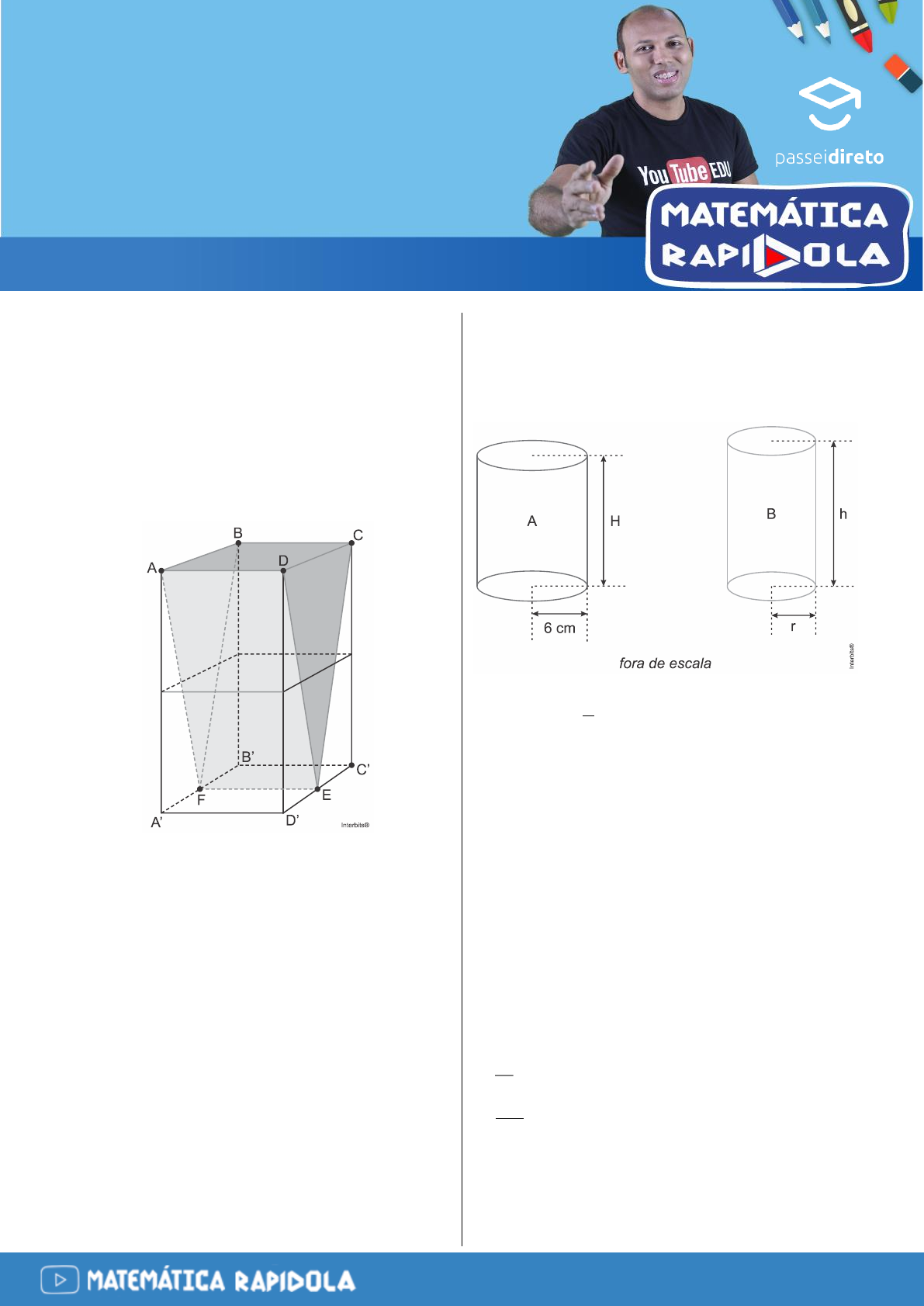 GEOMETRIA ESPACIAL 1. (Uerj) Dois cubos cujas arestas medem 2 cm são colados de modo a formar o paralelepípedo ’B’CABCDA ’D’. Esse paralelepípedo é seccionado pelos planos ADEF e BCEF, que passam pelos pontos médios F e E das arestas A ’B’ e C’D’, res- pectivamente. A parte desse paralelepípedo compreendida entre esses planos define o sólido ABCDEF, conforme in- dica a figura a seguir. O volume do sólido ABCDEF, em 3cm , é igual a: a) 4 b) 6 c) 8 d) 12 2. (Ufpr) A piscina usada nas competições de na- tação das Olimpíadas Rio 2016 possui as medidas oficiais recomendadas: 50 metros de extensão, 25 metros de largura e 3 metros de profundidade. Su- pondo que essa piscina tenha o formato de um pa- ralelepípedo retângulo, qual dos valores abaixo mais se aproxima da capacidade máxima de água que essa piscina pode conter? a) 37.500 litros. b) 375.000 litros. c) 3.750.000 litros. d) 37.500.000 litros. e) 375.000.000 litros. 3. (Famema) Um cilindro circular reto A, com raio da base igual a 6 cm e altura H, possui a mesma área lateral que um cilindro circular reto B, com raio da base r e altura h, conforme mostram as figuras. Sabendo que h 1,2 H = e que o volume do cilindro B é 3240 cm ,π é correto afirmar que a diferença entre os volumes dos cilindros é a) 350 cm .π b) 342 cm .π c) 345 cm .π d) 348 cm .π e) 337 cm .π 4. (Eear) Uma esfera está inscrita num cilindro equilátero cuja área lateral mede 216 cm .π O vo- lume da esfera inscrita é a) 8π b) 16π c) 32 3 π d) 256 3 π 5. (Ufrgs) Considere um cubo de aresta a. Os pon- tos I, J, K, L, M e N são os centros das faces ABCD, BCFG, DCGH, ADHE, ABFE e EFGH, respectiva- mente, conforme representado na figura abaixo. O octaedro regular, cujos vértices são os pontos I, J, K, L, M e N, tem aresta medindo a) a 3. b) a 2. c) a 3 . 2 d) a 5 . 2 e) a 2 . 2 6. (Enem) Um petroleiro possui reservatório em for- mato de um paralelepípedo retangular com as di- mensões dadas por 60 m 10 m de base e 10 m de altura. Com o objetivo de minimizar o impacto am- biental de um eventual vazamento, esse reservató- rio é subdividido em três compartimentos, A, B e C, de mesmo volume, por duas placas de aço retan- gulares com dimensões de 7 m de altura e 10 m de base, de modo que os compartimentos são interli- gados, conforme a figura. Assim, caso haja rompi- mento no casco do reservatório, apenas uma parte de sua carga vazará. Suponha que ocorra um desastre quando o petro- leiro se encontra com sua carga máxima: ele sofre um acidente que ocasiona um furo no fundo do compartimento C. Para fins de cálculo, considere desprezíveis as es- pessuras das placas divisórias. Após o fim do vazamento, o volume de petróleo derramado terá sido de a) 3 31,4 10 m b) 3 31,8 10 m c) 3 32,0 10 m d) 3 33,2 10 m e) 3 36,0 10 m 7. (Ufpr) Um prisma possui 17 faces, incluindo as faces laterais e as bases inferior e superior. Uma pirâmide cuja base é idêntica à base do prisma, possui quantas arestas? a) 26. b) 28. c) 30. d) 32. e) 34. 8. (G1 - ifpe) Uma folha retangular de papelão de 40 cm por 30 cm será utilizada para confeccionar uma caixa, sem tampa, em forma de paralelepí- pedo, de base retangular. Para isso, deve-se, a partir desta folha de papelão, retirar 4 quadrados de lado 5 cm, de cada um dos vértices e, em se- guida, dobrar os lados, conforme a figura abaixo: Determine, em litros, o volume dessa caixa. a) 3 litros b) 2 litros c) 1 litro d) 4 litros e) 5 litros 9. (Enem) Em regiões agrícolas, é comum a pre- sença de silos para armazenamento e secagem da produção de grãos, no formato de um cilindro reto, sobreposta por um cone, e dimensões indicadas na figura. O silo fica cheio e o transporte dos grãos é feito em caminhões de carga cuja capacidade é de 3 20 m . Uma região possui um silo cheio e apenas um caminhão para transportar os grãos para a usina de beneficiamento. Utilize 3 como aproximação para .π O número mínimo de viagens que o caminhão pre- cisará fazer para transportar todo o volume de grãos armazenados no silo é a) 6. b) 16. c) 17. d) 18. e) 21. 10. (Espcex (Aman)) Um recipiente cilíndrico, cujo raio da base tem medida R, contém água até uma certa altura. Uma esfera de aço é mergulhada nesse recipiente ficando totalmente submersa, sem haver transbordamento de água. Se a altura da água subiu 9 R, 16 então o raio da esfera mede a) 2 R 3 b) 3 R 4 c) 4 R 9 d) 1 R 3 e) 9 R 16 11. (Enem 2ª aplicação) A bocha é um esporte jo- gado em canchas, que são terrenos planos e nive- lados, limitados por tablados perimétricos de ma- deira. O objetivo desse esporte é lançar bochas, que são bolas feitas de um material sintético, de maneira a situá-las o mais perto possível do bolim, que é uma bola menor feita, preferencialmente, de aço, previamente lançada. A Figura 1 ilustra uma bocha e um bolim que foram jogados em uma cancha. Suponha que um jogador tenha lançado uma bocha, de raio 5 cm, que tenha ficado encostada no bolim, de raio 2 cm, conforme ilustra a Figura 2. Considere o ponto C como o centro da bocha, e o ponto O como o centro do bolim. Sabe-se que A e B são os pontos em que a bocha e o bolim, res- pectivamente, tocam o chão da cancha, e que a distância entre A e B é igual a d. Nessas condições, qual a razão entre d e o raio do bolim? a) 1 b) 2 10 5 c) 10 2 d) 2 e) 10 12. (Uern) A peça geométrica, desenvolvida atra- vés de um software de modelagem em três dimen- sões por um estudante do curso de engenharia e estagiário de uma grande indústria, é formada a partir de dois prismas de base hexagonal regular e assemelha-se ao formato de uma porca de para- fuso. Considerando que o lado do hexágono maior mede 8 cm; que o comprimento do prisma é igual a 35 cm; e, que o lado do hexágono menor mede 6 cm, então o volume da peça, de forma que se possa calcular, posteriormente, a quantidade de matéria-prima ne- cessária à sua produção em massa em 