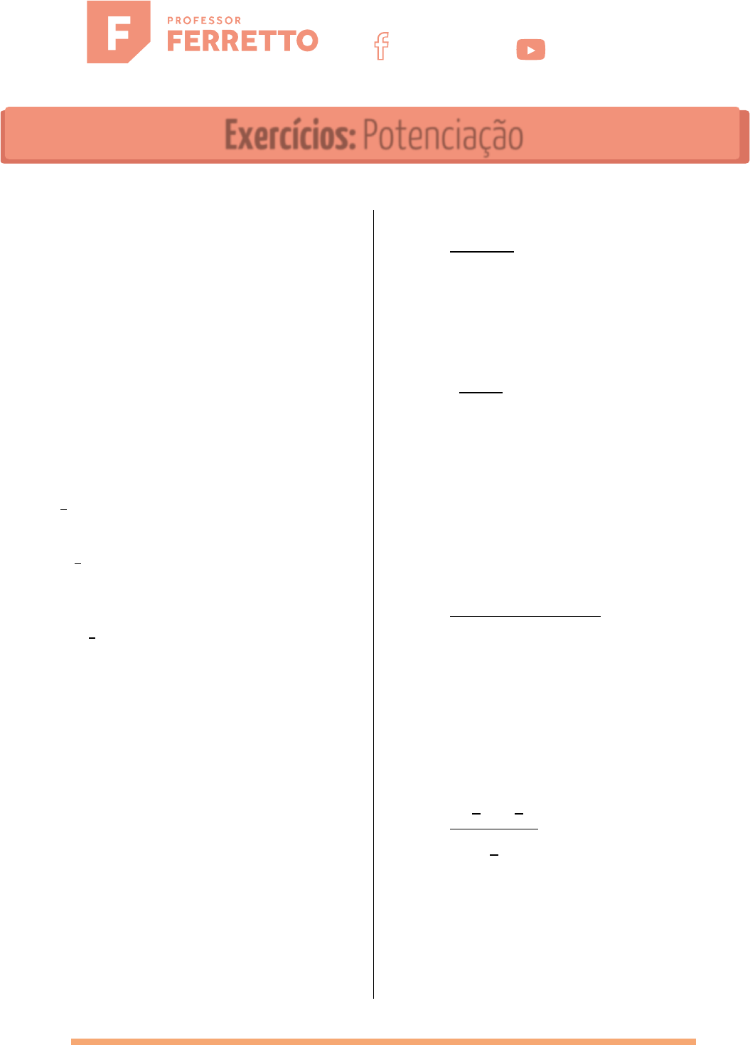 1 Calcule: 1. (−3)2 = 2. −32 = 3. −23 = 4. −(−2)3 = 5. ( 2 3 ) 3 = 6. (− 1 3 ) 4 = 7. −(− 3 2 ) 3 = 8. (−1)10 = 9. (−1)13 = Simplifique as expressões, supondo 𝒂 ⋅ 𝒃 ≠ 𝟎. 10. (𝑎2 ⋅ 𝑏3)2 ⋅ (𝑎3 ⋅ 𝑏2)3 = 11. (𝑎4 ⋅ 𝑏2)3 (𝑎 ⋅ 𝑏2)2 = 12. ( 𝑎4 ⋅ 𝑏3 𝑎2 ⋅ 𝑏 ) 5 = Calcule o valor das expressões: 13. 2−1 − (−2)2 + (−2)−1 22 + 2−2 = 14. (− 1 2) 2 ⋅ ( 1 2) 3 [(− 1 2) 2 ] 3 = Exercícios: Potenciação www.professorferretto.com.br ProfessorFerretto ProfessorFerretto http://www.professorferretto.com.br 2 Calcule: 15. (0,25)−3 = 16. 1 (0,2)−2 = 17. 1 (0,01)−2 = Se 𝒂 ⋅ 𝒃 ≠ 𝟎, simplifique as expressões: 18. (𝑎−2 ⋅ 𝑏3)−2 ⋅ (𝑎3 ⋅ 𝑏−2)3 = 19. ( 𝑎3 ⋅ 𝑏−4 𝑎−2 ⋅ 𝑏2 ) 3 = 20. (𝑎3 ⋅ 𝑏−2)−2 ⋅ (𝑎 ⋅ 𝑏−2)3 (𝑎−1 ⋅ 𝑏2)−3 = Se n ∈ ℤ e a ∈ ℝ∗, simplifique as expressões: 21. 𝑎2𝑛+1 ⋅ 𝑎1−𝑛 ⋅ 𝑎3−𝑛 = 22. 𝑎2𝑛+3 ⋅ 𝑎𝑛−1 𝑎2(𝑛−1) = 23. 𝑎2(𝑛+1)⋅𝑎3−𝑛 𝑎1−𝑛 = GABARITO: 1. 9 2. -9 3. -8 4. 8 5. 8/27 6. 1/81 7. 27/8 8. 1 9. -1 10. 𝑎13 ⋅ 𝑏12 11. 𝑎10 ⋅ 𝑏2 12. 𝑎10 ⋅ 𝑏10 13. -16/17 14. 2 15. 64 16. 1/25 17. 0,0001 18. 𝑎13 ⋅ 𝑏−12 19. 𝑎15 ⋅ 𝑏−18 20. 𝑎−6𝑏4 21. 𝑎5 22. 𝑎𝑛+4 23. 𝑎2𝑛+4