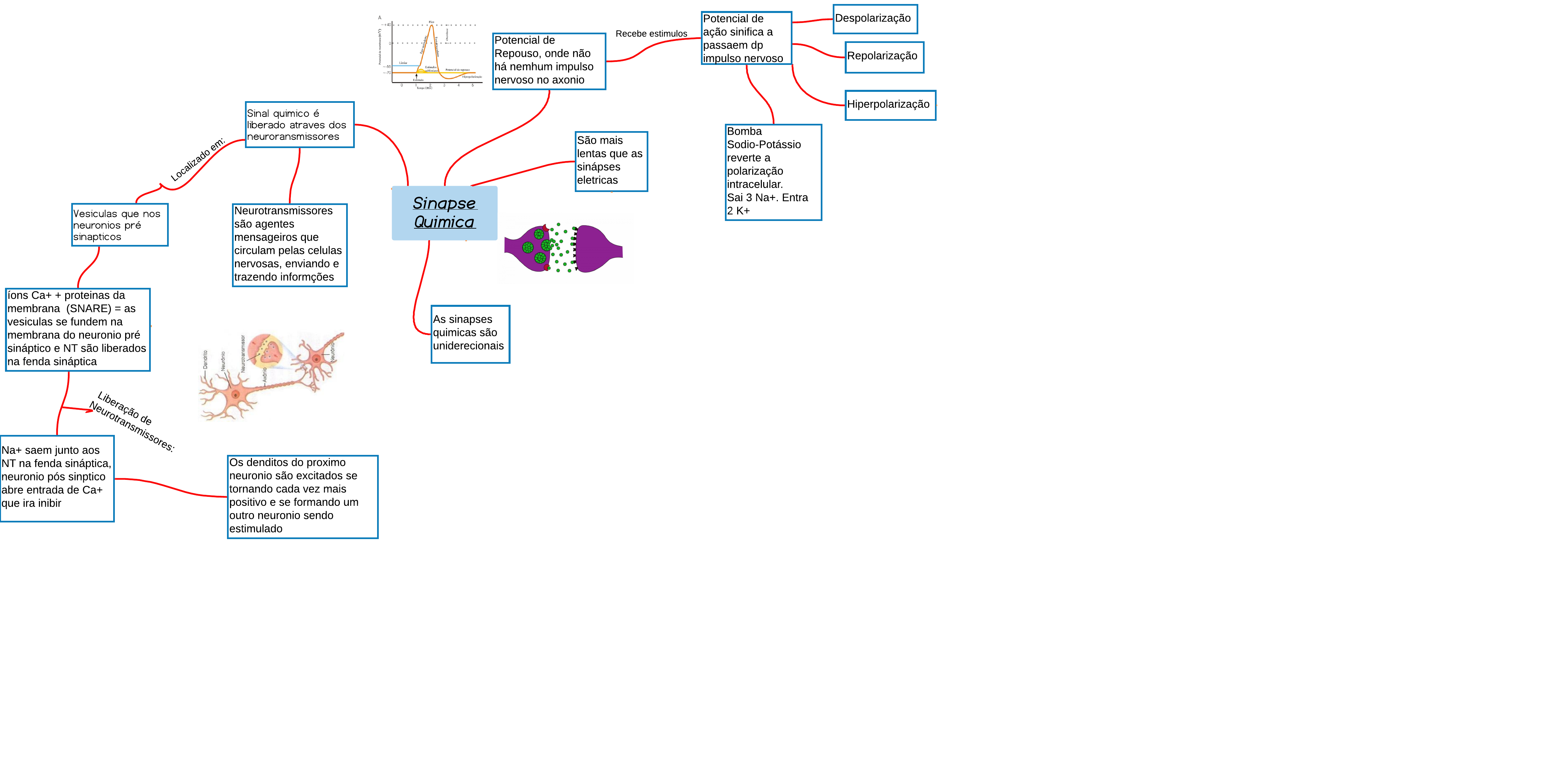 Liberação de Neurotransmissores: Lo ca liz ad o e m: Sinapse Quimica Sinal quimico é liberado atraves dos neuroransmissores Vesiculas que nos neuronios pré sinapticos Neurotransmissores são agentes mensageiros que circulam pelas celulas nervosas, enviando e trazendo informções íons Ca+ + proteinas da membrana (SNARE) = as vesiculas se fundem na membrana do neuronio pré sináptico e NT são liberados na fenda sináptica Na+ saem junto aos NT na fenda sináptica, neuronio pós sinptico abre entrada de Ca+ que ira inibir As sinapses quimicas são uniderecionais São mais lentas que as sinápses eletricas Potencial de Repouso, onde não há nemhum impulso nervoso no axonio Os denditos do proximo neuronio são excitados se tornando cada vez mais positivo e se formando um outro neuronio sendo estimulado Potencial de ação sinifica a passaem dp impulso nervoso Recebe estimulos Despolarização Repolarização Hiperpolarização Bomba Sodio-Potássio reverte a polarização intracelular. Sai 3 Na+. Entra 2 K+ MAPA MENTAL SINAPSE QUIMICA Mind map with lines