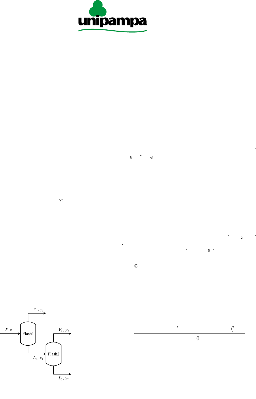 Curso de Engenharia Qúımica Operações Unitárias II – 2016/2 Prof. Rodolfo Rodrigues Lista 1: Destilação Flash Exerćıcio 1* (McCabe, Smith & Harriot, 1993, Exemplo 18.1) Uma mistura equimolar de benzeno e tolueno é sujeita a destilação flash em um separador a 1 atm de pressão. A curva de equiĺıbrio vapor-ĺıquido e o diagrama de ponto de bolha são mostrados na Fig. 1. Determine as seguintes quantidades para f , fração de vaporização, igual à 0, 0,2, 0,4, 0,6, 0,8 e 1: a) A temperatura no separador. b) A composição do ĺıquido que deixa o separador. c) A composição do vapor que deixa o separador. Respostas: (a) 92,2, 93,7, 95, 96,5, 97,7 e 99 °C. (b) 0,5, 0,455, 0,41, 0,365, 0,325 e [0,29]. (c) [0,71], 0,67, 0,63, 0,585, 0,54 e 0,5. Exerćıcio 2 (Prova 2, 2012/2) Uma mistura contendo 70 mol% de benzeno e 30 mol% de tolueno a temperatura ambiente, na qual os compo- nentes são misćıveis em qualquer proporção, é alimen- tada em uma sequência de 2 vasos flash ligados em série. A sáıda da corrente da fase ĺıquida do primeiro vaso flash é alimentada no segundo como indicado na figura abaixo. O processo é conduzindo a uma pressão constante de 1 atm. Os dados de equiĺıbrio L-V estão dispońıveis na Fig. 2. Calcule o que se pede para cada um dos cenários des- critos abaixo: I. Considere ambos os vasos flash com uma fração va- porizada de 50%. a) Quais são as composições de benzeno das cor- rentes de vapor que deixam os 2 vasos? b) Quais são as temperaturas de operação dos 2 vasos? c) Comparando as composições do benzeno nas correntes de ĺıquido e de vapor dos vasos qual é a corrente que está ficando mais rica em ben- zeno: ĺıquida ou vapor? Justifique. II. Considere os vasos flash com temperaturas de 90°C e 95°C respectivamente. a) Quais são as frações vaporizadas nos 2 vasos? b) Quais são as composições de benzeno das cor- rentes de vapor que deixam os 2 vasos? III. Considere o primeiro e o segundo vasos flash com 60 mol% e 50 mol% de benzeno na corrente de ĺıquido respectivamente. a) Quais são as frações vaporizadas nos 2 vasos? b) Quais são as temperaturas de operação dos 2 vasos? Respostas: I. (a) y1 = 0,79 e y2 = 0,71. (b) T1 = 89°C e T2 = 92°C. II. (a) f1 = 0,67 e f2 = 0,77. (b) y1 = 0,76 e y2 = 0,62. III. (a) f1 = 0,506 e f2 = 0,476. (b) T1 = 89,5°C e T2 = 92°C. Exerćıcio 3 (Wankat, 2012, Problema D1) Deseja-se separar uma mistura de metanol e água em um vaso flash a 1 atm de pressão. Os dados de equiĺıbrio são mostrados na Tab. 1. Tabela 1: Dados de equiĺıbrio vapor-ĺıquido para metanol(A)– água(B) (p = 1 atm). xA yA T (°C) xA yA T (°C) 0 0 100 40 72,9 75,3 2 13,4 96,4 50 77,9 73,1 4 23 93,5 60 82,5 71,2 6 30,4 91,2 70 87 69,3 8 36,5 89,3 80 91,5 67,6 10 41,8 87,7 90 95,8 66 15 51,7 84,4 95 97,9 65 20 57,9 81,7 100 100 64,5 30 66,5 78 a) A alimentação é 60 mol% de metanol, e 40% da cor- rente alimentada é vaporizada. Quais são as frações molares do vapor e do ĺıquido e a respectivas vazões? Assuma uma alimentação de 100 kmol/h. 1 b) Repita (a) para uma alimentação de 1 500 kmol/h. c) Se a alimentação é de 30 mol% de metanol e deseja-se chegar a um produto ĺıquido com 20 mol% de meta- nol, qual deve ser a relação V/F usada? Para uma alimentação de 1 000 lbmol/h, encontre as vazões e composições dos produtos. d) O vaso é operado de forma a obter um produto ĺıquido com 45 mol% de metanol. L = 1 500 kmol/h e V/F = 0,2. Quais são a composição e a vazão da carga alimentada? e) Se z = 0,4 e T = 77°C, encontre V/F , xA e yA. f) Se F = 50 mol/h, z = 0,8 e yA = 0,892, encontre V , L e xA. Utilize a Fig. 3 para graficar os dados experimentais e resolver o exerćıcio. Respostas: (a) y = 0,77 e x = 0,48. (b) V = 600 e L = 900. (c) V/F = 0,264 e y = 0,579. (d) F = 1875 kmol/h. (e) V/F = 0,17. (f) x = 0,756, V = 16,18 mol/h e L = 33,82 mol/h. Exerćıcio 4 (Wankat, 2012, Exemplo 2-1) Um vaso de destilação flash opera a pressão de 101,3 kPa é usado para separar uma mistura etanol-água. A mistura alimentada é de 40 mol% de etanol e F = 100 kmol/h. Os dados de equiĺıbrio vapor-ĺıquido são dados na Fig. 4. Determine: a) Quais são a composição máxima de etanol na fase va- por e a composição mı́nima de etanol na fase ĺıquida assumindo que V/F é permitido variar livremente? b) Se V/F = 2/3, quais são as composições das fases ĺıquida e vapor? c) Repita (b) dado que F é especificado como 1 000 kmol/h. Respostas: (a) ymáx = 0,61 e xmin = 0,075. (b) y = 0,52 e x = 0,17. (c) a mesma. Exerćıcio 5 (Wankat, 2012, Problema D2) Dois vasos flash são conectados como mostrado na figura abaixo. Ambos estão a 1 atm de pressão. A alimentação do primeiro vaso é uma mistura binária de metanol e água com 55 mol% de metanol. A vazão alimentada é de 10 000 kmol/h. O segundo vaso opera com V2/F2 = 0,7 e a composição do produto ĺıquido é de 25 mol% de metanol. Os dados de equiĺıbrio são mostrados na Tab. 1. a) Qual é a fração vaporizada no primeiro vaso? b) Quais são os valores de y1, y2, x1, T1 e T2? Utilize a Fig. 3 para graficar os dados experimentais e resolver o exerćıcio. Respostas: (a) 14,8%. (b) x1 = 0,51, y1 = 0,78, x2 = 0,25 e y2 = 0,62. Formulário F, z L, x V, y Flash � Linha de operação: y = ( f − 1 f ) x + z f (1) onde f = V/F , é a fração vaporizada. 2 Te m pe ra tu ra (° C ) 80 85 90 95 100 105 110 xA, yA (Benzeno) 0 0,1 0,2 0,3 0,4 0,5 0,6 0,7 0,8 0,9 1 (a) Diagrama T-x-y a pressão constante. y A (B en ze no ) 0 0,1 0,2 0,3 0,4 0,5 0,6 0,7 0,8 0,9 1 xA (Benzeno) 0 0,1 0,2 0,3 0,4 0,5 0,6 0,7 0,8 0,9 1 (b) Diagrama x-y a pressão constante. Figura 1: Mistura binária benzeno(A)–tolueno(B) a 1 atm. 3 Te m pe ra tu ra (° C ) 80 85 90 95 100 105 110 xA, yA (Benzeno) 0 0,1 0,2 0,3 0,4 0,5 0,6 0,7 0,8 0,9 1 (a) Diagrama T-x-y a pressão constante. y A (B en ze no ) 0 0,1 0,2 0,3 0,4 0,5 0,6 0,7 0,8 0,9 1 xA (Benzeno) 0 0