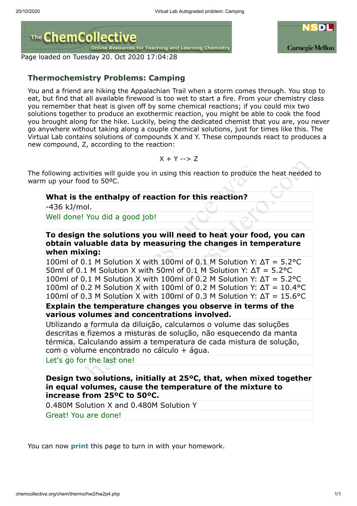 20/10/2020 Virtual Lab Autograded problem: Camping chemcollective.org/chem/thermo/hw2/hw2p4.php 1/1 Page loaded on Tuesday 20. Oct 2020 17:04:28 Thermochemistry Problems: Camping You and a friend are hiking the Appalachian Trail when a storm comes through. You stop to eat, but find that all available firewood is too wet to start a fire. From your chemistry class you remember that heat is given off by some chemical reactions; if you could mix two solutions together to produce an exothermic reaction, you might be able to cook the food you brought along for the hike. Luckily, being the dedicated chemist that you are, you never go anywhere without taking along a couple chemical solutions, just for times like this. The Virtual Lab contains solutions of compounds X and Y. These compounds react to produces a new compound, Z, according to the reaction: X + Y --> Z The following activities will guide you in using this reaction to produce the heat needed to warm up your food to 50ºC. What is the enthalpy of reaction for this reaction? -436 kJ/mol. Well done! You did a good job! To design the solutions you will need to heat your food, you can obtain valuable data by measuring the changes in temperature when mixing: 100ml of 0.1 M Solution X with 100ml of 0.1 M Solution Y: ΔT = 5.2°C 50ml of 0.1 M Solution X with 50ml of 0.1 M Solution Y: ΔT = 5.2°C 100ml of 0.1 M Solution X with 100ml of 0.2 M Solution Y: ΔT = 5.2°C 100ml of 0.2 M Solution X with 100ml of 0.2 M Solution Y: ΔT = 10.4°C 100ml of 0.3 M Solution X with 100ml of 0.3 M Solution Y: ΔT = 15.6°C Explain the temperature changes you observe in terms of the various volumes and concentrations involved. Utilizando a formula da diluição, calculamos o volume das soluções descritas e fizemos a misturas de solução, não esquecendo da manta térmica. Calculando assim a temperatura de cada mistura de solução, com o volume encontrado no cálculo + água. Let's go for the last one! Design two solutions, initially at 25ºC, that, when mixed together in equal volumes, cause the temperature of the mixture to increase from 25ºC to 50ºC. 0.480M Solution X and 0.480M Solution Y Great! You are done! You can now print this page to turn in with your homework. https://www.coursehero.com/file/73508603/Campingpdf/ Th is stu dy re so ur ce w as sh are d v ia Co ur se He ro .co m Powered by TCPDF (www.tcpdf.org) https://www.coursehero.com/file/73508603/Campingpdf/ http://www.tcpdf.org