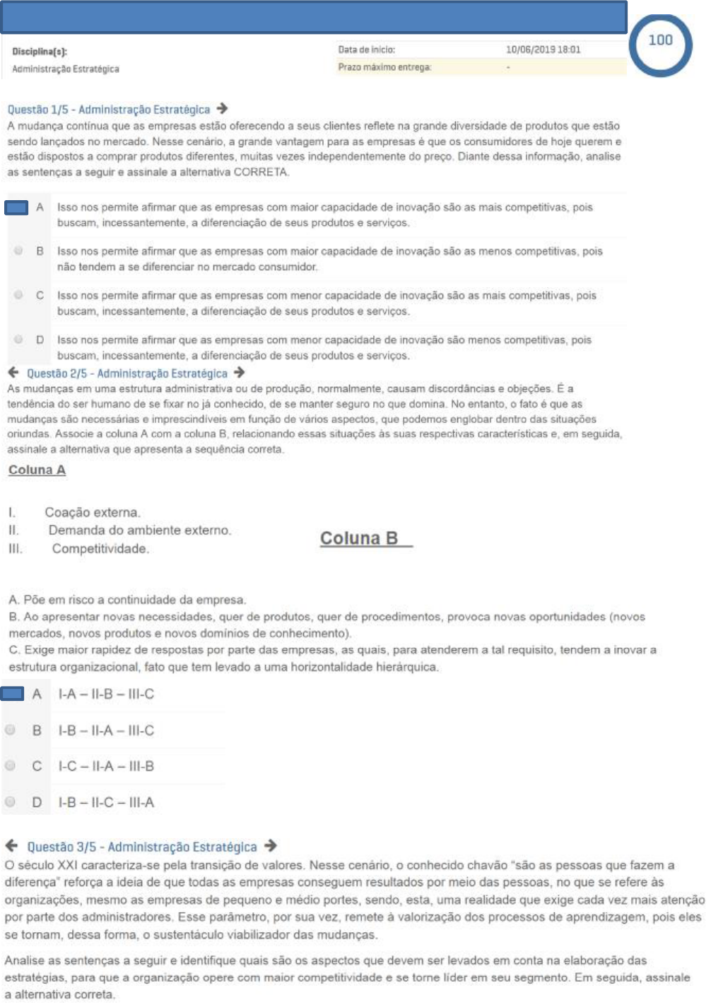 ADMINISTRAÇÃO ESTRATÉGICA Questões 1 com 3 tentativas