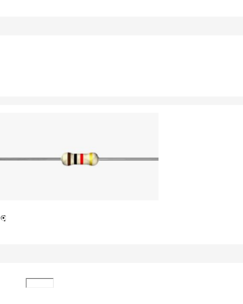 1ª Avaliação 0220 Pergunta 1 3 / 3 pts Um capacitor pode armazenar energia sob a forma de campo elétrico Responder 1: Correto! elétrico Pergunta 2 0 / 2 pts O valor do resistor mostrado na figura abaixo é de Resposta correta 1 kΩ Pergunta 3 4 / 4 pts O valor da resistência medida pelo ohmímetro no circuito abaixo é igual a kΩ Resposta correta 4,0 Resposta correta 4.0 Pergunta 4 0 / 4 pts Uma bateria de 3 V fornece 100 mA a uma lanterna. Quanta energia, em J, a bateria fornecerá em 5 horas? Respostas corretas 5400 5400 J 5.400 5.400 J Pergunta 5 0 / 3 pts O valor da resistência, em Ω, de um resistor que apresenta uma queda de tensão de 50 V e no qual é dissipada uma potência de 250 W é igual a Ω Resposta correta 10 Pergunta 6 0 / 3 pts Os instrumentos 3 e 5 indicados abaixo, são respectivamente. Resposta correta voltímetro e voltímetro Você responde Pergunta 7 4 / 4 pts O valor da capacitância equivalente vista dos pontos A e B é igual a Correto! C Pergunta 8 0 / 3 pts O ferro de solda abaixo está ligado em uma tensão de 120 V e consome 200 mA. O valor da sua resistência é igual a Ω Resposta correta 600 Pergunta 9 0 / 4 pts No circuito abaixo, calcular a corrente e a potência dissipada em R2. Considerar: V1= 100 V R1 = 120 Ω; R2 = 300 Ω e R3 = 80 Ω Corrente mA e Potência em R2 W Resposta correta 200 Resposta correta 12 10 600 12 200 4