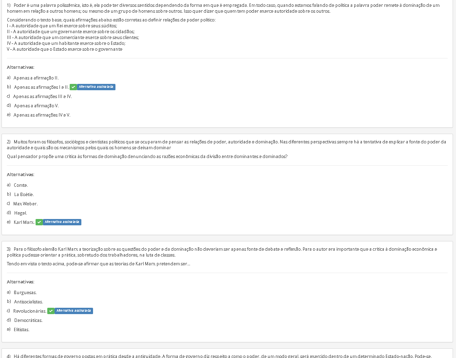 Poder é uma palavra polissêmica, isto ela pode ter diversos sentidos dependendo da forma empregada. Em todo caso, quando estamos falando de politica a palavra poder remete à de um relação a outros homens; ou mesmo de um grupo de homens sobre outros. Isso quer dizer que poder exerce autoridade sobre os outros. Considerando o texto base, quais afirmacoes abaixo estão corretas ao definir relações de poder político: I-A autoridade que um Rei exerce sobre seus súditos; II-A autoridade que um governante exerce sobre os cidadãos; III-A autoridade que um comerciante exerce sobre seus clientes; IV-A autoridade que um habitante exerce sobre o Estado; V-A autoridade que o Estado exerce sobre o governante a) a afirmação II. b) Apenas as afirmações I e II. c) Apenas as afirmações III e IV. d) a e) Apenas as afirmações IV e V.