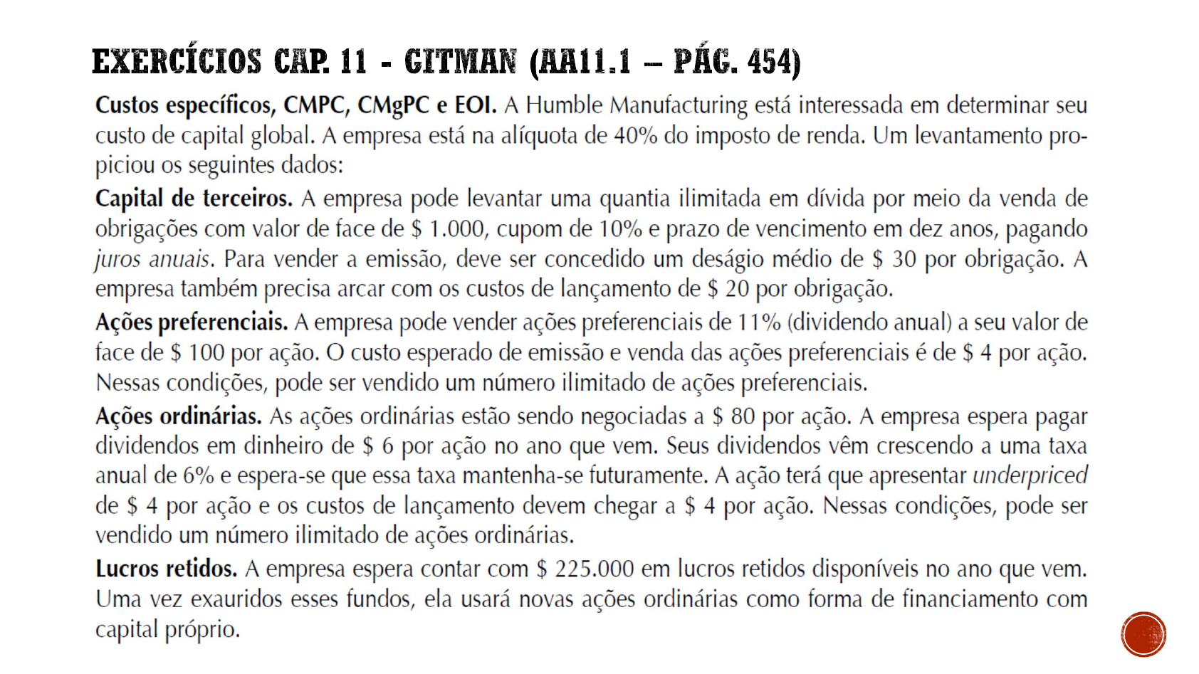 Na HP 12C 950 CHS PV 1.000 FV 10 n 100PMT i = 10,84% a.a. Na HP 12C 950 CHS PV 1.000 FV 10 n 100PMT i = 10,84% a.a. CUSTO % ri 6,5% rp 11,5% rs 13,5% rn 14,3% EXERCÍCIOS CAP. 11 - GITMAN (AA11.1 – PÁG. 454) EXERCÍCIOS CAP. 11 - GITMAN (AA11.1 – PÁG. 454) EXERCÍCIOS CAP. 11 - GITMAN (AA11.1 – PÁG. 454) EXERCÍCIOS CAP. 11 - GITMAN (AA11.1 – PÁG. 454) EXERCÍCIOS CAP. 11 - GITMAN (AA11.1 – PÁG. 454) EXERCÍCIOS CAP. 11 - GITMAN (AA11.1 – PÁG. 454) EXERCÍCIOS CAP. 11 - GITMAN (PÁG. 455) EXERCÍCIOS CAP. 11 - GITMAN (PÁG. 455) EXERCÍCIOS CAP. 11 - GITMAN (PÁG. 455) EXERCÍCIOS CAP. 11 - GITMAN (PÁG. 455) EXERCÍCIOS CAP. 11 - GITMAN (PÁG. 455) EXERCÍCIOS CAP. 11 - GITMAN (PÁG. 458)