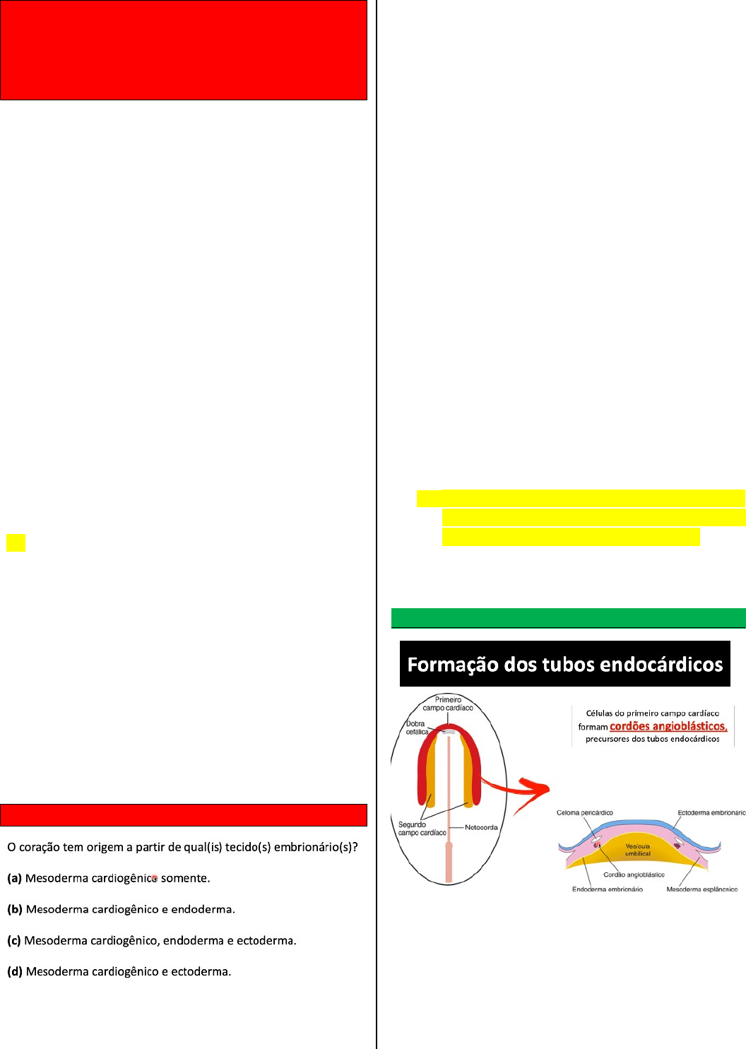Desenvolvimento do coração · O sistema cardiovascular surge na metade de 3 semana de desenvolvimento · Coração é o primeiro órgão que começa a funcionar no individuo 1° órgão funcionalmente ativo · Com 21 dias já há bat cardíacos · 24-25 há bombeamento de sangue · Isso porque ele supre as necessidades embrionárias nutricionais e de oxigênio que vão aumentando com o crescimento do embrião · Batimento é fundamental para a morfogênese · Ao longo do processo de desenvolvimento a morfologia do coração é alterada. A contração do batimento cardíaco auxilia no remodelamento dele A1 · Sangue oxigenado vem da placenta, entra no coração e é distribuído pelo corpo · Ele entra pela porção caudal e sangue sai pela porção cranial do coração por vasos que o distribuem · Há veias e aa no saco vitelínico que se comunicam com vasos do corpo do embrião · Saco vitelino primeiro local onde ocorre a hematopoiese LINHAGEM CARDÍACA · Desenvolvimento da mesoderma cardiogênica durante a gastrulação · Resposta: D · PRIMEIRO CAMPO CARDÍACO (primeiras células que se diferenciam) · Células do mesoderma cardiogênico migram pela linha primitiva e se posicionam em local especifico durante a gastrulação formam o primeiro campo cardíaco · “crescente cardíaco” devido ao formato de meia lua. · Posteriormente, outros tipos celulares formam o 2° campo cardíaco · As células progenitoras cardíacas mesodérmicas oriundas da região da faringe formam o 2° campo · 1°campo forma a maior parte do coração (átrios e ventrículo esquerdo) · 2° campo: VD e tronco · Coração tem origem embriológica mesodérmica (1/2 campos cardíacos) e ectodérmica (células da crista neural) · Crista neural ventrículo e trato de saída FORMAÇÃO DOS TUBOS ENDOCÁRDICOS Células do 1 campo formam cordões angioblásticos, precursores dos tubos endocárdicos do lado direito e esquerdo, numa região bem cefálica do embrião. · Cordão angio é inicialmente maciço. As células centrais sofrem apoptose e as outras se organizam formando um tubo oco · Células dos cordões angioblasticos formam um par de tubos endocárdicos laterais bilaterais · Como se ocoração se formasse em cima da nossa cabeça e depois ele se movimenta para atingir a posição adequada · Isso ocorre devido aos dobramentos corporais. A formação da prega cefálica é importante pois o movimento dela leva o tubo para a região torácica · Não deve haver perda do dobramento, se não ele não é posicionado corretamente na caixa torácica · Com as pregas laterais, os 2 tubos se aproximam e se fundem em um tubo único formando o TUBO CARDÍACO ÚNICO por volta da 4 semana do desenvolvimento · O mesocardio dorsal liga o???? · O celoma forma a cavidade pericárdica e permite a mobilidade e crescimento do coração · Por forma do tubo há uma camada de miocárdio · Entre o endocardio e mio há a geleia cardíaca (acelular, é uma MEC secretada pelo miocárdio) · Endocárdio revestimento endotelial interno do coração · Miocárdio parede muscular do coração · Geleia cardíaca MEC · Epicardio (pericárdio visceral) fonte mesodérmica independente · Substancias que interferem na formação do tubo único · Etanol Componentes derivados do tubo endocárdio a. Seio venoso b. Ventrículo primitivo forma ventrículo esquerdo c. Bulbo cardíaco forma VD d. Saco aórtico e. Trato de saída f. Átrio primitivo · Cada uma das estruturas do tubo cardíaco único forma uma parte do coração · Todas as camaras estão alinhadas nesse momento em fluxo retilíneo · Logo ao longo do desenvolvimento essas camaras devem ser reposicionadas · Cabeça do embrião está próxima do trato de saída · Veias cardinais fusão das veias cardinais posteriores e anteriores que formam a comum que drenam para o seio venoso (da região cefálica e caudal) · Seio venoso forma parte do átrio e seio coronário · Cone arteiral principalmente no VD · Se o coração estiver preso na parede no mesocardio dorsal ele não consegue se organizar · Por isso o mesocardio dorsal sobfre apoptose e deixa de existir na região central · Deixando o coração preso na parede do embrião na extremidade cefálica, caudal e não no meio · Há formação de um orifício seio transverso do pericárdio formado nesse processo de apoptose · Até o final da 7-8 há septação · A partir do 2 mês de gestação o coração está pronto Alteração morfológica a. Dobramento b. Realinhamento c. Remodelação d. Septação A parte de cima quer ir pra baixo e a parte de baixo quer ir pra cima. Região do bulbo é deslocada · Caudalmente p baixo · Ventralmente p frente · Para a direita Ventrículo é deslocado · Para esquerda Região do átrio é deslocada · Cranialmente p cima · Dorsalmente p tras Região do trato de saida fica · Posicionada entre as futuras camaras dos átrios · Canal atrioventicular · fica alinhado com os ventrículos DOBRA no resultado final há o posicionamento correto das câmaras e fornece a base para a septação e separação da circulação pulmonar e sistêmica ao nascimento prova INVERSÃO VENTRICULAR caso clinico · O coração dobrar para um lado ou outro não compromete o desenvolvimento embrionário · Porem complicações adjuntas podem ocorrer · Na agstrulação há uma sinalização molecular mostrando para o embrião o que é direita e esquerda para ele se posicionar ATRIO DIREITO · Seio venoso forma · Corno esquerdo do seio venoso involui e forma o seio coronário · Corno direito se desenvolve e é incorporado ao átrio direito (sinus venarum) · Parede lisa derivada do corno direito do seio venoso · Longe da veia cava trabeculado e parede irregular derivado do átrio primitivo ATRIO ESQUERDO · Formado parte pelo átrio primitivo parte pela incorporação das veias pulmonares · Parte lisa deriva da incorporação das veias pulmonares · Parede irregular deriva do átrio esquerdo p