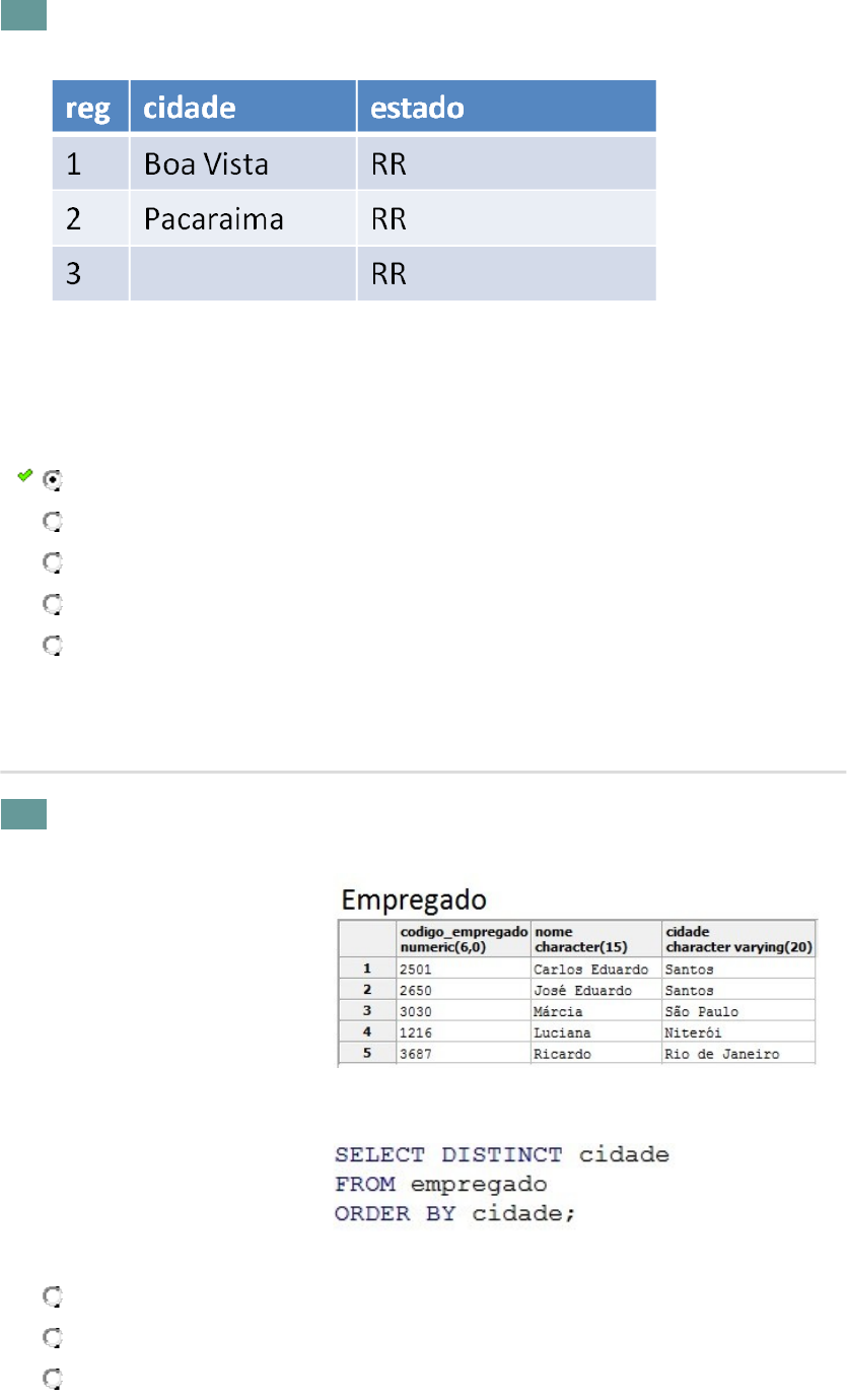 1. Considere a tabela a seguir: Qual a função a ser utilizada em um script SQL quando se desejar obter o número de cidades cadastradas? count(cidade) avg(reg) max(reg) count(*) sum(reg) 2. Observe a tabela empregado: Qual será o resultado se executarmos a consulta abaixo: São Paulo, Santos, Rio de Janeiro, Niterói São Paulo, Santos, Santos, Rio de Janeiro, Niterói Niterói, Rio de Janeiro, Santos Niterói, Rio de Janeiro, Santos, São Paulo Niterói, Rio de Janeiro, Santos, Santos, São Paulo 3. O gestor de um sistema de vendas solicita o preço médio dos produtos eletrônicos, que não está disponível na interface WEB do sistema. Para isso, que função SQL pode ser utilizada no SELECT para obter esse valor do banco de dados? AVG. VAR. MIN. MAX. VARP 4. O esquema de banco de dados apresentado abaixo faz parte de um banco de dados criado a partir de um conjunto de dados públicos de captura de tubarões entre os anos de 2001 e 2013 na costa da Austrália. Os dados podem ser baixados no endereço: https://data.qld.gov.au/dataset/shark-control-program-shark-catch-statistics/resource/5c6be990-3938-4125-8cca-dac0cd734263 Características do esquema: Chave primária sublinhada e chave estrangeira em itálico. Seguem algumas tabelas do Esquema: Tubarão (IDTubarão, IDEspécie, Comprimento, Sexo) Captura (NumCaptura, IDTubarão, IDLocal, Data, TempAgua) Local (IDLocal, CodArea, NomeLocal) Area (CodArea, NomeArea) Deseja-se saber qual a quantidade de locais que foram utilizados na captura de tubarões agrupados pelo nome de cada área. Assinale a alternativa que retorna corretamente esta consulta: SELECT NOMELOCAL, COUNT (CODAREA)"QTD DE LOCAIS" FROM AREA A, LOCAL L WHERE A.CODAREA = L.CODAREA GROUP BY NOMEAREA; SELECT NOMEAREA, COUNT (L.CODAREA)"QTD DE LOCAIS" FROM AREA A, LOCAL L WHERE A.CODAREA = L.CODAREA; SELECT NOMEAREA, COUNT (CODAREA)"QTD DE LOCAIS" FROM AREA, LOCAL GROUP BY NOMEAREA; SELECT NOMELOCAL, COUNT (L.CODAREA)"QTD DE LOCAIS" FROM AREA A, LOCAL L WHERE A.CODAREA = L.CODAREA GROUP BY NOMEAREA; SELECT NOMEAREA, COUNT (L.CODAREA)"QTD DE LOCAIS" FROM AREA A, LOCAL L WHERE A.CODAREA = L.CODAREA GROUP BY NOMEAREA; 5. Em uma instrução SQL, para manipular dados retornados de funções agregadoras, utiliza-se a cláusula SHOW ORDER BY UNIQUE OUT GROUP IN HAVING 6. Quando desejamos selecionar o maior e o menor valor de um atributo numérico usamos: MIN, MAX MAIOR, MENOR SUM AVG COUNT 7. 3,45 2,35 6 10 4,29 8. Acerca do conjunto de operações para manipulação de dados, marque a alternativa correta: DESC é obrigatoriamente necessário à cláusula ORDER BY quando se deseja ordenar decrescentemente O operador AND faz a checagem de valores zerados O operador LIKE é usado para operações com booleanos O operador IN pode ser usado para comparar valores na cláusula FROM O operador ALIAS é usado para renomear definitivamente colunas e tabelas