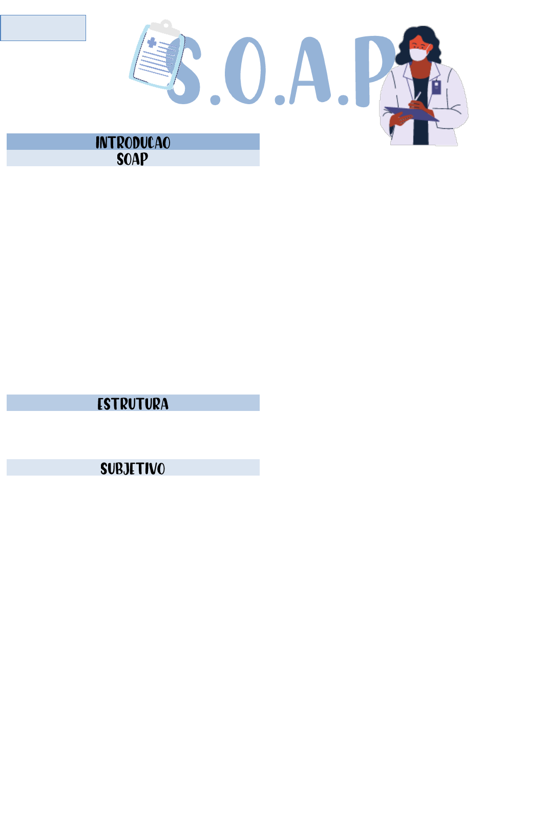 A nota Subjetivo, Objetivo, Avaliação e Plano (SOAP) é um acrônimo que representa um método amplamente usado de documentação para profissionais de saúde. A nota SOAP é uma forma de os profissionais de saúde documentarem de maneira estruturada e organizada. A nota SOAP ajuda a orientar os profissionais de saúde a usar seu raciocínio clínico para avaliar, diagnosticar e tratar um paciente com base nas informações fornecidas por eles. As notas SOAP são uma informação essencial sobre o estado de saúde do paciente, bem como um documento de comunicação entre os profissionais de saúde. A estrutura da documentação é uma lista de verificação que serve como um auxílio cognitivo e um índice potencial para recuperar informações para aprender com o registro. Os 4 títulos de uma nota SOAP são Subjetivo, Objetivo, Avaliação e Plano. Cada título é descrito abaixo. Este é o primeiro título da nota SOAP. A documentação sob este título vem de experiências “subjetivas”, opiniões pessoais ou sentimentos de um paciente ou de alguém próximo a ele. No ambiente de internação, as informações provisórias estão incluídas aqui. Esta seção fornece contexto para a Avaliação e Plano. RECLAMAÇÃO PRINCIPAL (CC) O CC ou problema apresentado é relatado pelo paciente. Pode ser um sintoma, condição, diagnóstico anterior ou outra declaração curta que descreva por que o paciente está se apresentando hoje. O CC é semelhante ao título de um artigo, permitindo ao leitor ter uma ideia do que o restante do documento implicará. Exemplos: dor no peito, diminuição do apetite, falta de ar. No entanto, um paciente pode ter vários CCs e sua primeira reclamação pode não ser a mais significativa. Portanto, os médicos devem encorajar os pacientes a expor todos os seus problemas, enquanto prestam atenção aos detalhes para descobrir o problema mais urgente. A identificação do problema principal deve ocorrer para realizar um diagnóstico eficaz e eficiente. HISTÓRIA DA DOENÇA ATUAL (HPI) O HPI começa com uma declaração de abertura simples de uma linha, incluindo a idade do paciente, sexo e motivo da visita. Exemplo: Mulher de 47 anos apresentando dor abdominal. Esta é a seção onde o paciente pode elaborar sua queixa principal. Um acrônimo frequentemente usado para organizar o HPI é denominado "OLDCARTS": Início: quando o CC começou? Localização: Onde está localizado o CC? Duração: Há quanto tempo o CC está acontecendo? Caracterização: Como o paciente descreve o CC? Fatores atenuantes e agravantes: o que torna o CC melhor? Pior? Radiação: o CC se move ou permanece em um local? Fator temporal: o CC está pior (ou melhor) em um determinado horário do dia? Gravidade: Usando uma escala de 1 a 10, sendo 1 o mínimo e 10 o pior, como o paciente avalia o CC? É importante que os médicos se concentrem na qualidade e clareza das anotações de seus pacientes, em vez de incluir detalhes excessivos. HISTÓRIA Histórico médico: Condições médicas atuais ou anteriores pertinentes História cirúrgica: tente incluir o ano da cirurgia e do cirurgião, se possível. História familiar: inclua a história familiar pertinente. Evite documentar o histórico médico de cada pessoa da família do paciente. História Social: Um acrônimo que pode ser usado aqui é HEADSS, que significa Casa e Ambiente; Educação, emprego, alimentação; Atividades; Drogas; Sexualidade; e Suicídio / Depressão. Célia Tássila REVISÃO DE SISTEMAS (ROS) Esta é uma lista de perguntas baseada em sistema que ajuda a descobrir sintomas não mencionados de outra forma pelo paciente. Geral: perda de peso, diminuição do apetite Gastrointestinal: dor abdominal, hematoquezia Músculo-esquelético: dor no dedo do pé, diminuição da amplitude de movimento do ombro direito MEDICAMENTOS ATUAIS, ALERGIAS Os medicamentos e alergias atuais podem ser listados nas seções Subjetivo ou Objetivo. No entanto, é importante que, com qualquer medicamento documentado, inclua o nome do medicamento, a dose, a via e a frequência. Exemplo: Motrin 600 mg por via oral a cada 4 a 6 horas por 5 dias Esta seção documenta os dados objetivos do encontro com o paciente. Isso inclui: Sinais vitais Achados do exame físico Dados de laboratório Resultados de imagem Outros dados de diagnóstico Reconhecimento e revisão da documentação de outros médicos. Um erro comum é distinguir entre sintomas e sinais. Os sintomas são a descrição subjetiva do paciente e devem ser documentados sob o título subjetivo, enquanto um sinal é um achado objetivo relacionado ao sintoma associado relatado pelo paciente. Um exemplo disso é um paciente que afirma ter “dor de estômago”, que é um sintoma documentado sob o título subjetivo. Versus “sensibilidade abdominal à palpação”, um sinal objetivo documentado sob o título objetivo. Esta seção documenta a síntese de evidências “subjetivas” e “objetivas” para chegar a um diagnóstico. É a avaliação do estado do paciente por meio da análise do problema, possível interação dos problemas e mudanças no estado dos problemas. Os elementos incluem o seguinte. PROBLEMA Liste a lista de problemas em ordem de importância. Um problema geralmente é conhecido como diagnóstico. DIAGNÓSTICO DIFERENCIAL Esta é uma lista dos diferentes diagnósticos possíveis, do mais provável ao menos provável, e o processo de pensamento por trás dessa lista. É aqui que o processo de tomada de decisão é explicado em profundidade. Deve estar incluída a possibilidade de outros diagnósticos que podem prejudicar o paciente, mas são menos prováveis. Exemplo: Problema 1, Diagnósticos Diferenciais, Discussão, Plano para o problema 1 (descrito no plano abaixo). Repita para problemas adicionais Esta seção detalha a necessidade de testes adicionais e consultas com outros médicos para tratar das doenças do paciente. Ele também aborda todas as etapas ad
