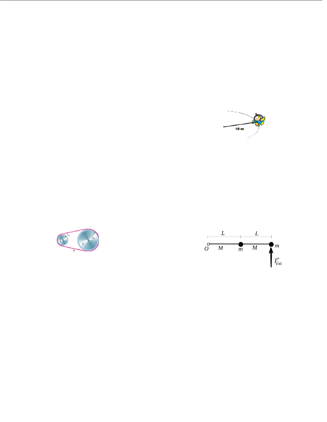 DEFIS - ICEB - UFOP 3a Lista de Exerćıcios Movimento rotacional, momento de inércia, momento angular e torque 1. Uma criança está empurrando um carrossel. O deslo- camento angular varia com o tempo de acordo com a relação θ(t) = γt + βt3, em que γ = 0, 4 rad/s e β = 0, 012 rad/s3. (a) Calcule a velocidade angular do carrossel em função do tempo. (b) Qual é o valor da velocidade angular inicial? 2. As lâminas de um ventilador giram com velocidade an- gular dada por ω(t) = γ − βt2, em que γ = 5 rad/s e β = 0, 8 rad/s3. (a) Calcule a aceleração angular em função do tempo. (b) Calcule a aceleração angular ins- tantânea para t=3 s e a aceleração angular média para o intervalo de tempo de t = 0 s a t = 3,0 s. 3. Uma roda gira com velocidade angular inicial ω0 e sofre uma aceleração angular dada por α(t) = 3At2 − 4Bt, sendo t a variável de tempo e A e B constantes positivas. Escreva as equações de (a) velocidade angular da roda e (b) deslocamento angular, em função do tempo para um inseto pousado nessa roda. 4. Uma roda de raio rA=10 cm está acoplada por uma cor- reia a uma roda de raio rC= 25 cm. A roda A au- menta sua velocidade a uma taxa constante de 1,6 rad/s2. Determine o tempo necessário, a partir do repouso, para que a roda C atinja uma velocidade rotacional de 100 rev/min. Suponha que não haja deslizamento na correia. 5. A posição angular de um ponto sobre a borda de uma roda em rotação é dada por θ(t) = 2 + 4t2 + 2t3, com θ em radianos e t em segundos. (a) No instante t=0, calcule a posição angular e a velocidade angular. b) No instante t = 4, 0, calcule a posição angular e a velocidade angular. (c) Calcule a velocidade média entre os instantes t =0 e t = 4. (d) Calcule a aceleração angular em t = 2, 0 e diga se a aceleração angular é constante. 6. As massas e as coordenadas (x, y) de quatro part́ıculas são as seguintes: 50 g , (2 cm, 2 cm); 25 g, (0 cm, 4 cm); 25 g , (-3 cm,-3 cm); 30 g (-2 cm, 4 cm). Qual é o momento de inércia deste conjunto em relação ao (a) eixo x; (b) eixo y e (c) eixo z? 7. Calcule o momento de inércia de uma roda que tem uma energia cinética de 24,4 kJ quando gira a uma velocidade de 602 voltas por minuto 8. Determine o momento de inércia de uma régua de um metro de comprimento e massa de 0,56 kg, em torno de um eixo perpendicular à régua e passando pela marca de 20 cm (Trate a régua como uma barra fina). 9. Cada uma das três lâminas da hélice de um helicóptero tem 5,20 m de comprimento e 240 kg de massa. O rotor gira a 350 rev/min.(a) Qual o momento de inércia I do conjunto em relação ao eixo de rotação? (cada lâmina pode ser considerada um bastão delgado). (b) Qual a energia cinética de rotação? 10. Um astronauta está sendo testado em uma centŕıfuga, que consiste de uma cabine, sustentada por uma haste ŕıgida, girante, de comprimento 10 m e massa despreźıvel. O conjunto cabine-homem tem massa igual a 120 kg e gira de acordo com θ = 0, 10t2, onde t é dado em segun- dos e θ em radianos. (a) Calcule o momento de inércia associado ao sistema, a velocidade angular em t = 5, 0 s e o momento angular em t = 5, 0 s. (b) Calcule o traba- lho realizado pelo motor da centŕıfuga nos primeiros 10 s, sabendo que, no instante inicial ela parte do repouso? 11. Duas part́ıculas de massa m estão unidas uma a outra e a um eixo de rotação por duas hastes, cada uma de comprimento L e massa M . (a) Obtenha uma expressão algébrica para a momento de inércia do conjunto em torno de O; (b) Calcule a força externa que deve ser aplicada na extremidade oposta a O para manter a barra em equiĺıbrio horizontal (não esqueça as forças peso) (c) Após essa força ser removida, o sistema começa girar. Calcule a aceleração e velocidade angulares do sistema quando a barra atinge a posição vertical (em relação ao solo). 12. Um gato (2m) dorme em uma tábua (m) de comprimento L presa por dois barbantes nas extremidades. O gato esta em uma posição de 3/4L. (a) Calcule a tração em cada barbante. (aproxime o gato a um ponto) O gato então so- nha que está andando sobre a tabua e no instante que ele atinge uma das extremidades o barbante daquela extremi- dade arrebenta. A tabua tende a gira presa na outra ex- tremidade e o gatinho consegue se manter agarrado. (b) Qual é a aceleração angular que o gato sente exatamente no instante que a corda arrebenta. ICM = mL2/12 para uma tábua de comprimento L girando com eixo no CM . (obs: O gato acordou assustado, mas não se feriu... não desta vez!!) 13. Uma pessoa faz uma bola de tênis presa por um fio percor- rer um ćırculo horizontal (de modo que o eixo de rotação seja vertical). Em um determinado momento (indicado na figura) a bola recebe um forte impulso vertical para baixo. Em que sentido o eixo de rotação sofre inclinação após o impulso? 14. Qual é o torque em relação à origem sobre a part́ıcula localizada em x=1,5 m, y=-2,0 m e z=1,6 m devido à força F = (3, 5̂ı − 2, 4̂ + 4, 3k̂) N? 1 DEFIS - ICEB - UFOP 15. Uma part��cula est�a localizada emr = 0 ; 54̂� � 0; 36̂� + 0; 85̂k) m. Uma forc�a constante de intensidade 2,6 N atua sobre a part��cula. Encontre as componentes do torque em relac�~ao �a origem quando a forc�a atua no (a) sentido positivo dex e no (b) sentido negativo dez. 16. Voĉe est�a usando uma chave de boca para tentar despren- der uma porca enferrujada. Quais das con�gurac�~oes mos- tradas abaixo�e a mais efetiva para realizar esta tarefa? Liste as seguintes con�gurac�~oes em ordem decrescente de e�ci ência. 17. Calcule o torque (intensidade, direc�~ao e sentido) em torno de um ponto O devido �a forc�a F em cada uma das situac�~oes esquematizadas abaixo. Considere o compri- mento da haste igual a 4 m e a intensidade da forc�a igual a 10 N. 18. Tr̂es forc�as est~ao aplicadas em um cilindro que pode gi- rar em torno de um eixo �xo p