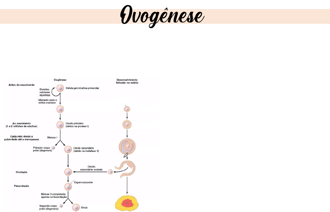 Formação do óvulo Inicia-se no período intra uterino por ação dos hormônios maternos • Células da linhagem germinativa pertencem ao folículo ovariano • Folículo ovariano: célula da linhagem germinativa envolvidos por células foliculares • Ocorre no ovário O processo de Ovogênese ou Oogênese, inicia-se por uma célula germinativa primordial, que realiza divisões celulares e migra para o Córtex Ovariano. Córtex, região periférica de um órgão • No córtex ovariano essa célula germinativa é chamada de ovogônia (2n:46) (célula germinativa) • Fase de multiplicação da Gametogênese feminina (a Ovogônia realiza mitoses e aumenta o seu volume citoplasmático) • A ovogônia aumenta seu volume citoplasmático e vai ao Ovócito Primário (2n:46) (fase de crescimento) – dura meses (de Ovogônia para Ovócito 1ªário não há divisões celulares) Esse Ovócito 1ªário inicia a meiose 1 (maturação da gametogênese) Para a processo de meiose1 na Prófase 1 • Ocorre o nascimento da criança (menina) – A Menina nasce com o Ovócito 1ªario • Até a Puberdade o Ovócito 1ªário fica estagnado em Prófase 1 • Após a 1ª menstruação até a menopausa tem-se o Ovócito 1ªário, estagnado em prófase 1, terminando a Meiose 1 (reducional) e resultando na formação de duas células 1 chamada de corpo ou glóbulo polar (n:23) (degenera) e outra chamada de ovócito 2ªário (n:23) O corpo polar recebe praticamente DNA Todo o volume citoplasmático do Ovócito 1ªário vai para o Ovócito 2ªário • Além de ser uma divisão reducional é também uma divisão desigual, a nível de volume citoplasmático • O Ovócito 2ªário inicia a Meiose 2 e interrompe na Metáfase2 • Ovulação: Liberação de Ovócito 2ºário estagnado em Metáfase 2 Se a mulher nunca engravidar ela pode Nunca terminar sua Gametogênese, pois para a gametogênese da Mulher, que iniciou no período intra uterino terminar, necessita haver fecundação • Quando ocorre o processo de fecundação com a entrada do espermatozoide completa-se a Meiose 2 (Equacional) • Forma-se um segundo corpo polar (n:23) que degenera, e um Óvulo (n:23) –/ ocorre a fusão do núcleo do espermatozoide e do Ovócito • Após a Fusão dos núcleos tem-se a formação do zigoto ou célula ovo • Essas células da Linhagem Germinativa são envolvidas por células foliculares O Folículo Ovariano é um ovócito + células foliculares Folículo 1ªário multi laminar (Ovócito 1ªário com várias camadas de células foliculares) • Folículo 2ªário • Folículo Maduro (Folículo Pré Ovulatório) Fase de maturação se baseia em Meiose 1 e 2. • Devido a uma alteração hormonal, esse Folículo Pré Ovulatório (ou Folículo de Graaf) se rompe e libera o gameta feminino (Ovócito secundário Estagnado em Meiose 2) • Folículo de graaf (termina a Meiose 1 e inicia a Meiose 2) • O gameta feminino liberado é Ovócito 2ªário estagnado em Meiose 2, envolvido por 2 camadas (Zona Pelúcida e Corona ou Coroa Radiada) • Zona Pelúcida (glicoproteínas) mais interna • Corona Radiada formada por células foliculares provenientes do folículo de Graaf que se rompeu A diferença entre os gametas: • Tamanho Para o espermatozoide concluir a fecundação: • Passagem pela corona radiada • Acrossoma libere uma enzima chama de Hialuronidase (digere o ácido hialurônico presente entre as células foliculares) • Movimento Flagelar Passagem pela zona Pelúcida • Reação acrossômica (interação de receptores ZP3 com os ZP3) O receptor ZP3 encontra-se no espermatozoide E o ZP3 é uma proteína que se encontra na Zona Pelúcida • ZP3/ receptor Zp3 (garante a liberação de uma série de enzimas para digerir a zona pelúcida e garantir a passagem do espermatozoide) • Acrosina* • Neuraminidase • Esterase • A zona pelúcida é composta por 3 glicoproteínas: ZPA, ZPB, ZPC. Agora ocorre o impedimento da entrada de outro espermatozoide, a partir da reação de zona (cortical) – quando vesículas na região cortical do ovócito acabam se fusionando com a membrana do ovócito e liberando substâncias que conseguem impedir a entrada de outro espermatozoide nesse ovócito • Garantem a modificação de ZP3 / enrijecimento da Zona Pelúcida • Fusão das membranas (do ovócito 2ªário estagnado em metáfase 2 e do espermatozoide) • Término da Meiose 2 • Óvulo (n:23) • Fusão dos Pró-Núcleos (cariogamia) • Formação do Zigoto (célula ovo) (2n:46) • Interação do ZP3 espécie e específico • Depois da fusão das membranas, ocorre o aumento do íon Cálcio intracelular (promove a reação de zona) • Ao final o núcleo do espermatozoide é o mais importante