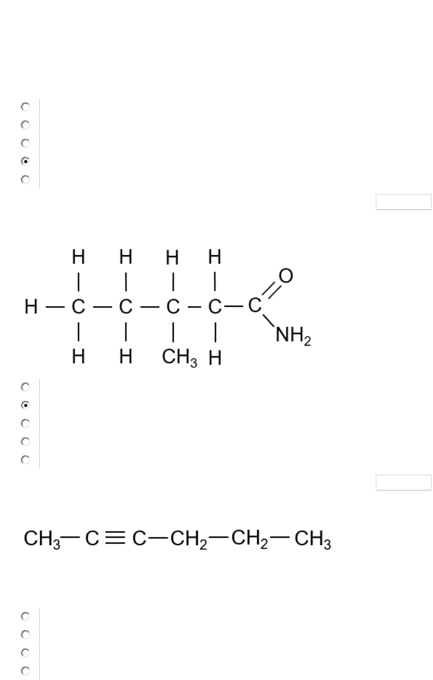 PERG UNTA 1 1. Analise as seguintes assertivas quanto à veracidade – V para VERDADEIRO, ou F para FALSO: A ligação pi (π) está presente em moléculas nas quais existem ligações covalentes simples entre os átomos. Se existe apenas uma ligação entre dois átomos de uma molécula, esta ligação é pi (π). Se há uma ligação dupla entre dois átomos da molécula, uma será sigma (σ) e a outra, pi (π). As assertivas I, II, III e IV são, RESPECTIVAMENTE: a. V, V, F b. F, F, F. c. V, F, V. d. F, F, V. e. F, V, V. 0,15 pontos PERG UNTA 2 1. Quantos carbonos terciários existem na estrutura do composto orgânico abaixo? a. 5. b. 1. c. 3. d. 4. e. 2. 0,15 pontos PERG UNTA 3 1. A estrutura a seguir representa o hex-2-ino. O hex-2-ino apresenta quantos carbonos com hibridização do tipo sp? a. 5. b. 4. c. 1. d. 3. e. 2. 0,15 pontos PERG UNTA 4 1. Observe a cadeia carbônica abaixo. Esta cadeia carbônica pode ser classificada como: a. Alifática e saturada. b. Saturada e homogênea. c. Normal e insaturada. d. Ramificada e heterogênea. e. Cíclica e heterogênea.