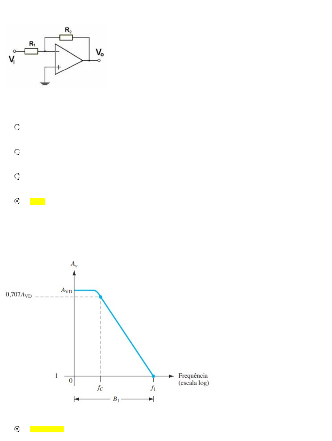 Se o circuito da figura abaixo tiver R1 = 100 kΩ e R2 = 500 kΩ, qual a tensão de saída resultante para uma entrada de Vin = 2V? 2,4 V 12 V -8 V -10 V Determine a frequencia de corte (Fc) de um amp-op que possui uma largura de banda (B1) de 10MHz e uma ganho de tensão diferencial (Avd) de 150V/mV. Fc = 66,67 Hz Calcule a tensão de saída e o ganho para o circuito da figura abaixo com uma entrada Vi = 3,5 mV (rms) e as seguintes resistências: R1 = 3,6 kΩ R2 = 180 kΩ Vo = -175 mV, A = 50 Calcule a tensão de saída e o ganho para o circuito da figura abaixo com uma entrada Vi = 150 mV (rms) e as seguintes resistências: R1 = 36 kΩ R2 = 750 kΩ Vo = 3,275 µV, A = 0,2183 Vo = 3,275 V, A = 21,83 Dados IDSS = 6 mA e VP = -4,5 V. Determine VGS em ID = 3 mA e 5,5 mA 2,250 V; 0,375 V 1,318 V; 0,192 V -2,250 V; -0,375 V -1,318 V; 0,375 V -1,318 V; -0,192 V Um transístor unipolar (FET) depende: de nenhum deles. da condução de elétrons (n) ou de lacunas (p). Que potência máxima um transistor de silício (TJmáx = 200 °C) pode dissipar ao ar livre a uma temperatura ambiente de 80 °C? PD = 3 W Determine a dissipação máxima permitida para um transistor de silício de 100 W (a 25 °C) para um fator de delimitação de 0,6 W/°C a uma temperatura do encapsulamento de 150 °C. 25 W Um oscilador de deslocamento de fase com FET apresentando resistor de realimentação R = 10kΩ deve operar em 2,5 kHz. Selecione C para a operação especificada do oscilador. 2,6 nF Calcule o ganho e as impedâncias de entrada e de saída de um amplificador com realimentação-série de tensão com A = -300, Zi = 1,5 kΩ, Zo = 50 kΩ e β = -1/15. 14,3; 2,4 kΩ e 31,5 kΩ -15,8; 2,4 kΩ e 31,5 kΩ 15,8; 2,4 kΩ e 31,5 kΩ -15,8; 31,5 kΩ e 2,4 kΩ -14,3; 31,5 kΩ e 2,4 kΩ Qual é a tensão de ondulação rms de um retificador de onda completa com tensão de saída de 8 VCC? 11,61 V 9,69 V 7,74 V 3,23 V 3,87 V Um estágio RC é adicionado em uma fonte após o capacitor de filtragem para que a ondulação seja reduzida para 2%. Calcule a tensão de ondulação na saída do filtro RC que fornece uma tensão de 80 VCC. 16 V 1,6 V Um A.O. single supply alimentado com +3.3V, referência em +1.650V e 0V recebe um sinal senoidal de entrada de y(x) = sen(wt) + 1.650 [V]. Ganho = 20 e Tensão de Saturação (Vsat = 90% de Vcc). Qual o valor do sinal de saída? Escolha a alternativa correta. +2Vdc Nenhuma das anteriores Que tensão de saída resulta no circuito da figura abaixo para uma entrada V1 = -0,3 V? 9,3 V 8,0 V -9,3 V